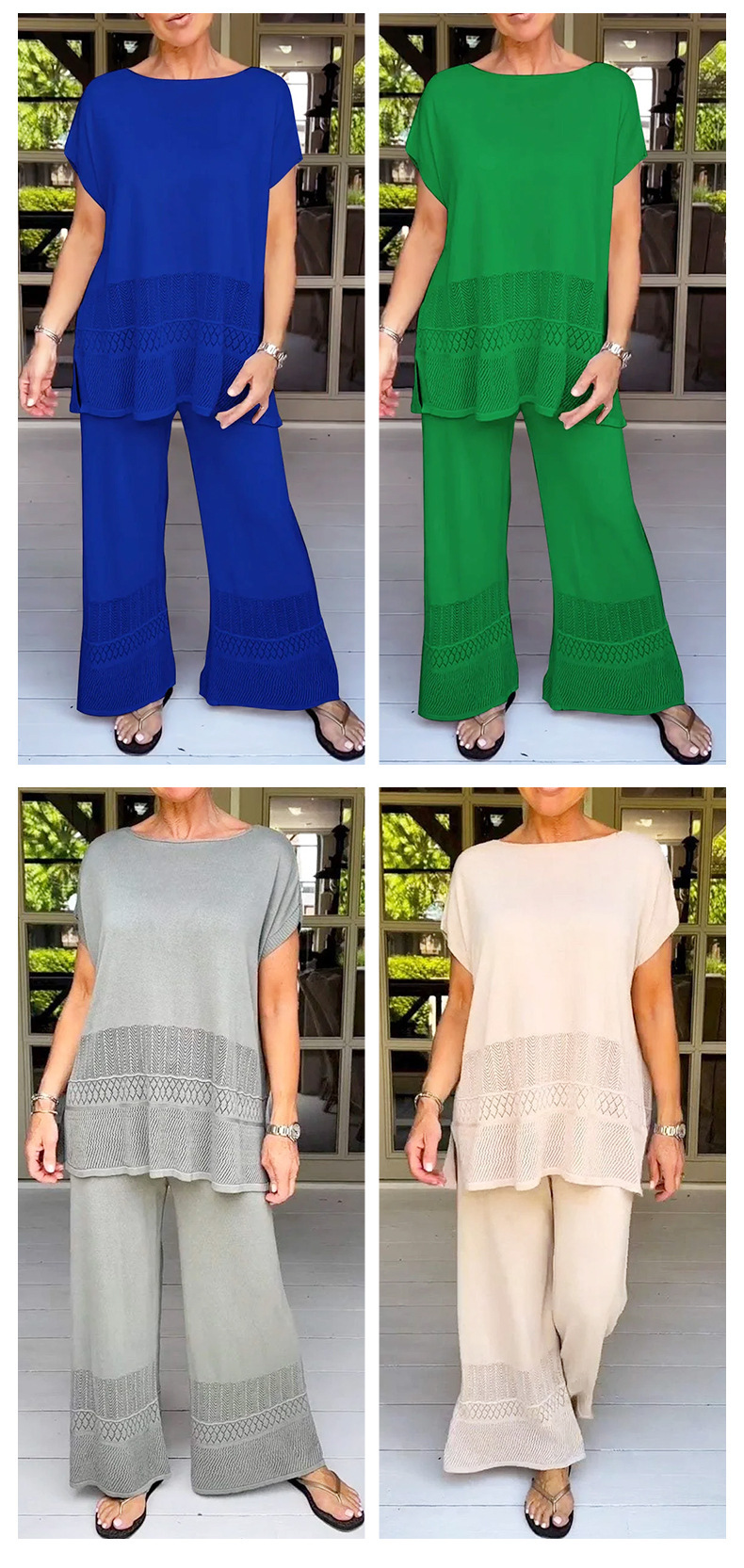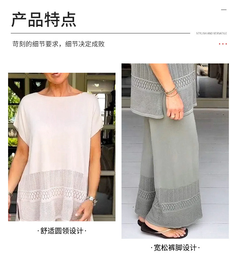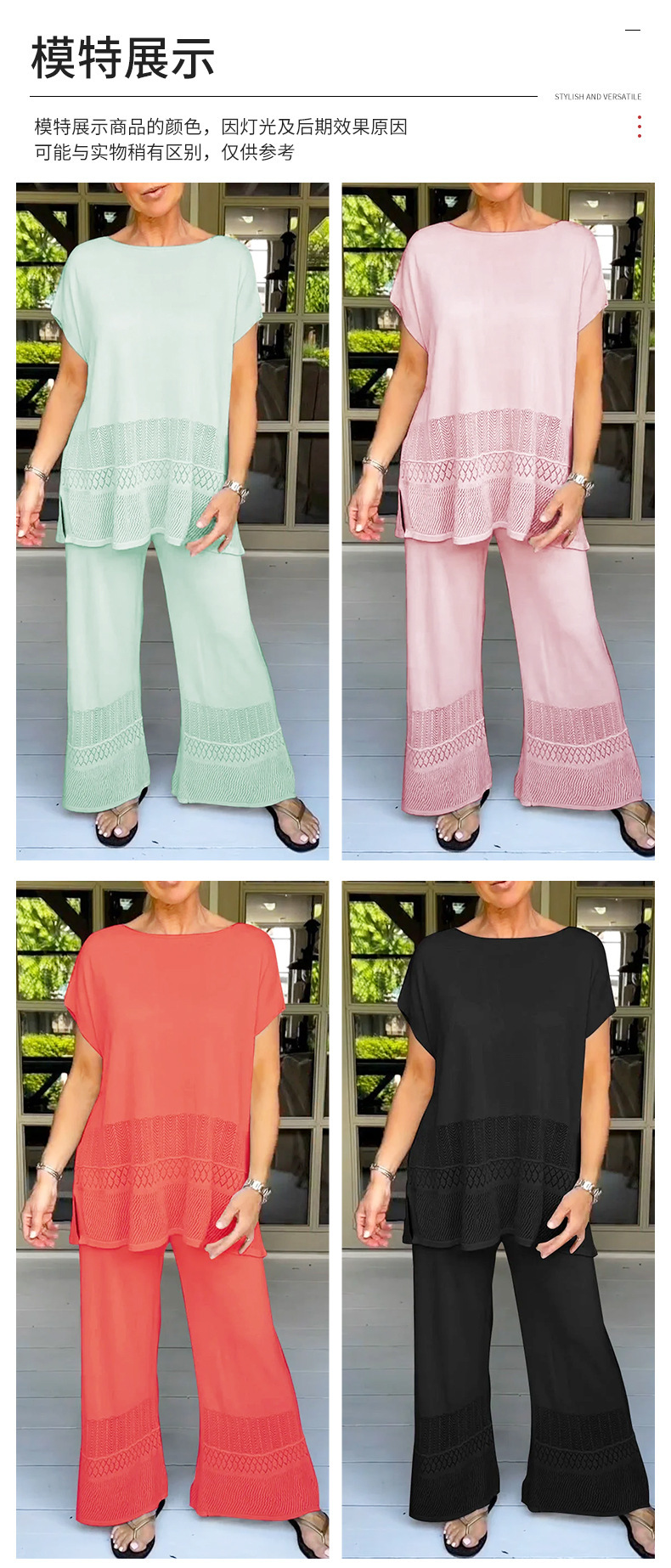 뜨거운 판매 아마존 두 조각 세트 여성 캐주얼 패션 세트 속이 빈 탑 느슨한 탄성 탄성 허리 바지