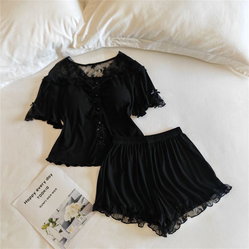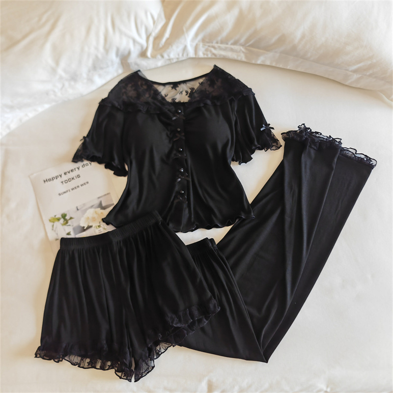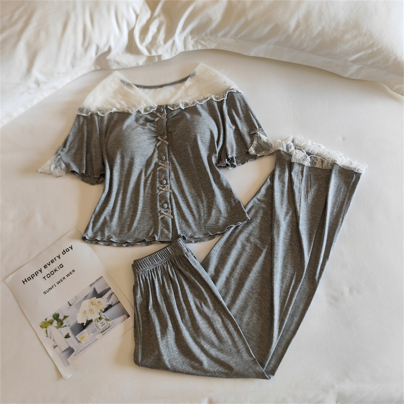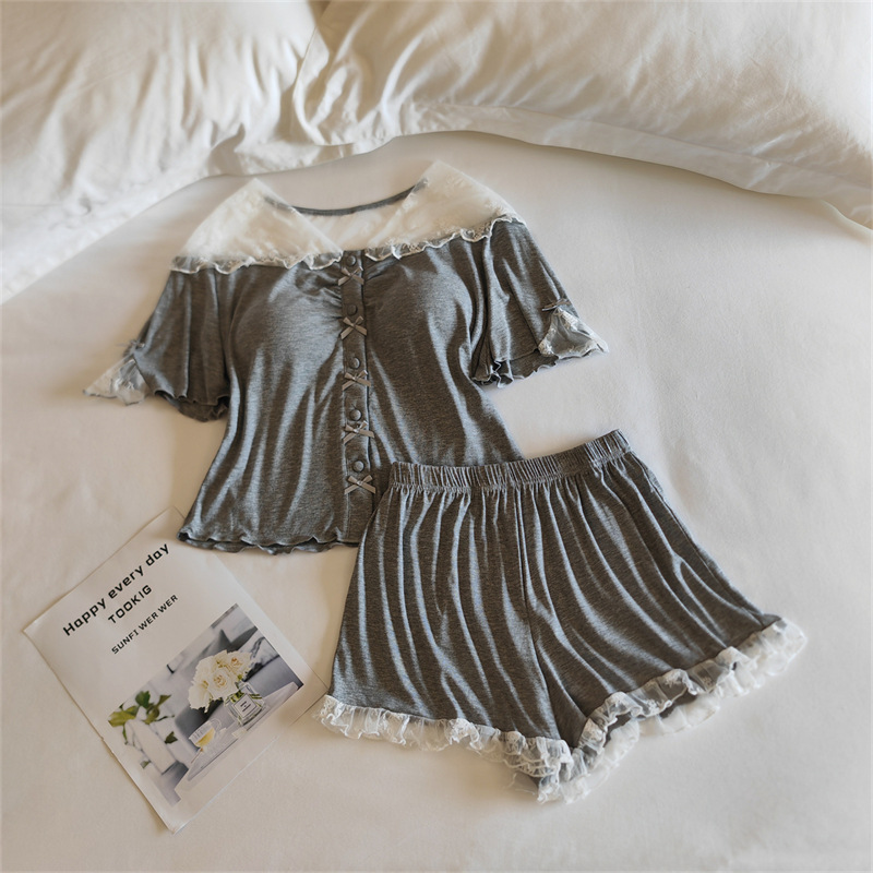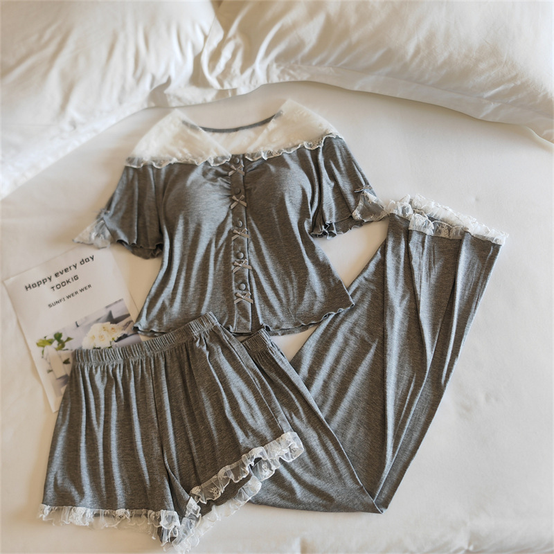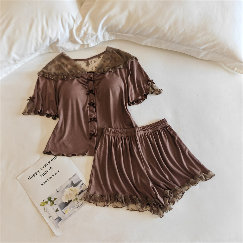 여성용 모달 잠옷 봄 여름 반팔 가디건 투피스 얇은 인터넷 연예인 스타일 가슴 패드가있는 고급 홈웨어스토어 가기