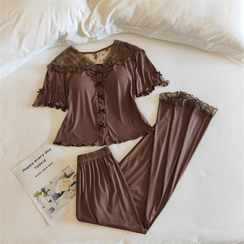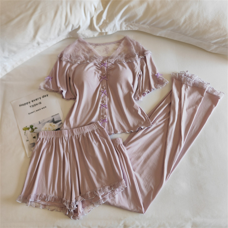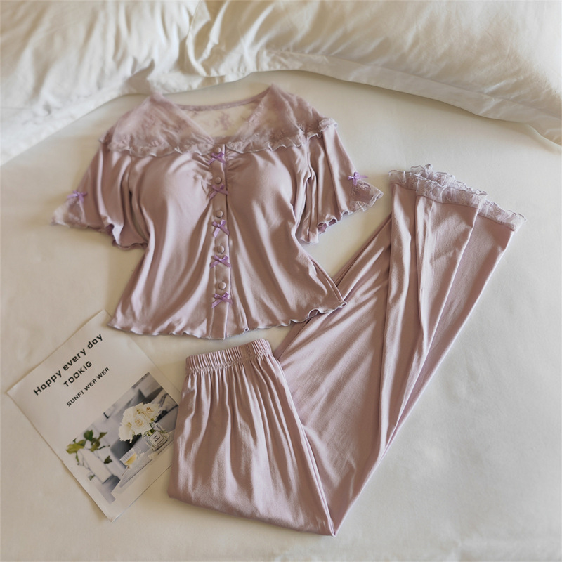 여성용 모달 잠옷 봄 여름 반팔 가디건 투피스 얇은 인터넷 연예인 스타일 가슴 패드가있는 고급 홈웨어