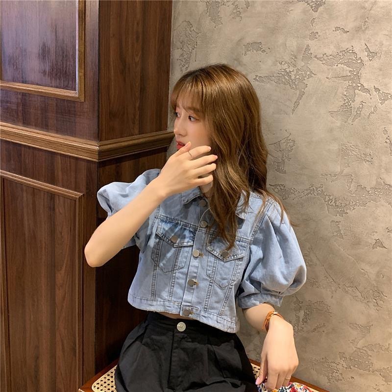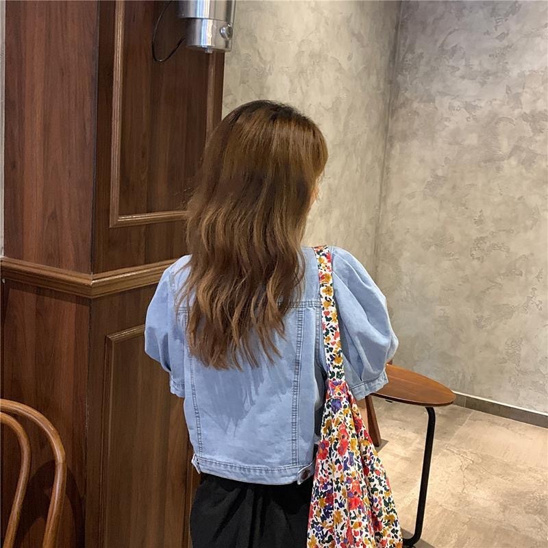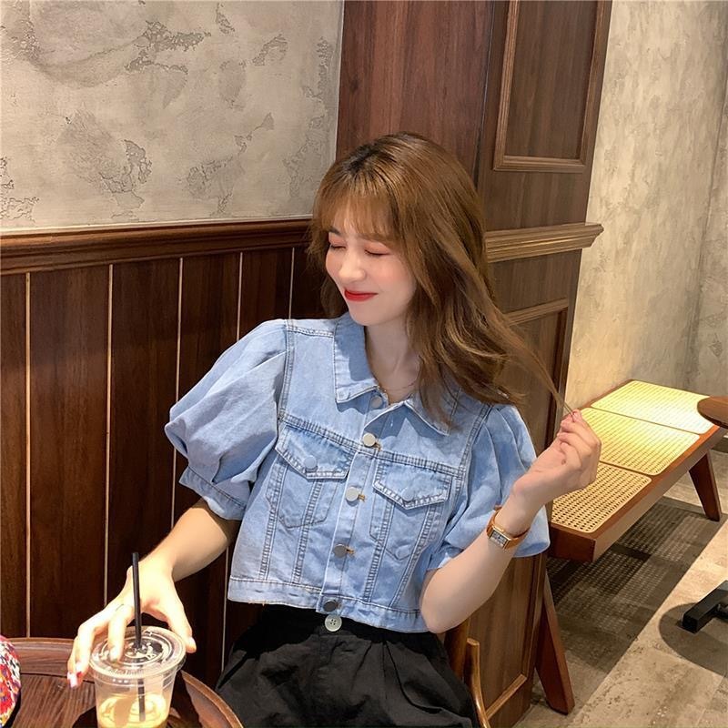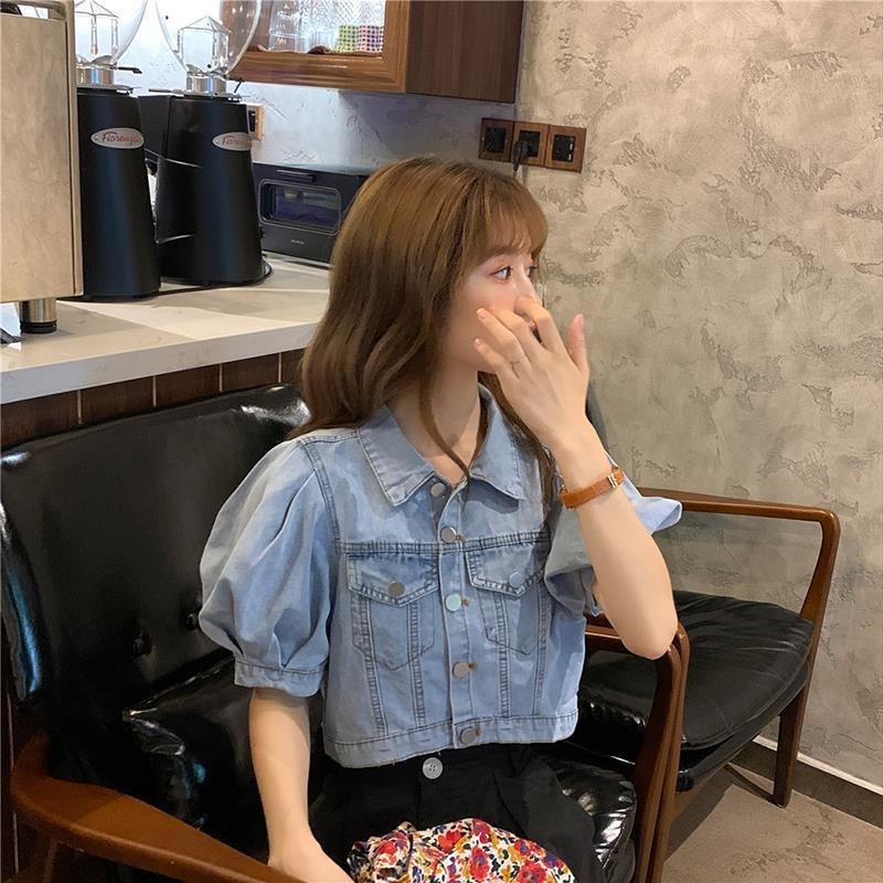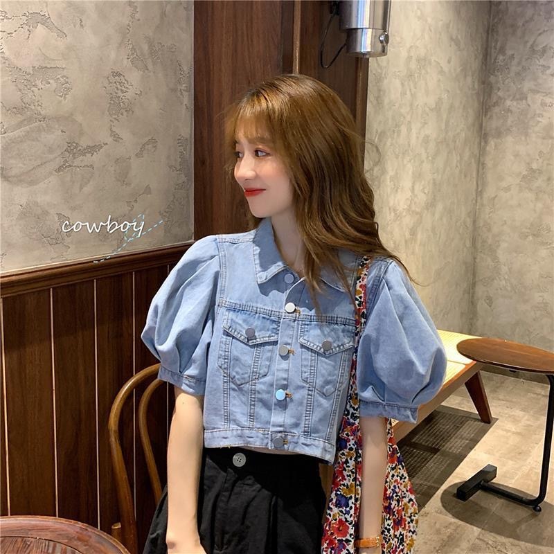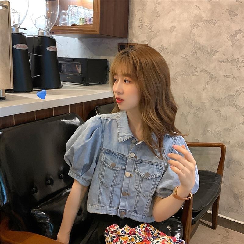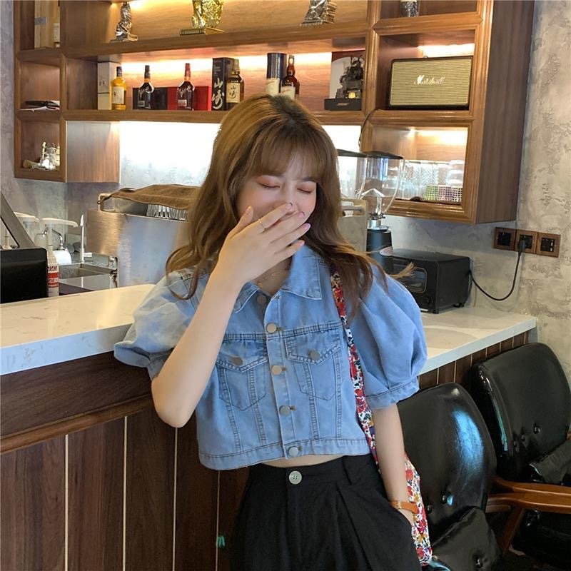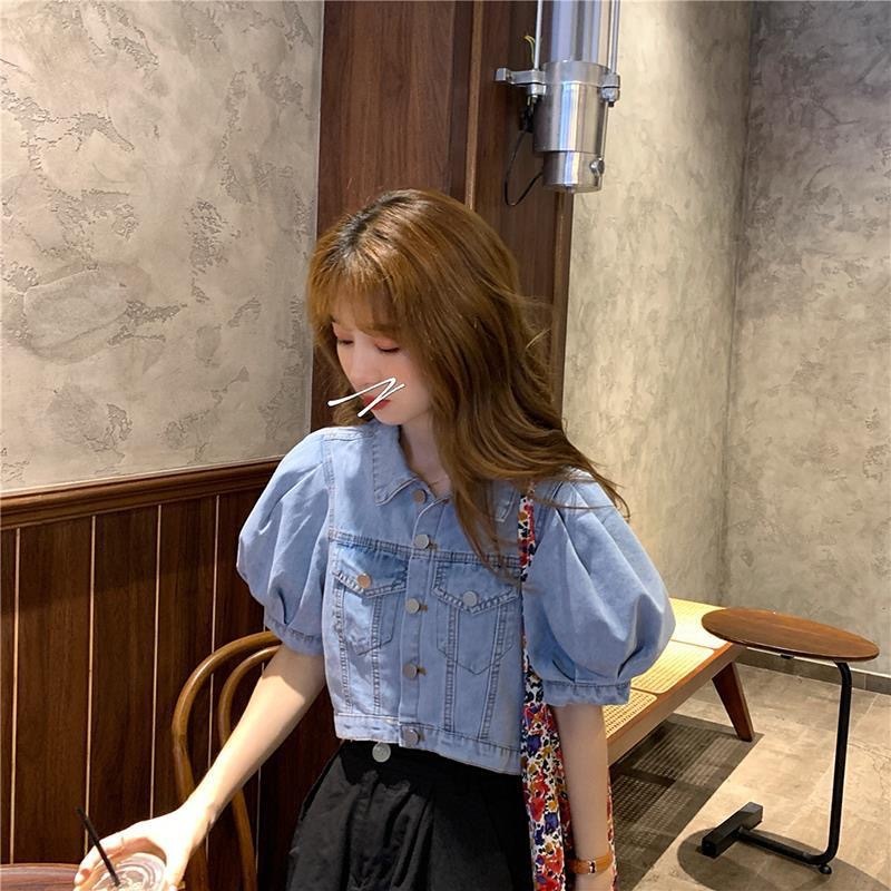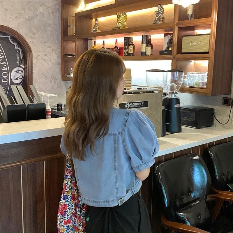 데님 짧은 코트 여성의 여름 퍼프 슬리브 2024 새로운 얇은 느슨한 한국 스타일 우아한 봄과 가을 탑 트렌디스토어 가기
