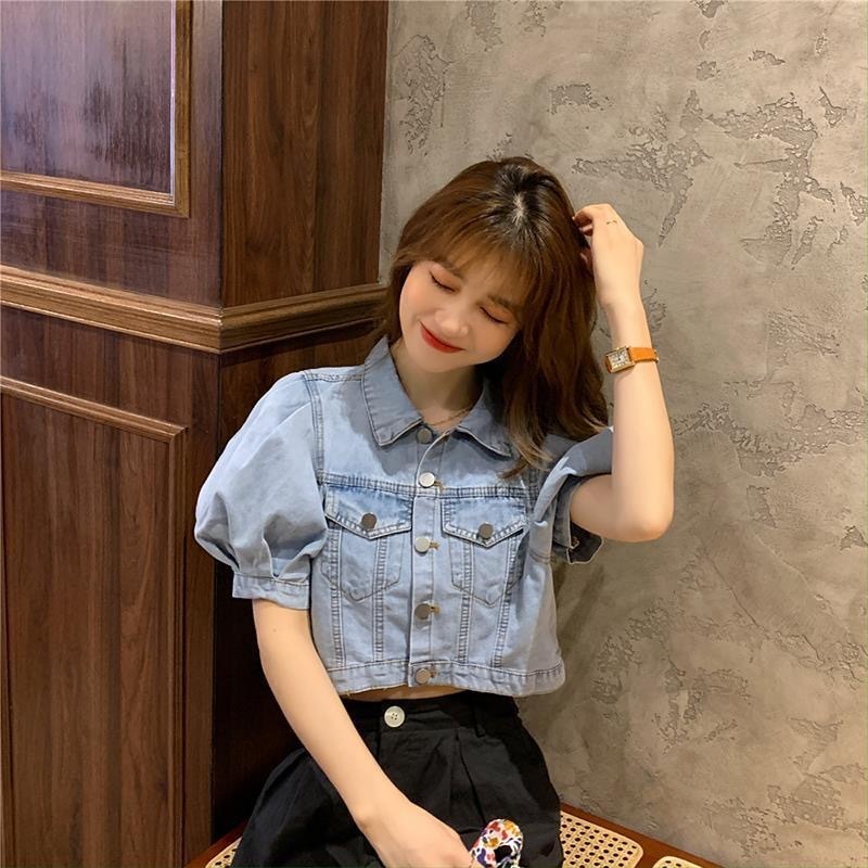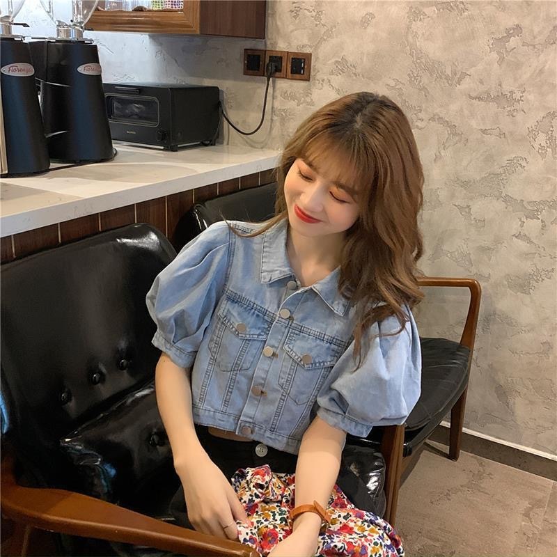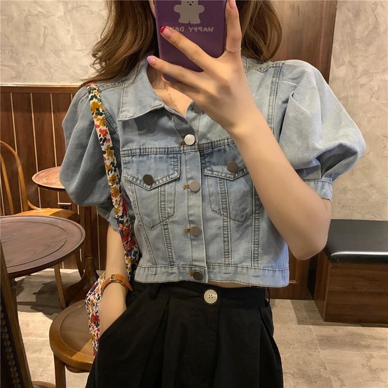 데님 짧은 코트 여성의 여름 퍼프 슬리브 2024 새로운 얇은 느슨한 한국 스타일 우아한 봄과 가을 탑 트렌디