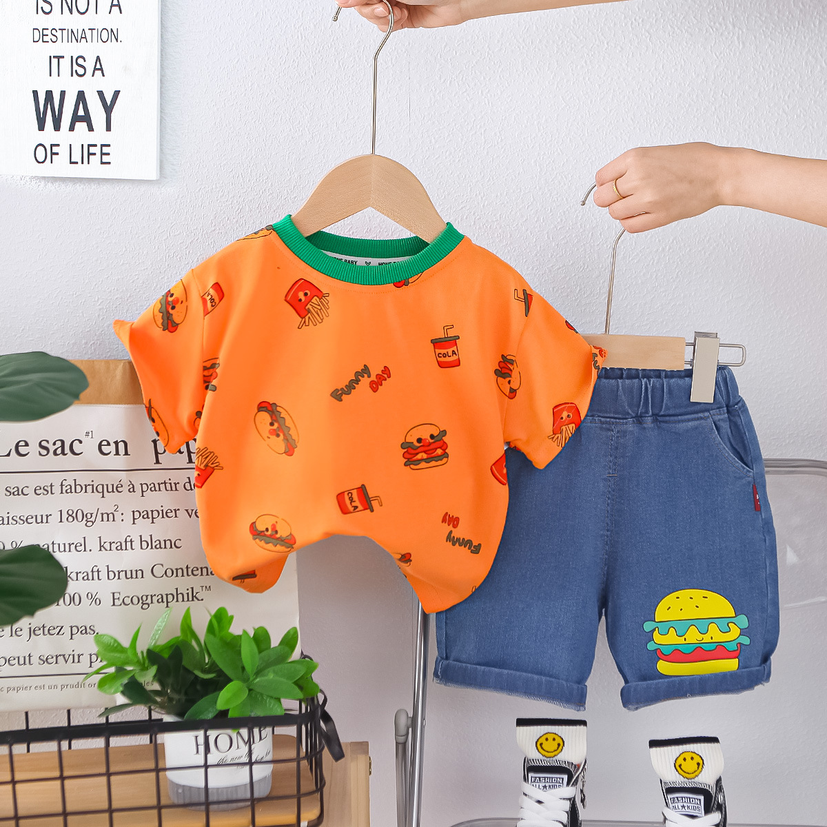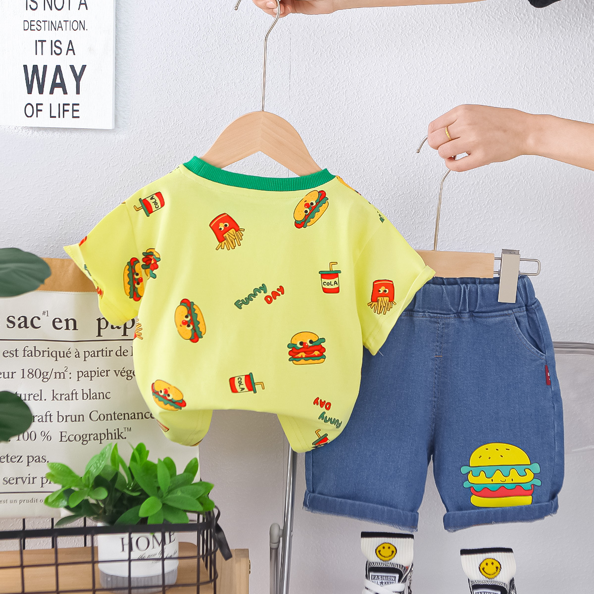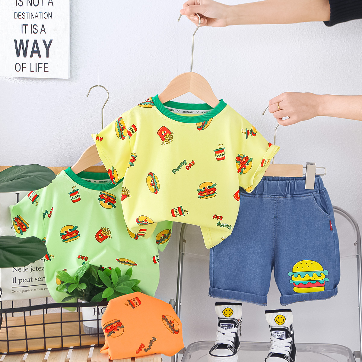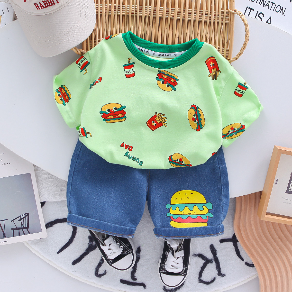 소년 여름 정장 반팔 어린이 여름 소년 아기 여름 옷 만화 라운드 넥 반팔 투피스 세트