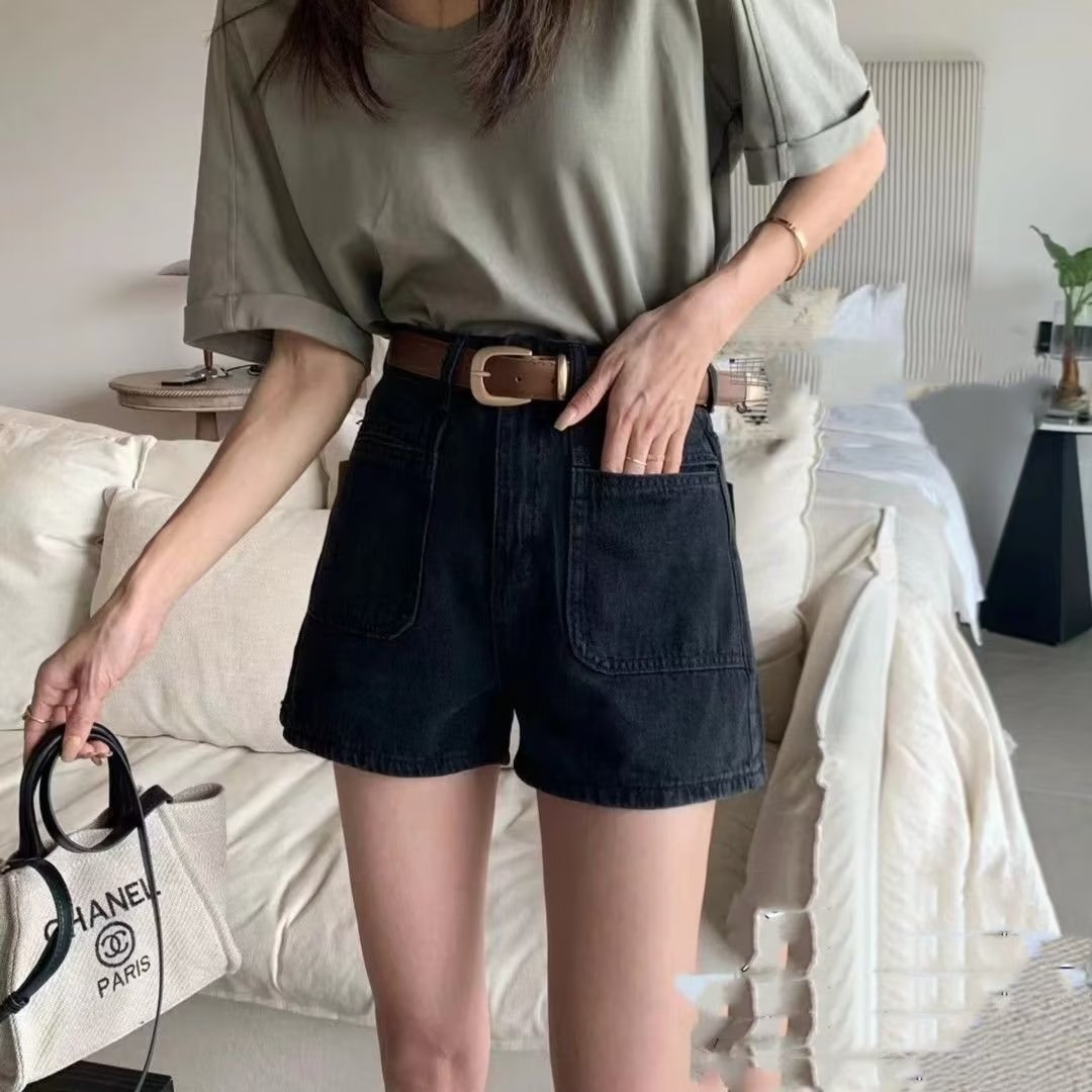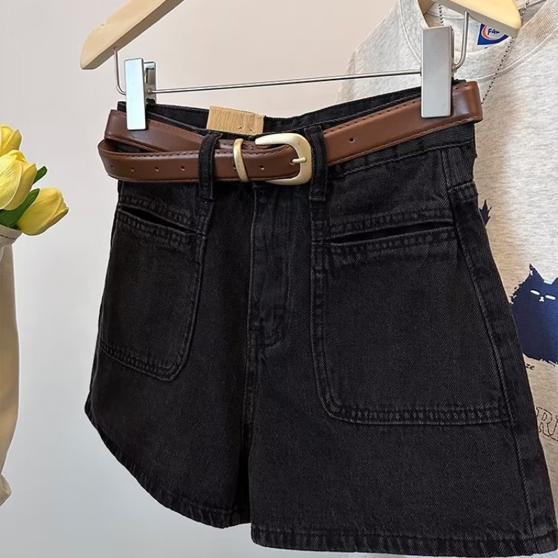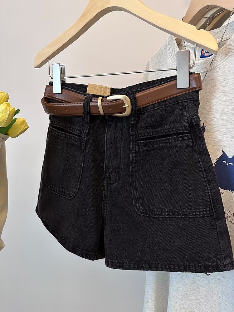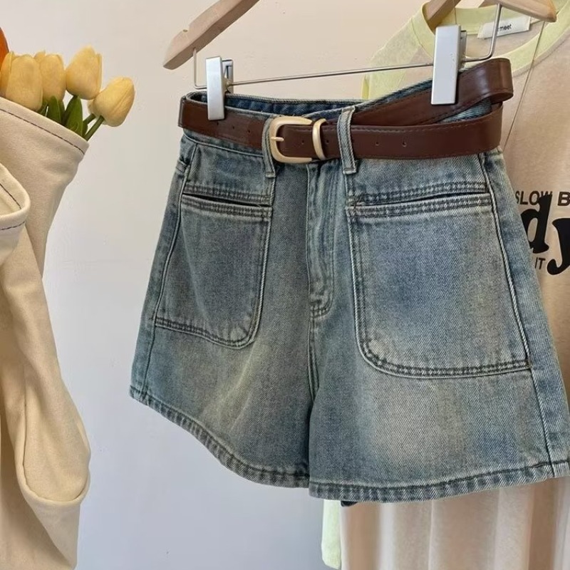牛仔短裤女2024夏季新款简约高腰口袋a字显瘦百搭阔腿腰带热裤子스토어 가기