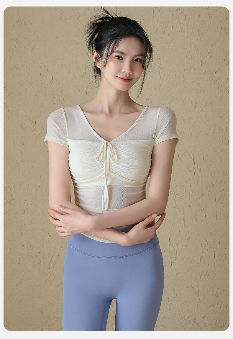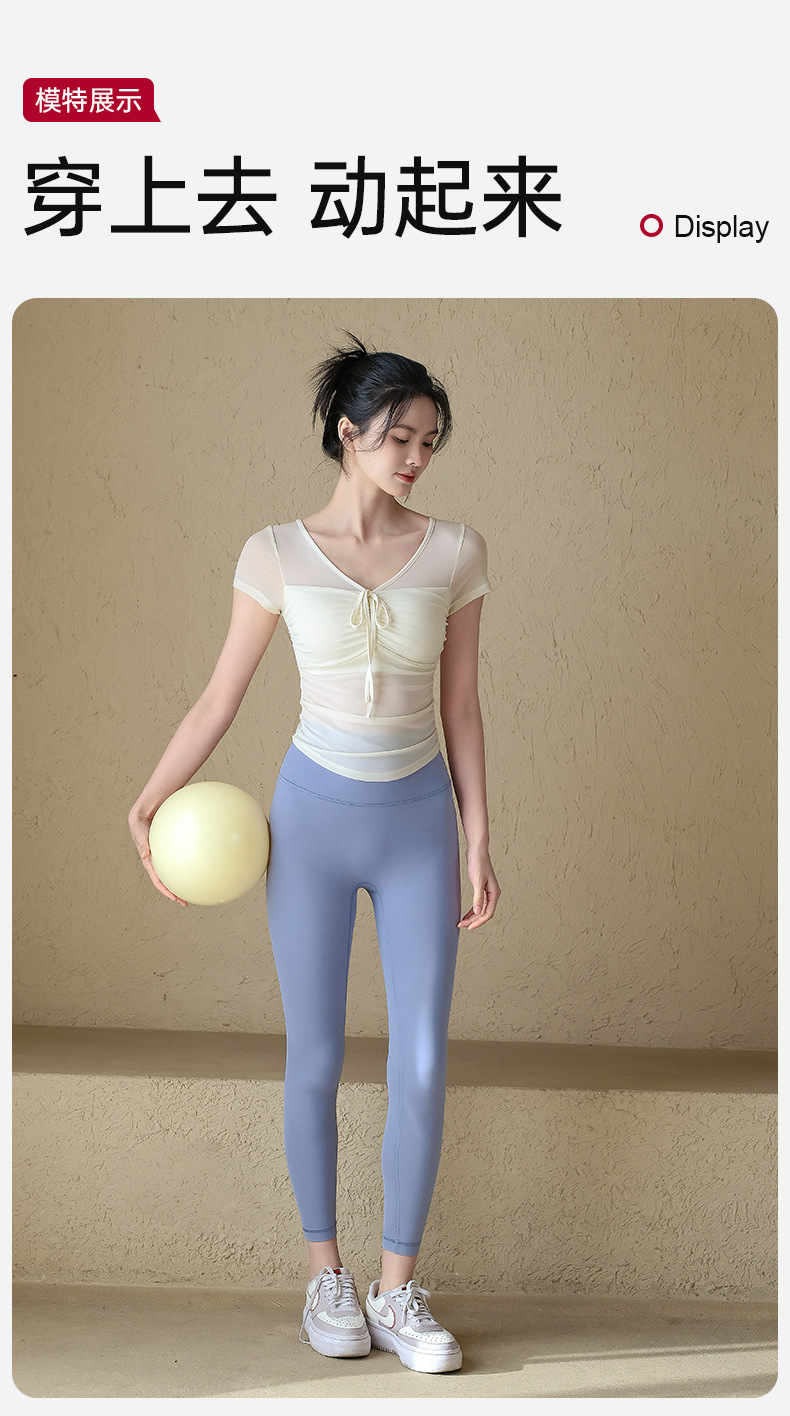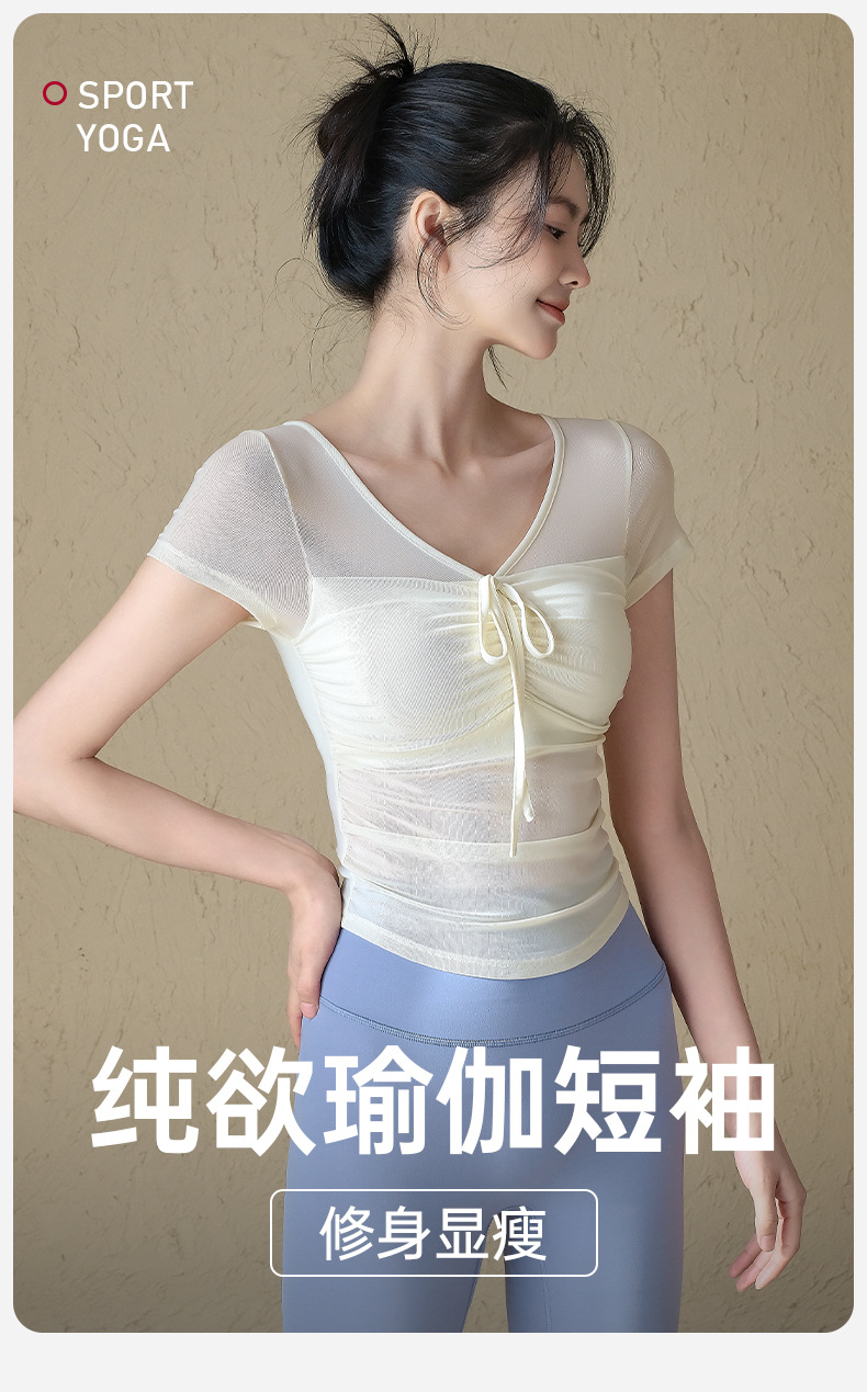 순수한 스파이스 소녀 슬림 핏 요가 세트 반팔 여성 여름 새로운 마이크로 투명 메쉬 거즈 (가슴 패드 스포츠 쇼트 탑)스토어 가기