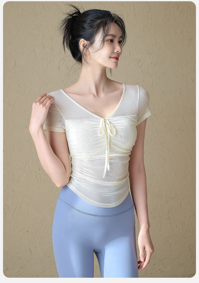순수한 스파이스 소녀 슬림 핏 요가 세트 반팔 여성 여름 새로운 마이크로 투명 메쉬 거즈 (가슴 패드 스포츠 쇼트 탑)