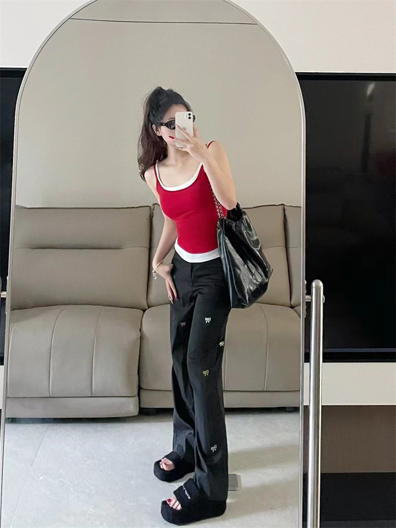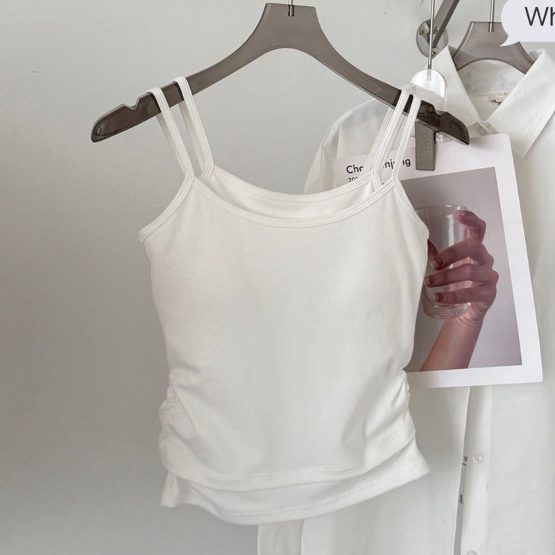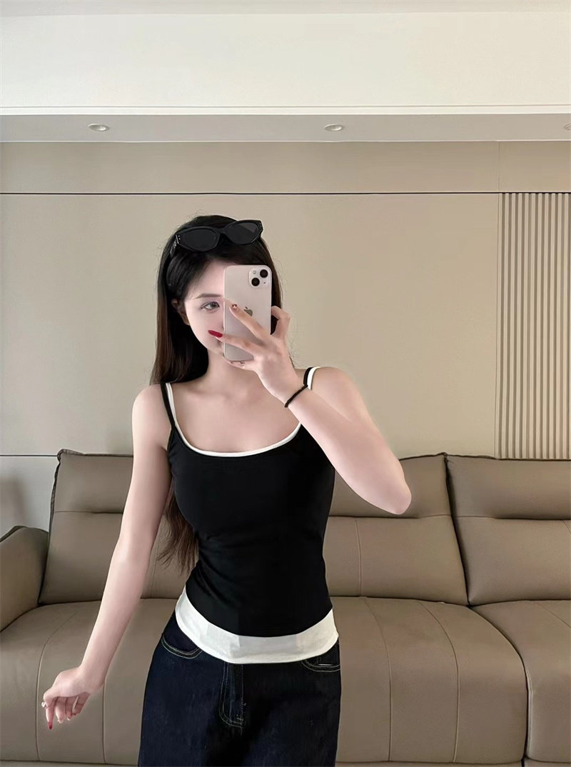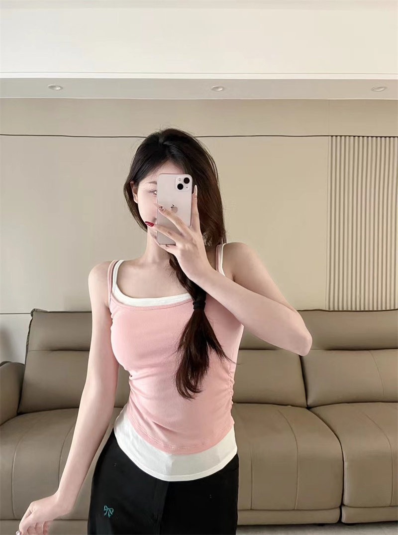 여름 새로운 스파이스 소녀 가짜 투피스 콘트라스트 컬러 스티칭 접힌 벨트 가슴 패드 모든 경기 슬림 핏 스포츠 민소매 탑