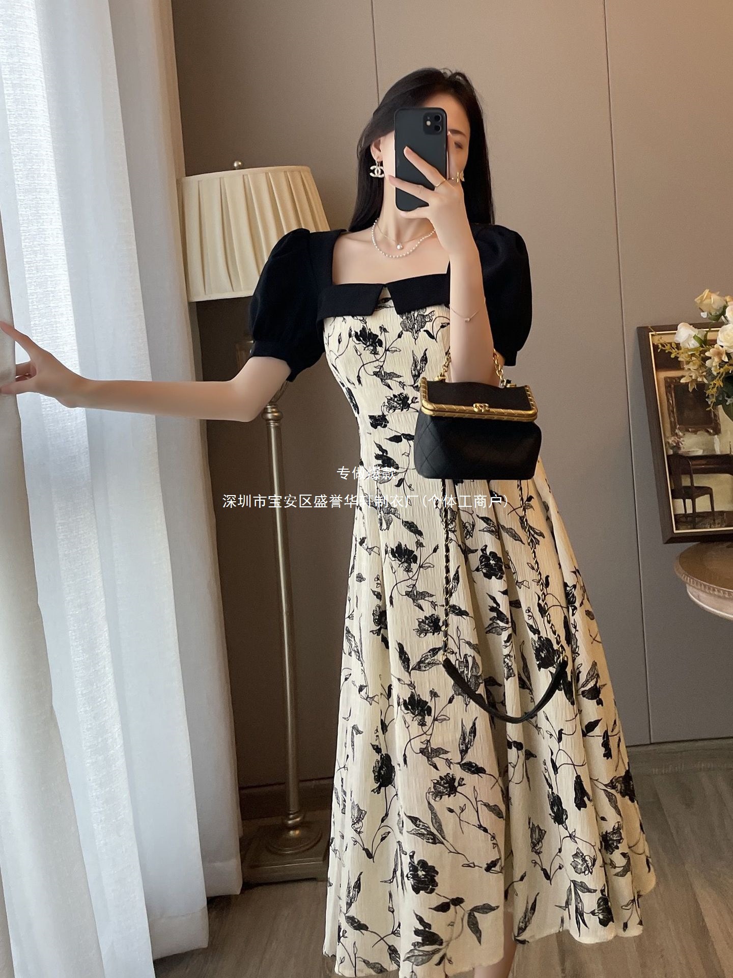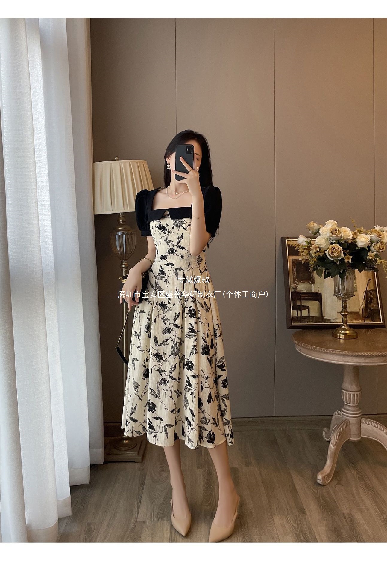 순수한 욕망 스타일 디자인 센스 슬림 스티칭 꽃 원피스 여성 여름 2023 새로운 스퀘어 칼라 퍼프 슬리브 A 자형 원피스스토어 가기