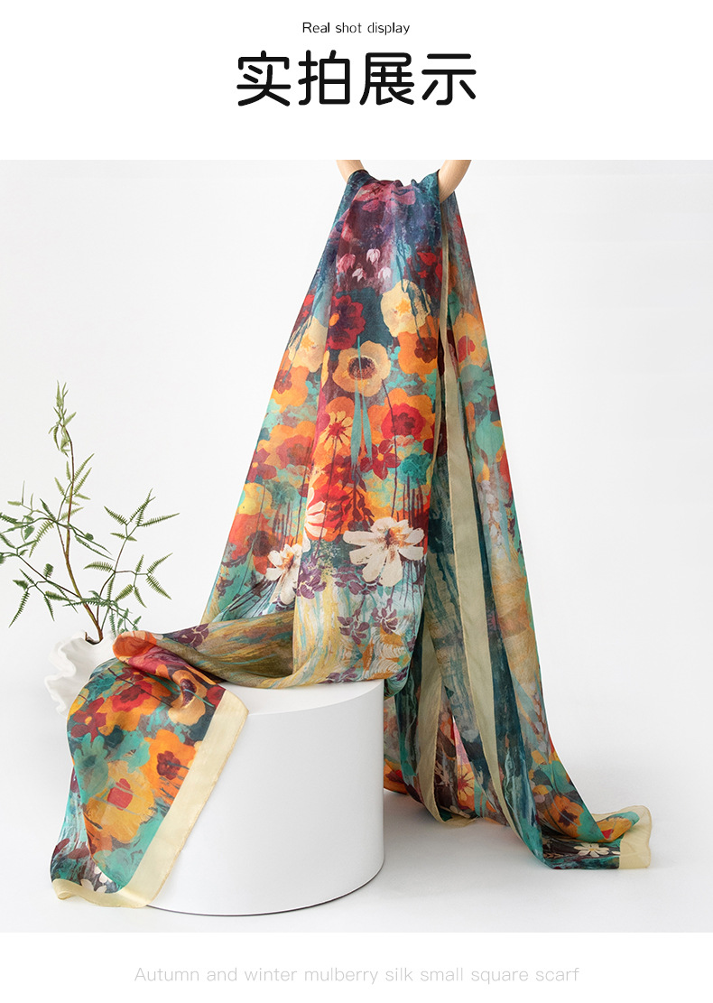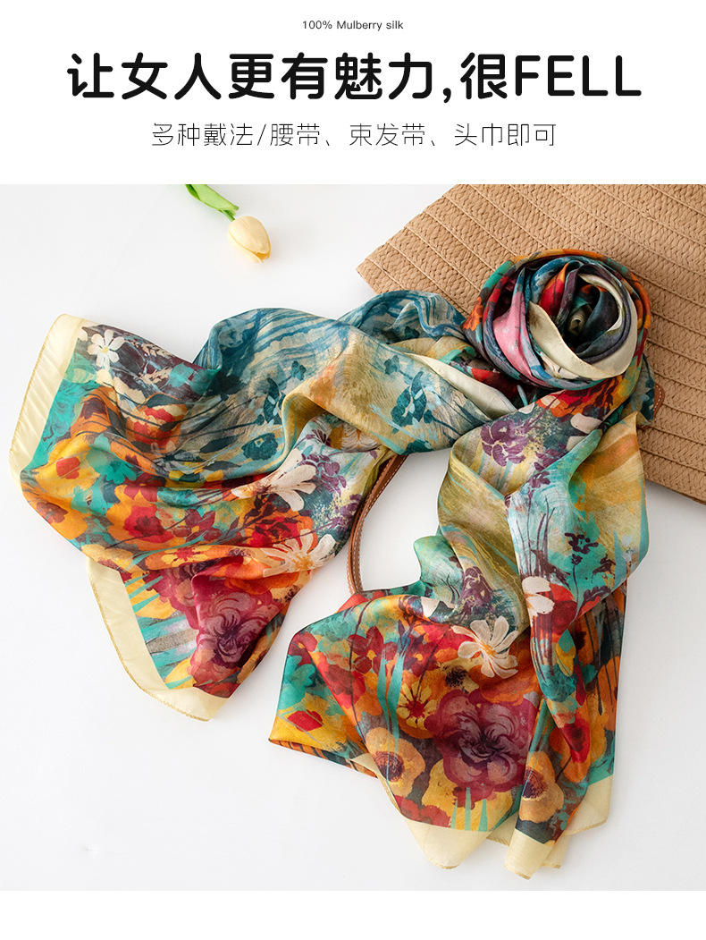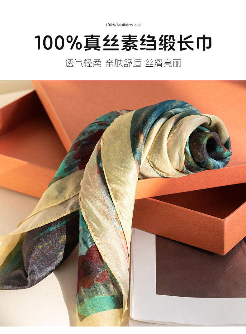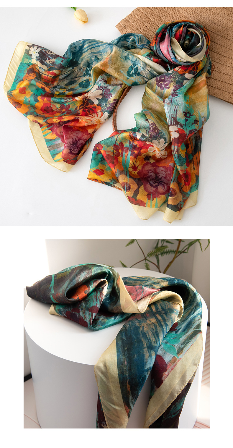 봄 실크 스카프 100% 뽕나무 실크 스카프 여성용 얇은 목도리 실크 유화 레트로 스타일 일반 크레페 새틴 고급 롱 스카프