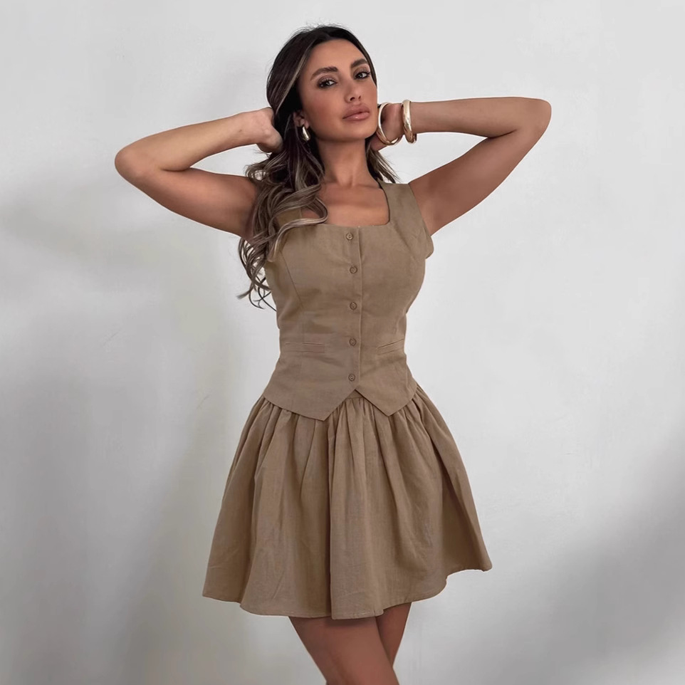 프랑스 스타일 우아한면과 린넨 조끼 세트 여성 2025 년 여름 서양식 카키 A 라인 스커트 여성 의류 세트