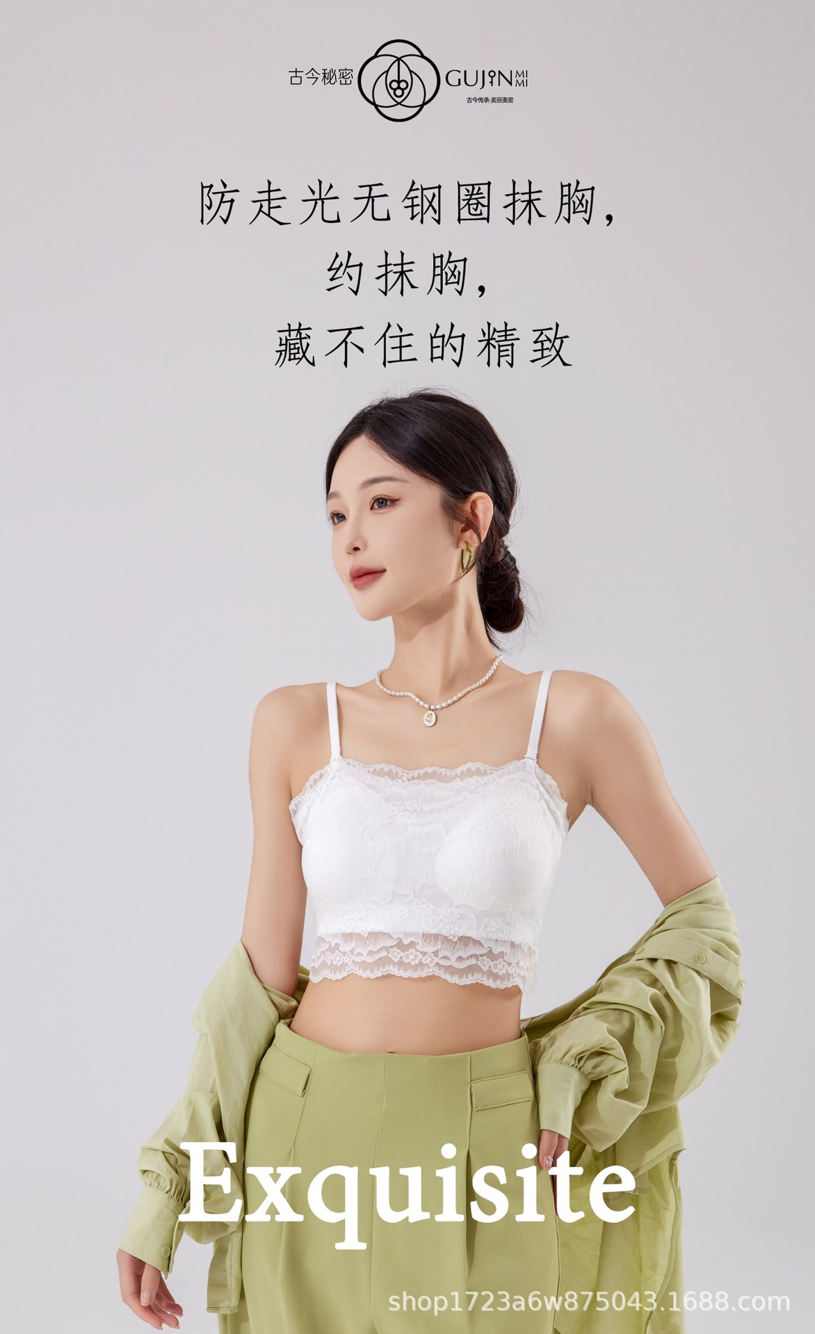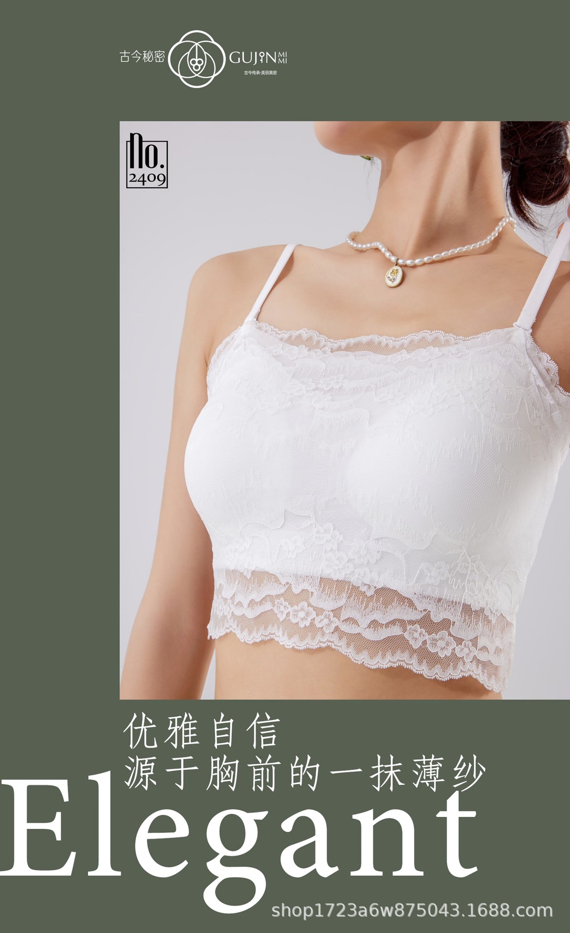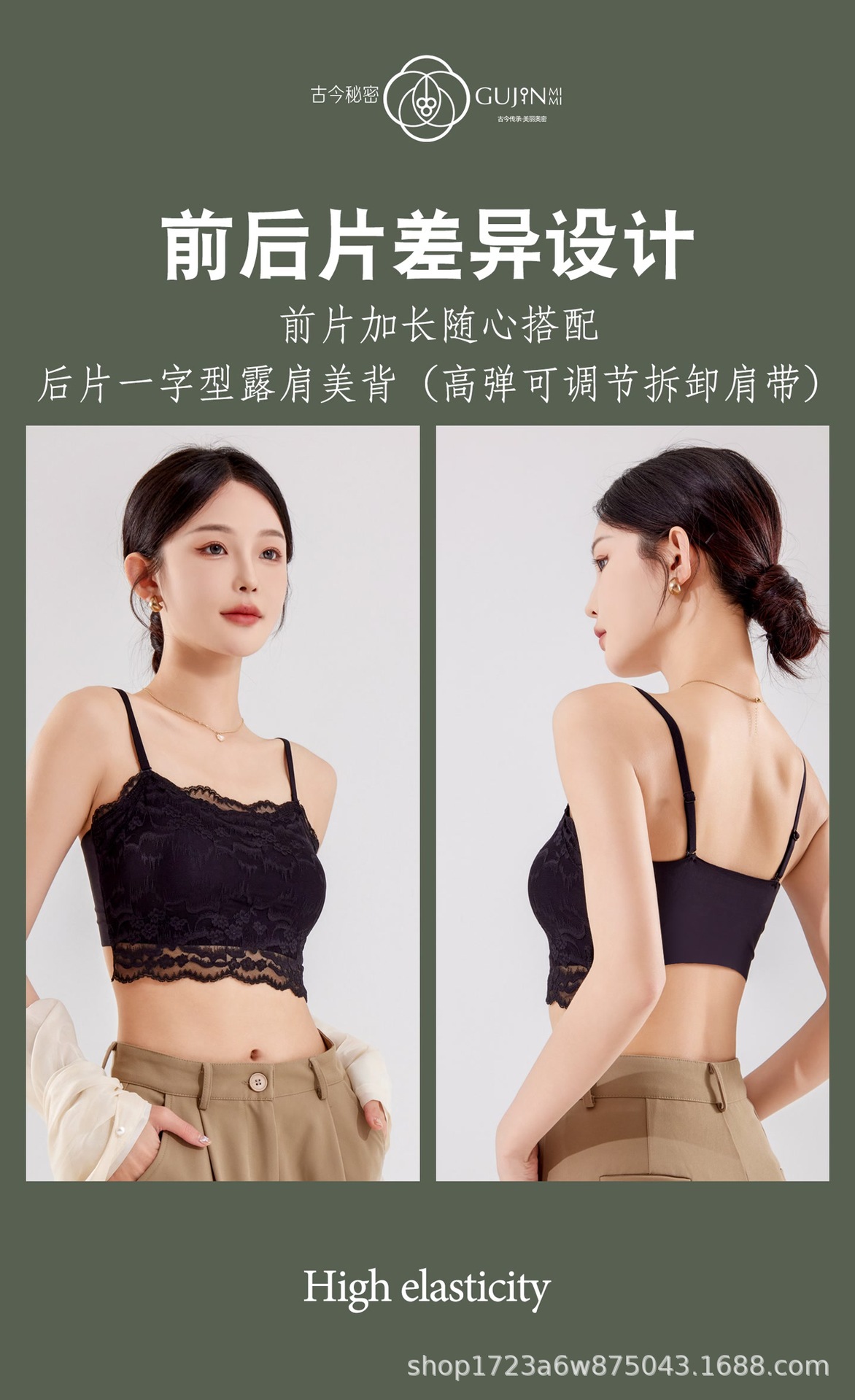 프렌치 레이스 고정 컵 얇은 어깨 스트랩 아름다운 백 칼라 안티 러닝 레이스 스트랩리스 조끼 없음 스틸 링 보이지 않음스토어 가기