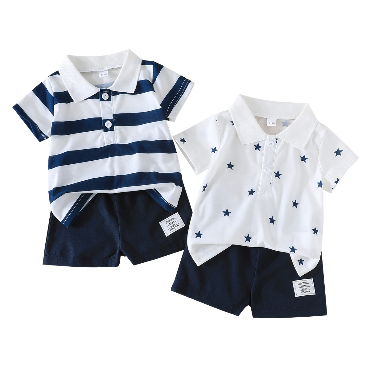 2025 여름 새로운 간단한 패션 아기 소년 줄무늬 스타 짧은 소매 옷깃 상단 반바지 세트