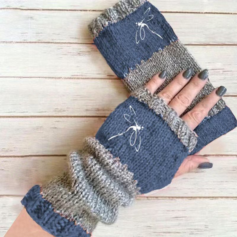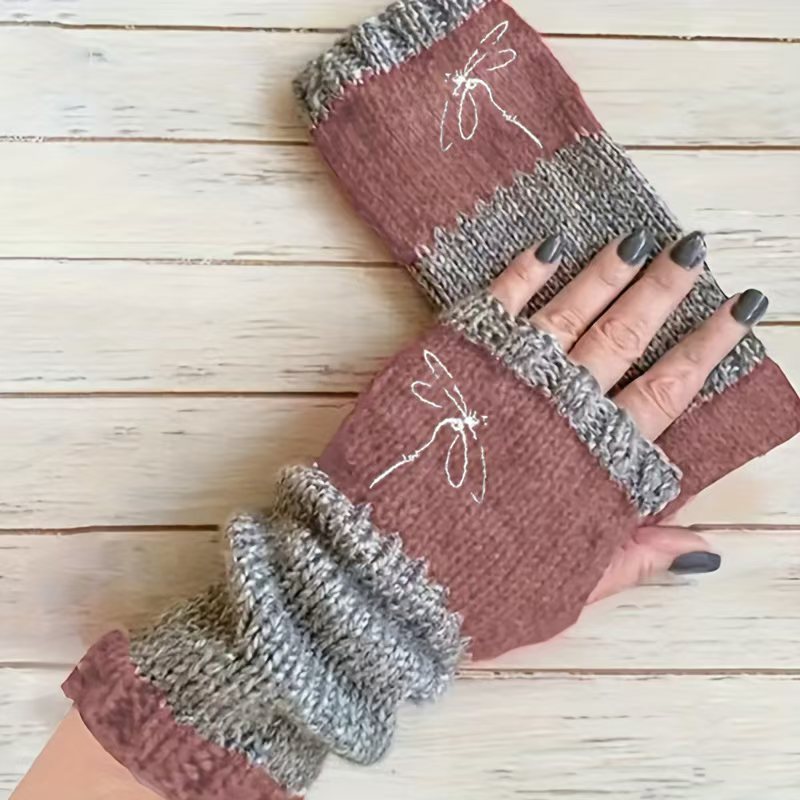 2025 새로운 Amazon TEMU 세련된 잠자리 자수 핑거리스 장갑 니트 스트레치 여성용 따뜻한 장갑