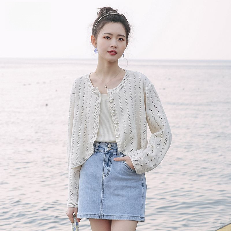 짧은 니트 카디건 코트 여자 얇은 봄 2025 새로운 올 매치 스웨터 부드러운 태양 보호 셔츠 할로우 탑