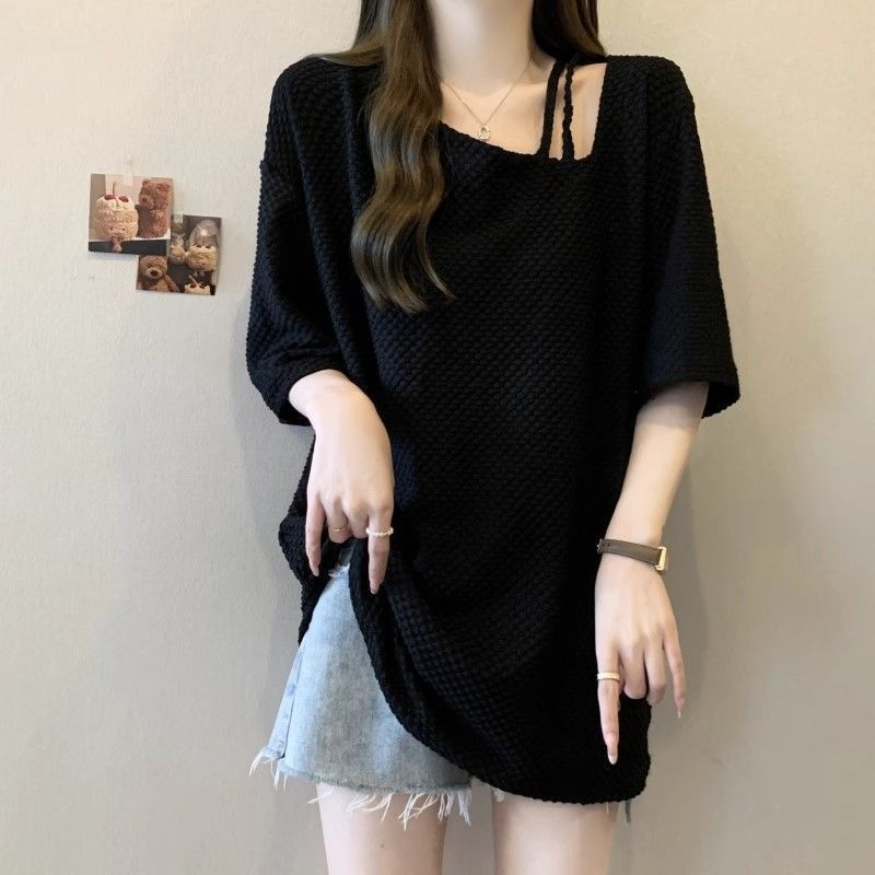 플러스 사이즈 게으른 스타일 틈새 반팔 티셔츠 여성 2025 년 여름 새로운 느슨한 슬리밍 디자인 감각 불규칙한 탑스토어 가기