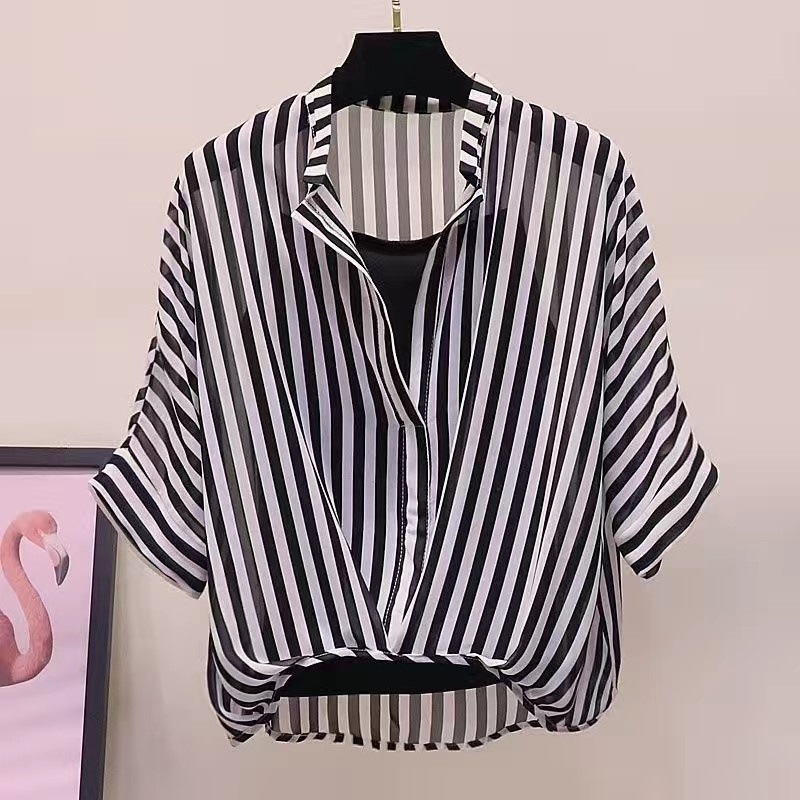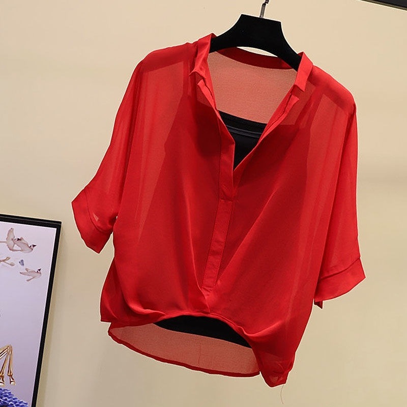여름 쉬폰 탑 여성 패션 신상 탑 배트 슬리브 루즈 반팔 셔츠 배트 셔츠 4050 세 아우터 셔츠