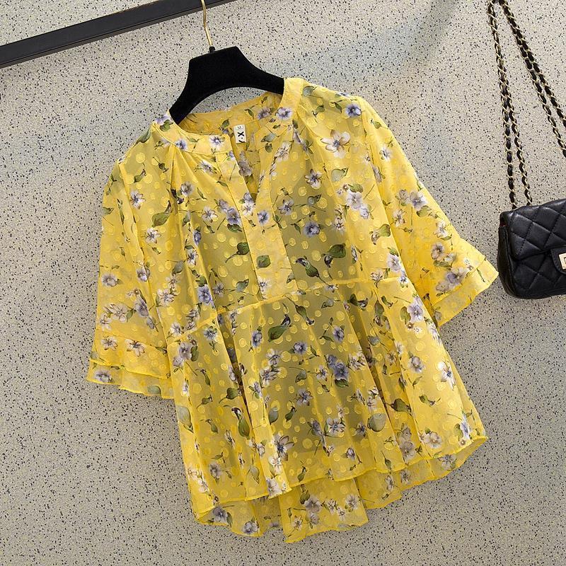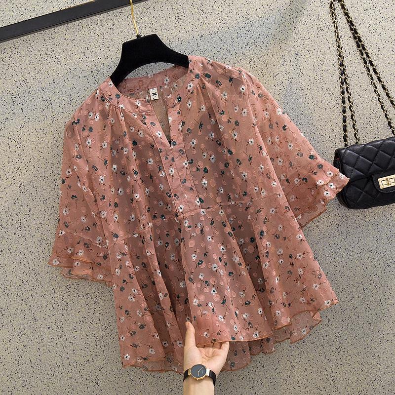 꽃 쉬폰 셔츠 여성 최고 반팔 2025 여름 새로운 한국식 느슨한 A 자형 배를 덮는 외래식 작은 셔츠스토어 가기