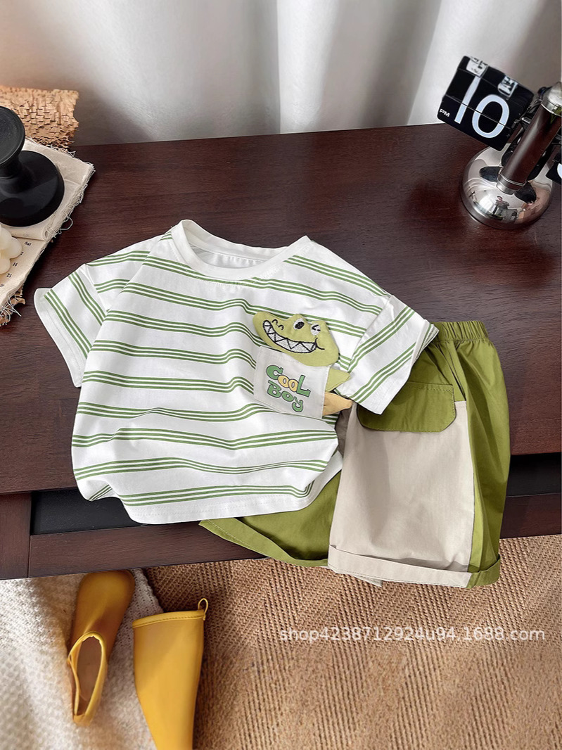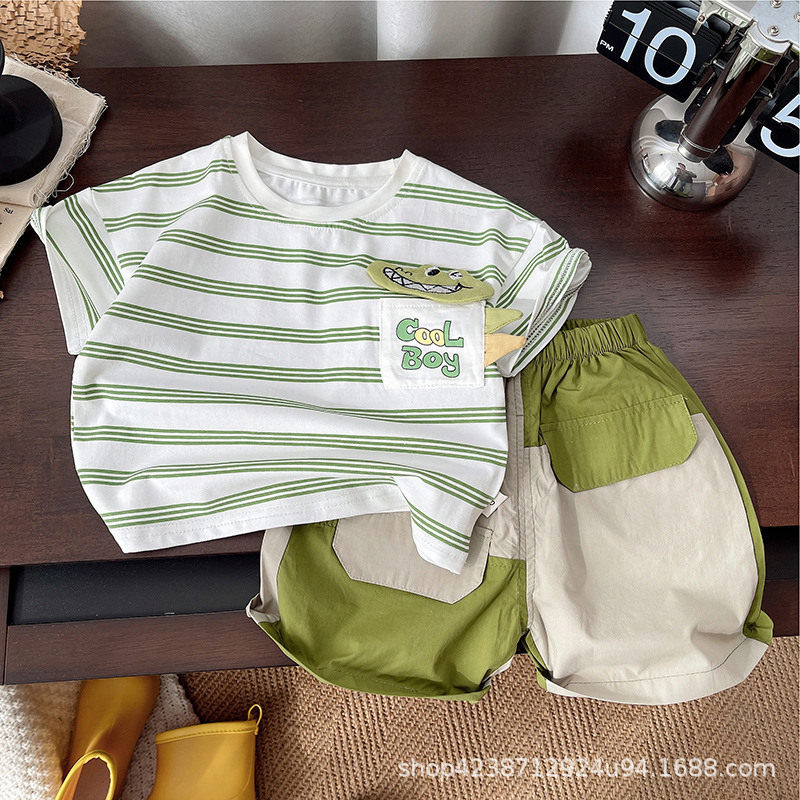 여름 소년 2025 새로운 줄무늬 양복 아기 악어 반팔 라운드 넥 T-블러드 패션 스플 라이스 5 반바지 순수 코튼스토어 가기