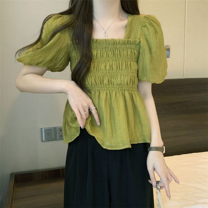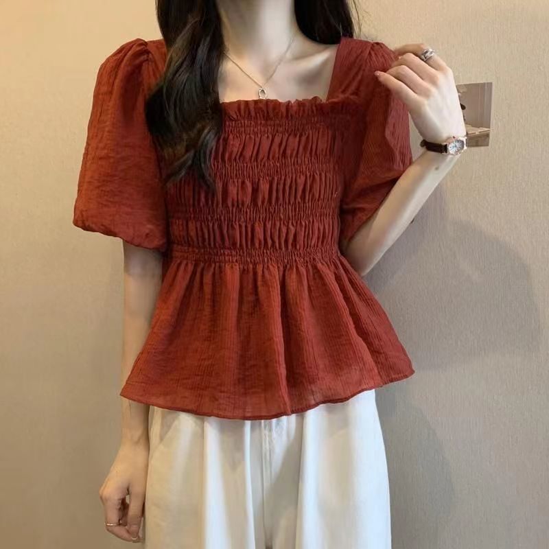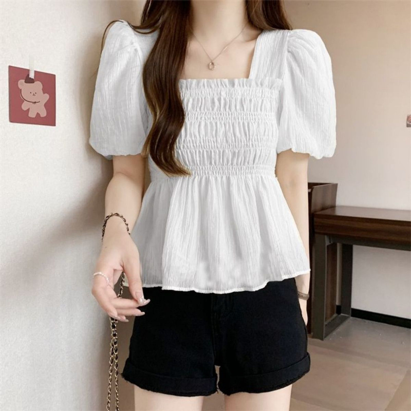 프랑스 스타일 스퀘어 칼라 반팔 쉬폰 셔츠 여성의 여름 새로운 디자인 센스 니쉬 쇼트 탑 벨리 커버 셔츠스토어 가기