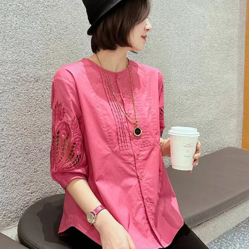 중공 자수 세븐 슬리브 화이트 셔츠 여성의 2025 년 여름 새로운 슬리밍 코튼 셔츠 우아한 연령 감소 탑스토어 가기