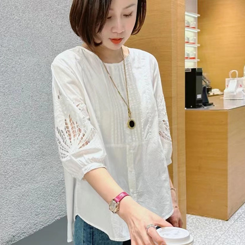 중공 자수 세븐 슬리브 화이트 셔츠 여성의 2025 년 여름 새로운 슬리밍 코튼 셔츠 우아한 연령 감소 탑