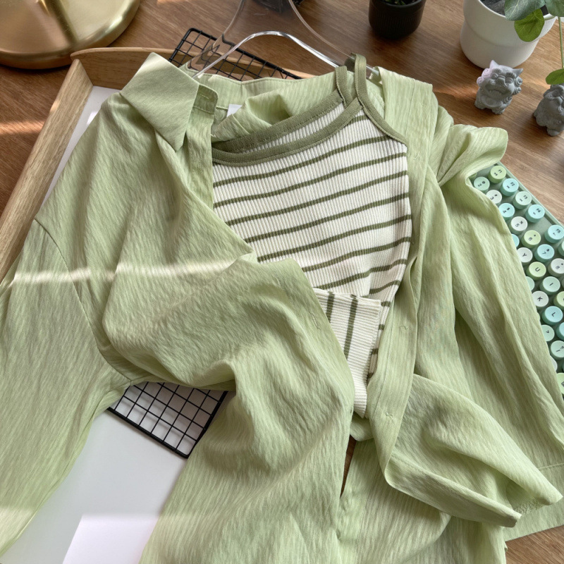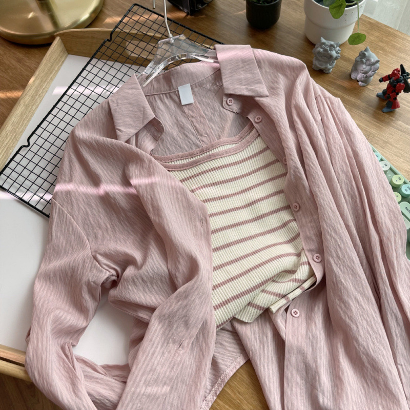 슬링 세트 외부를 착용 한 프랑스 긴 소매 카디건 얇은 태양 보호 의류 여성의 2025 년 여름 새 파란색 셔츠 코트스토어 가기