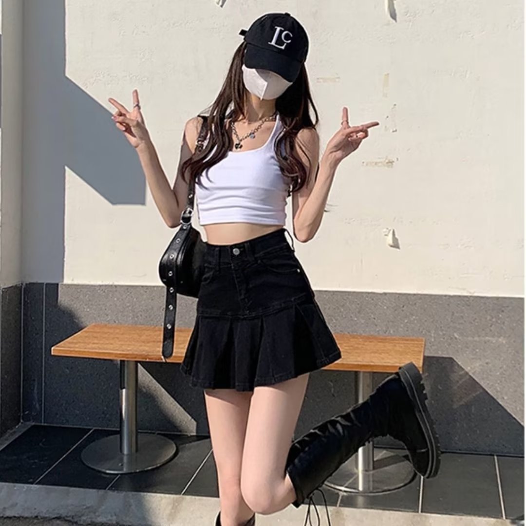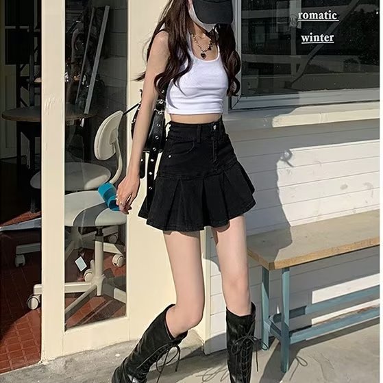 데님 플리츠 스커트 여성 봄 여름 신상 하이웨이스트 A라인 숏 스커트 드레이프 캐주얼 데님 스커트