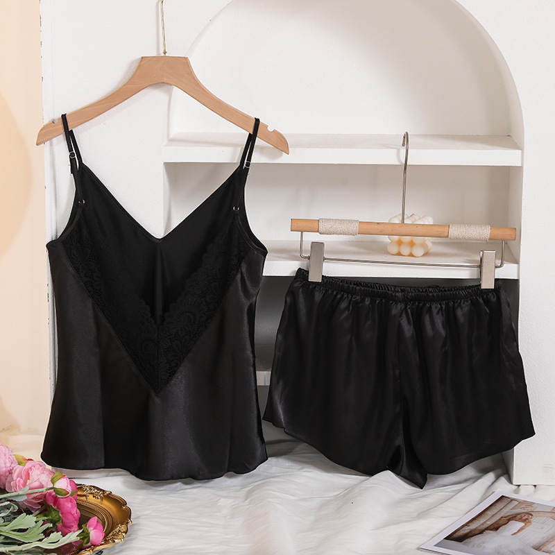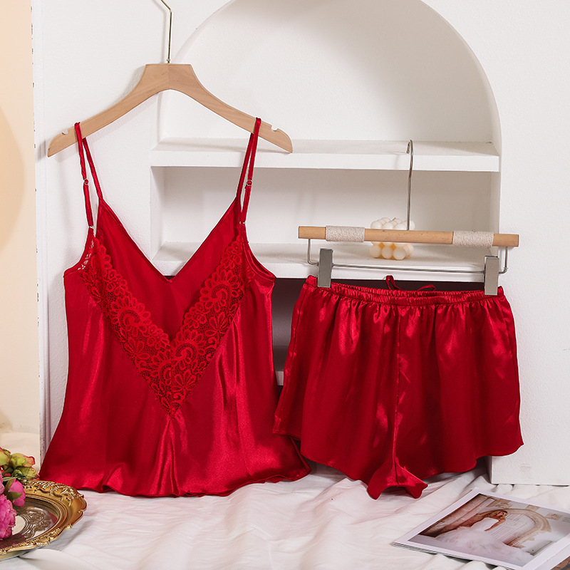 봄과 여름 실크 잠옷 투피스 세트 패션 단색 반바지 홈 의류 세트 섹시한 레이스 스커트
