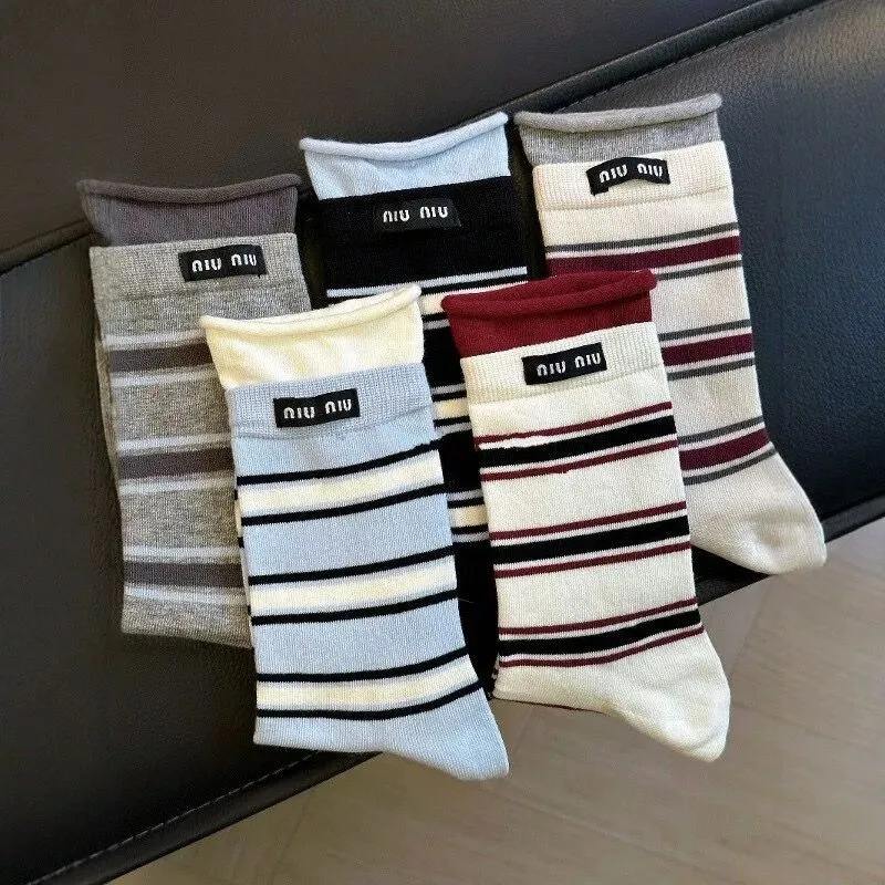 한국식 줄무늬 양말 여성용 종아리 중간 양말 여름 대비 색상 새로운 스타일 복고풍 일본식 봄, 가을 다용도 스포츠 트렌디 양말스토어 가기