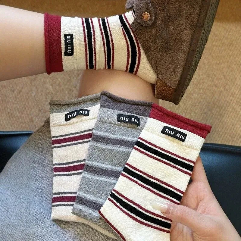 한국식 줄무늬 양말 여성용 종아리 중간 양말 여름 대비 색상 새로운 스타일 복고풍 일본식 봄, 가을 다용도 스포츠 트렌디 양말