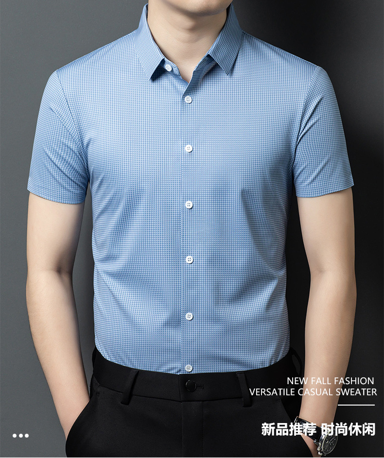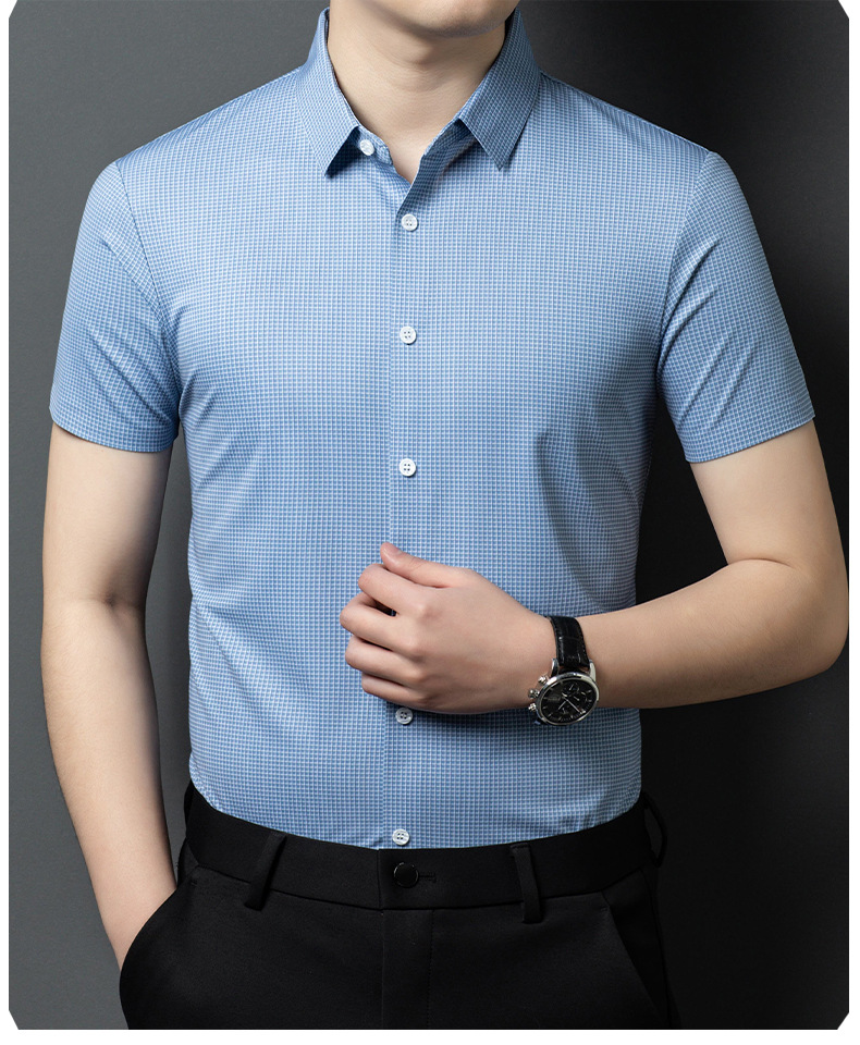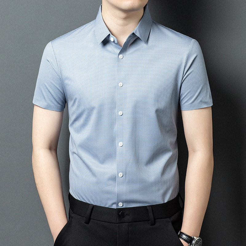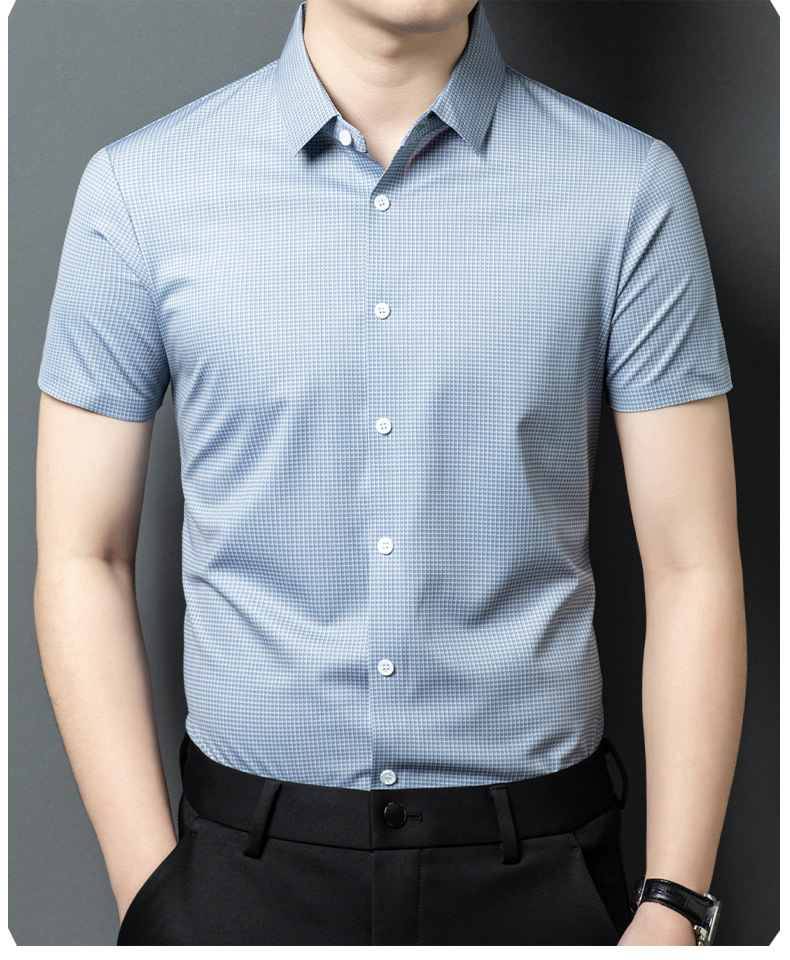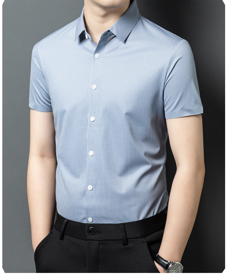 여름 새로운 한국 스타일 반팔 셔츠 패션 남성 비즈니스 캐주얼 단순 올 매치 반팔 셔츠 트렌디 그레이 격자 무늬 남성스토어 가기