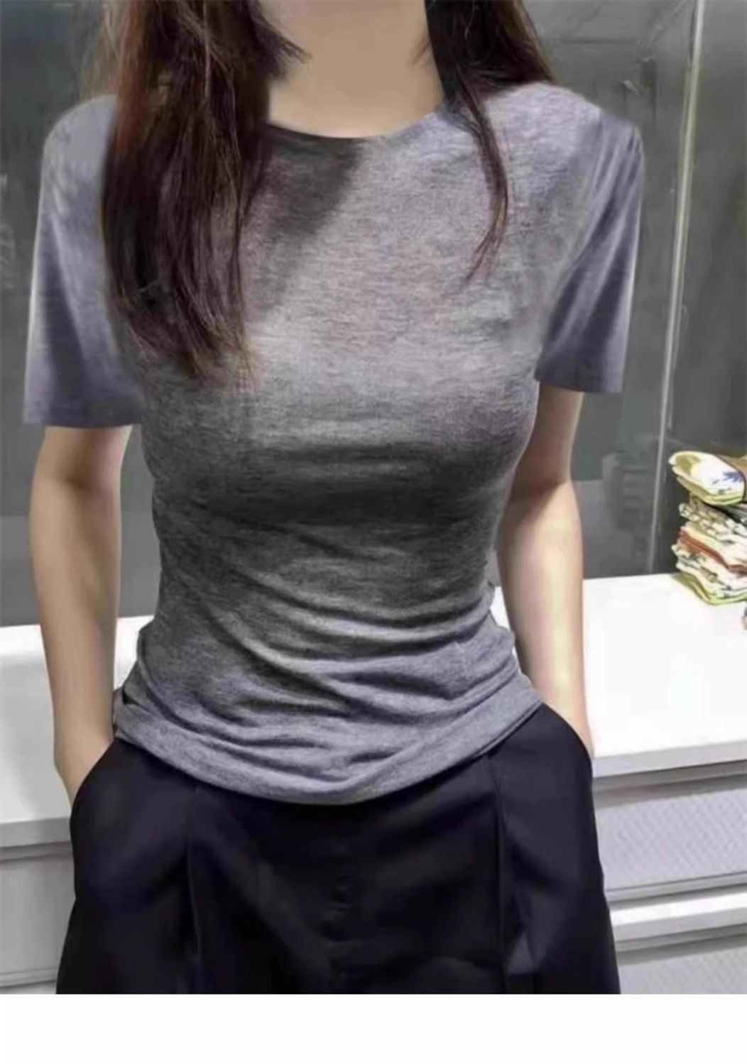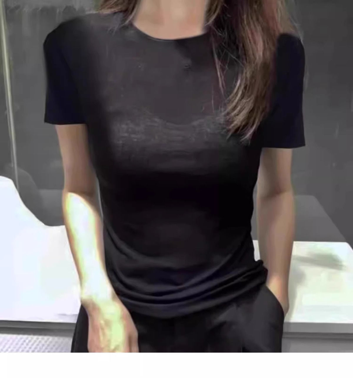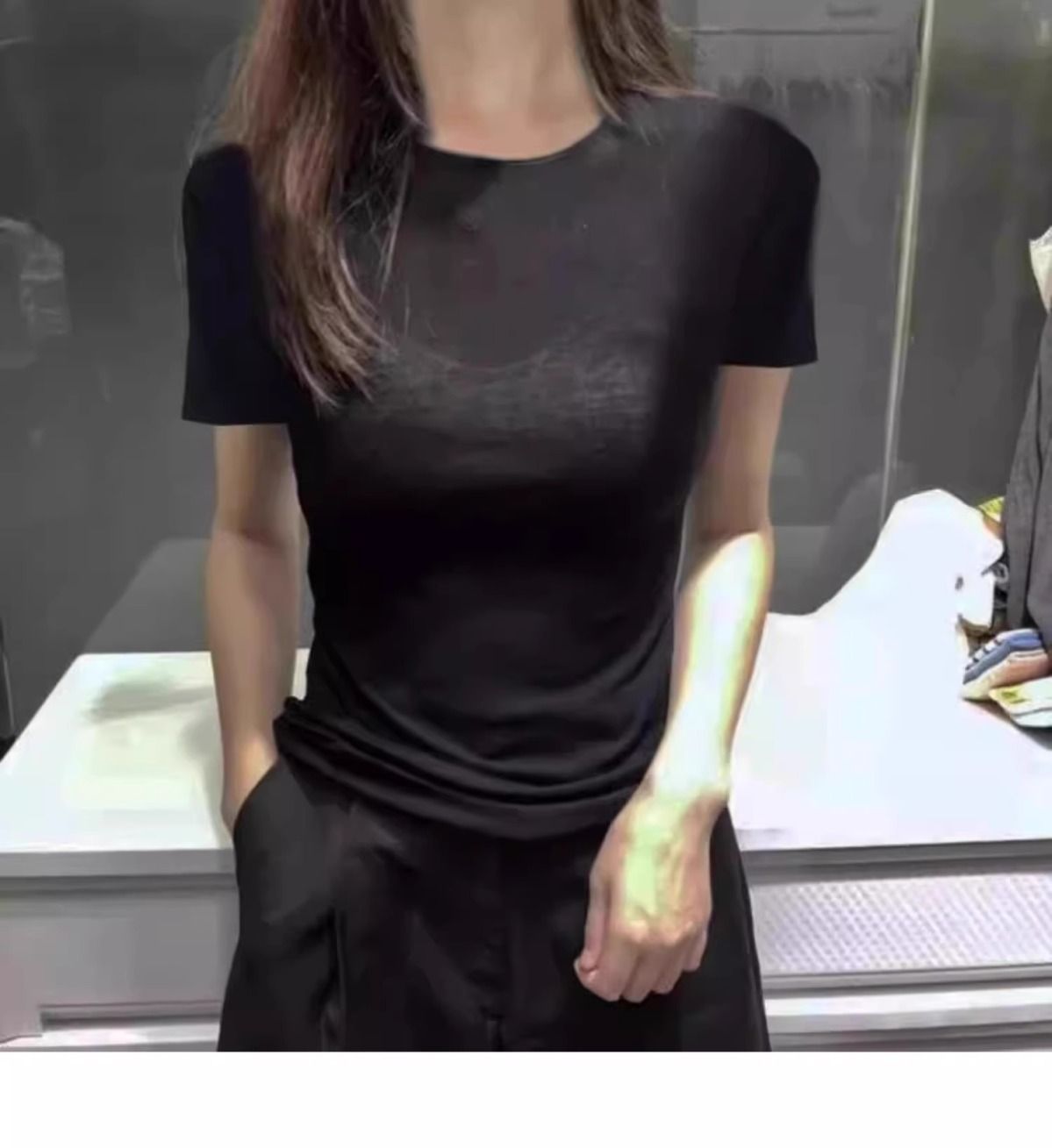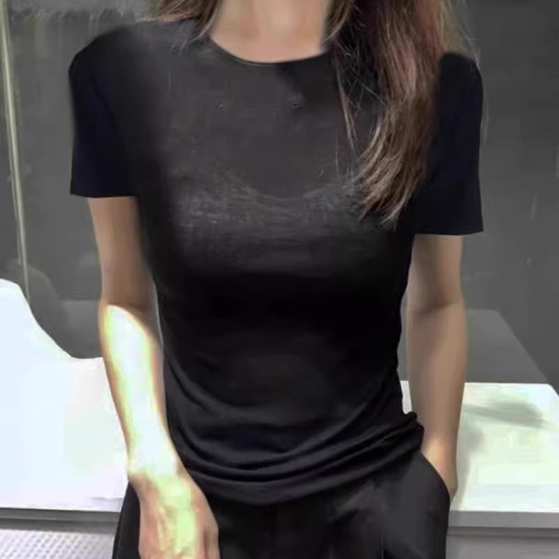 한국식 라운드 넥 얇은 반팔 티셔츠 여성 티셔츠 2025 새로운 여름 슬림핏 슬리밍 웨스턴 스타일 반소매 탑
