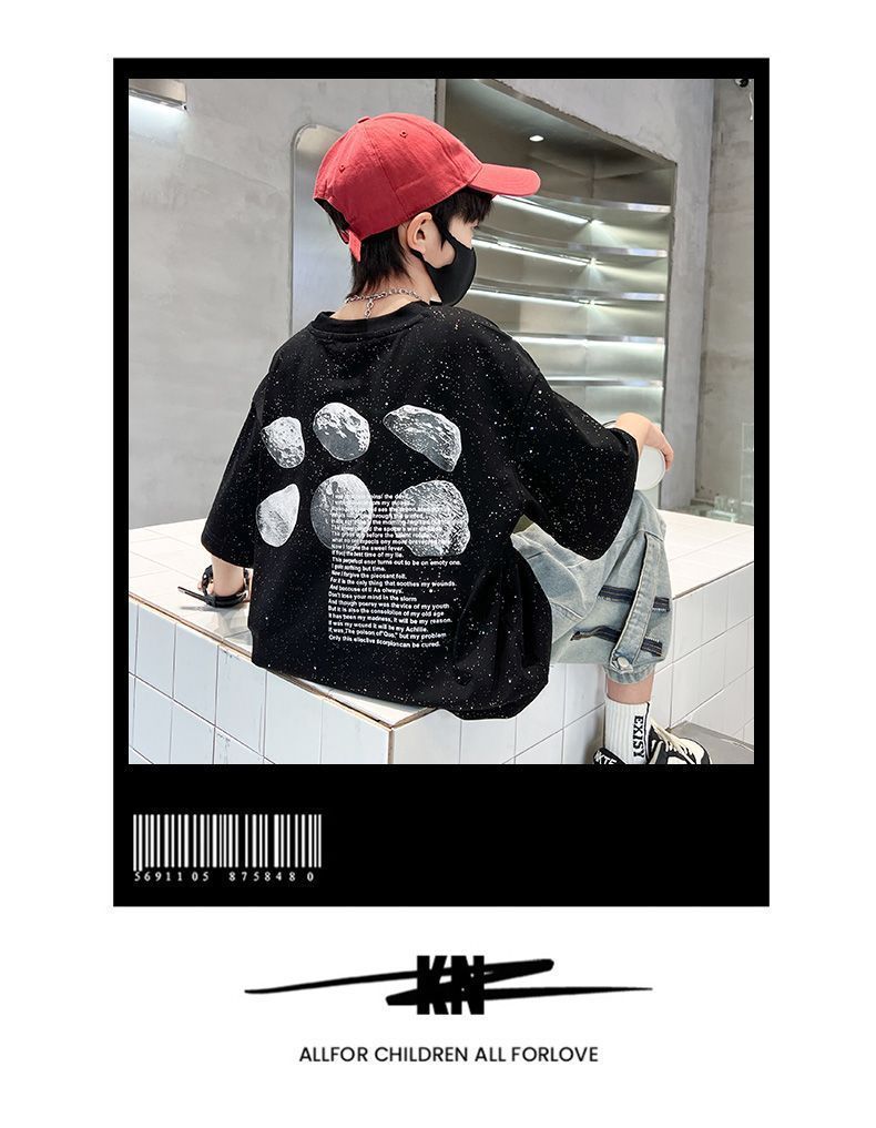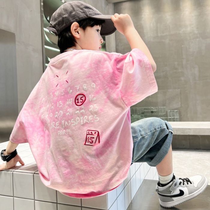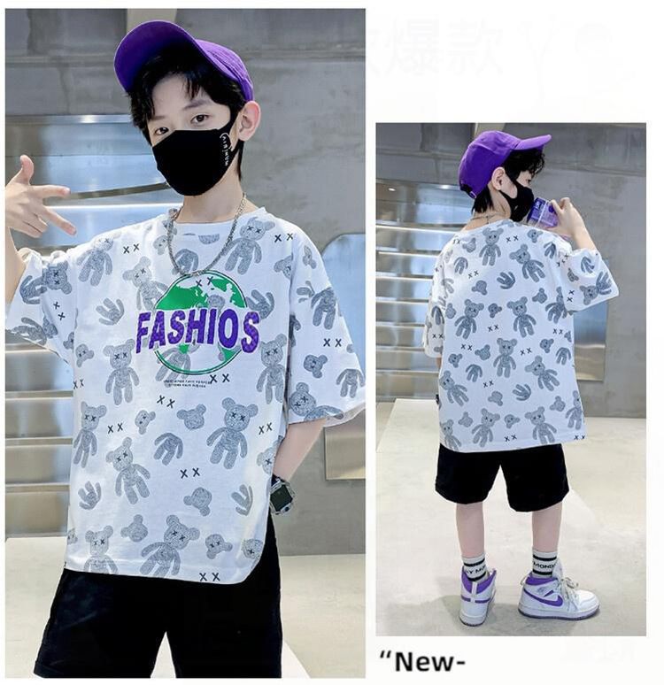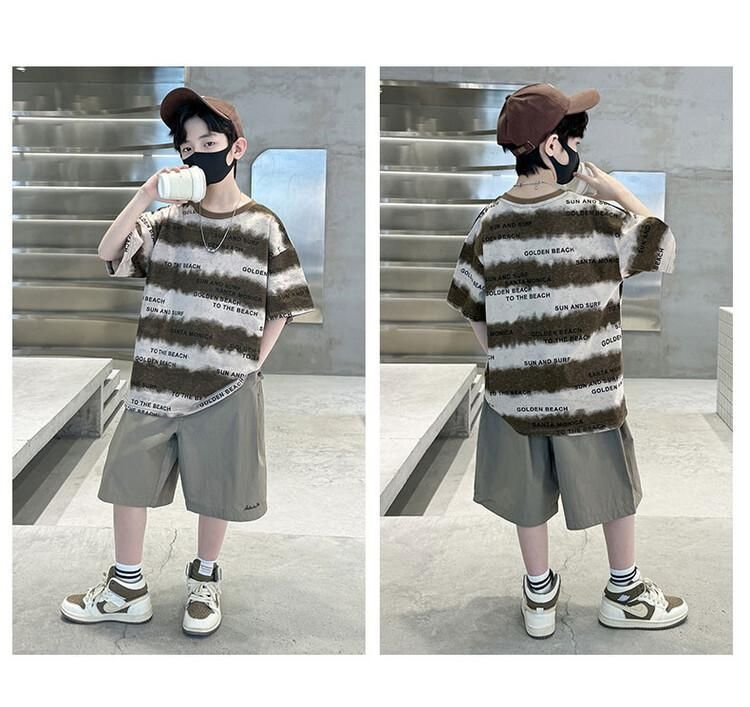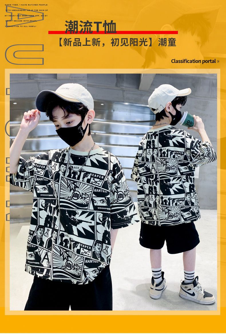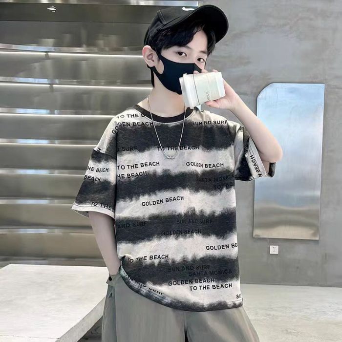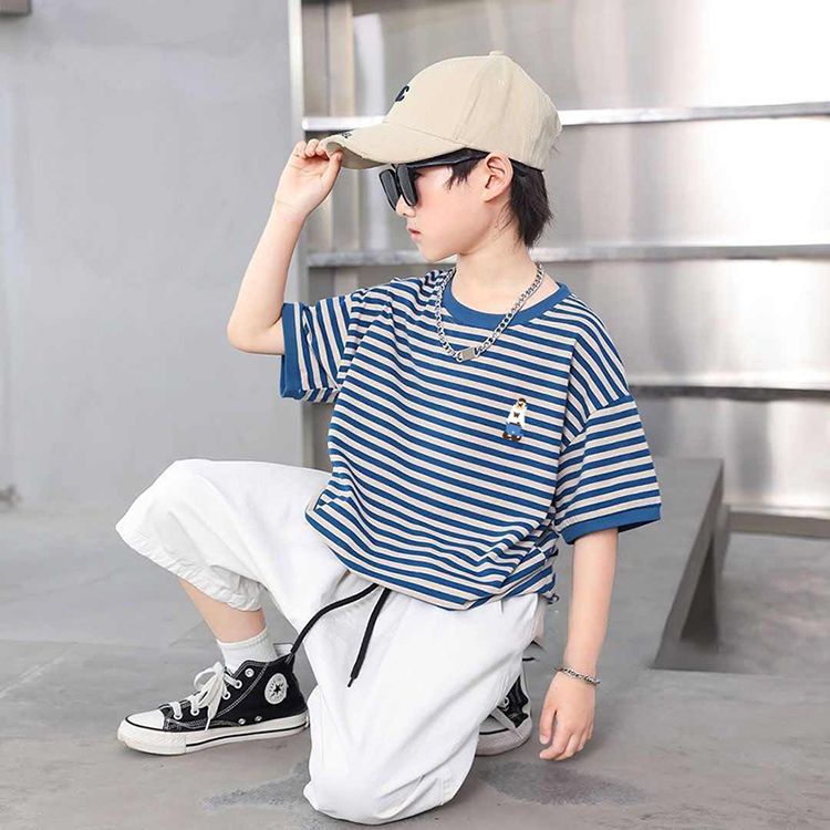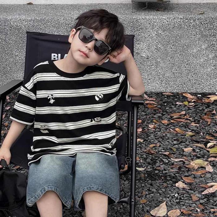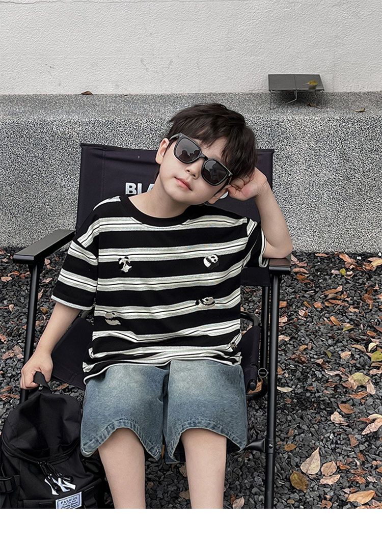아동용 티셔츠 2025 한국식 어린 소년 패션 팬더 스트라이프 탑 소년 얇은 루즈 캐주얼 티셔츠 공장스토어 가기