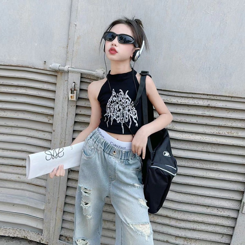 소녀 청바지 여름 2025 새로운 얇은 아이들의 찢어진 넓은 다리 바지 여름 학생 소녀 스트레이트 다리 바지스토어 가기