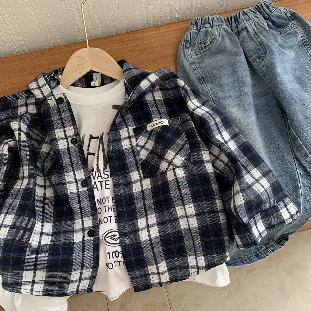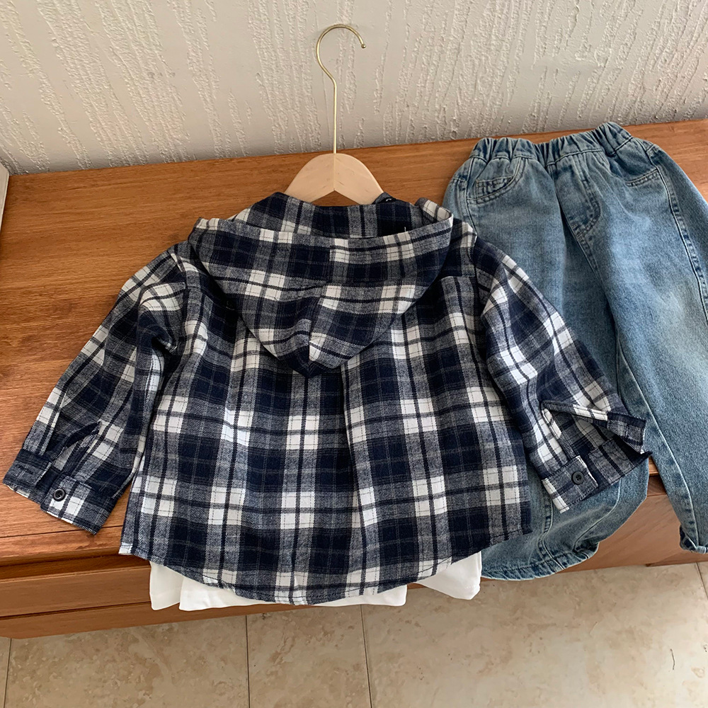 소년 봄, 가을 의류 아동 한국 스타일 유행 격자 무늬 셔츠 디자인 캐주얼 어린이 느슨한 셔츠 후드 자켓