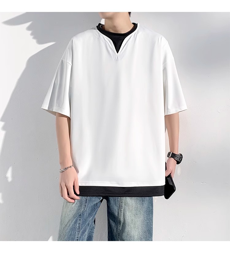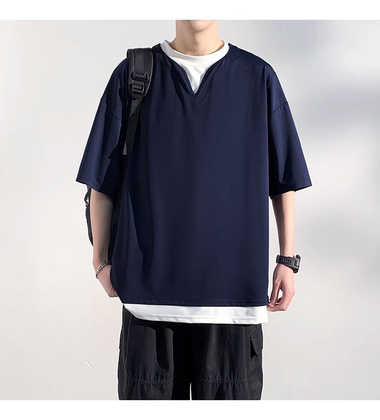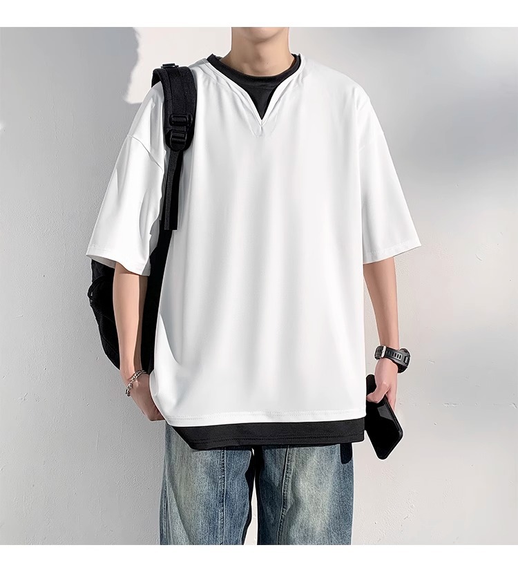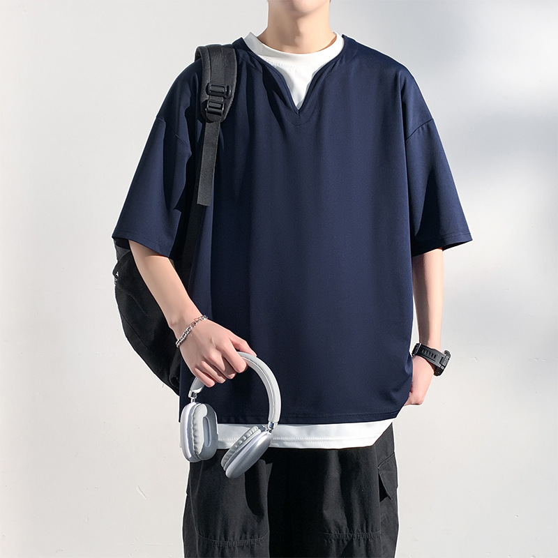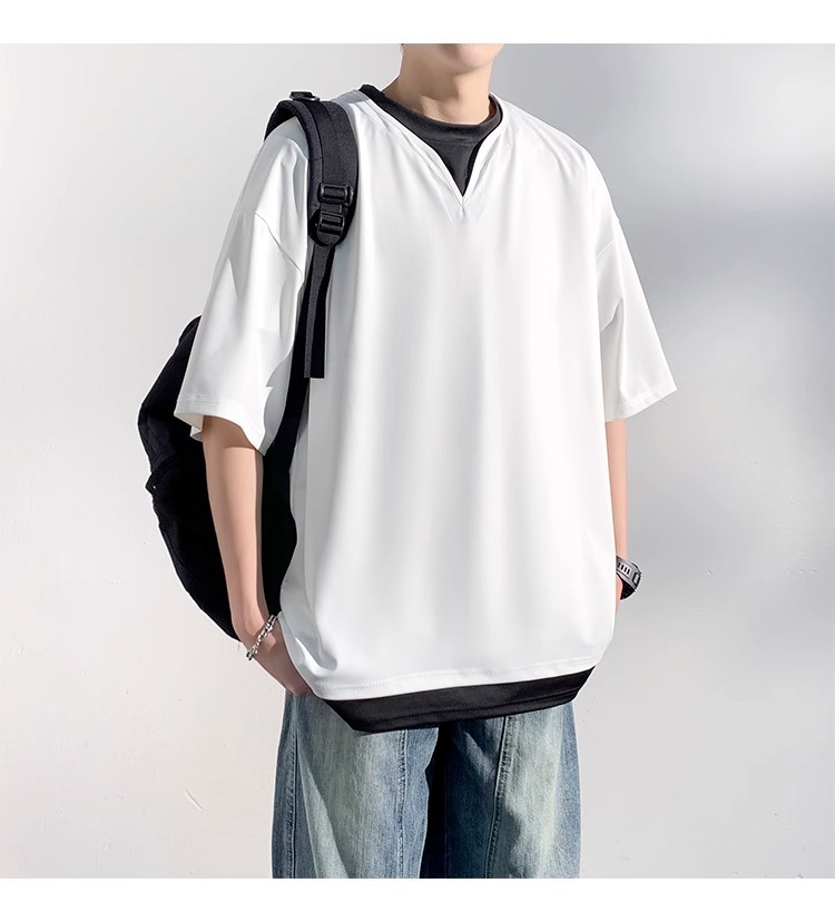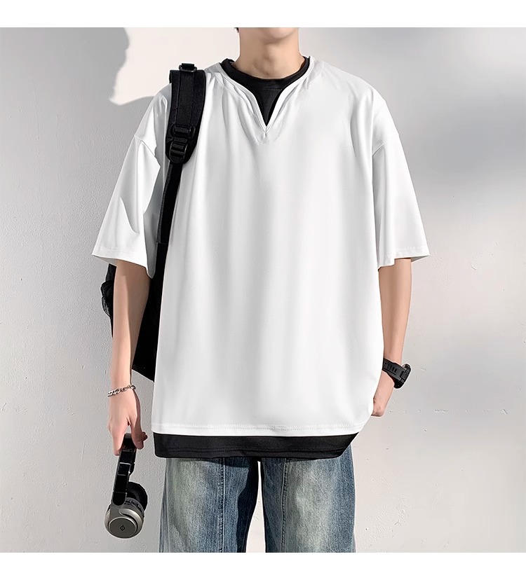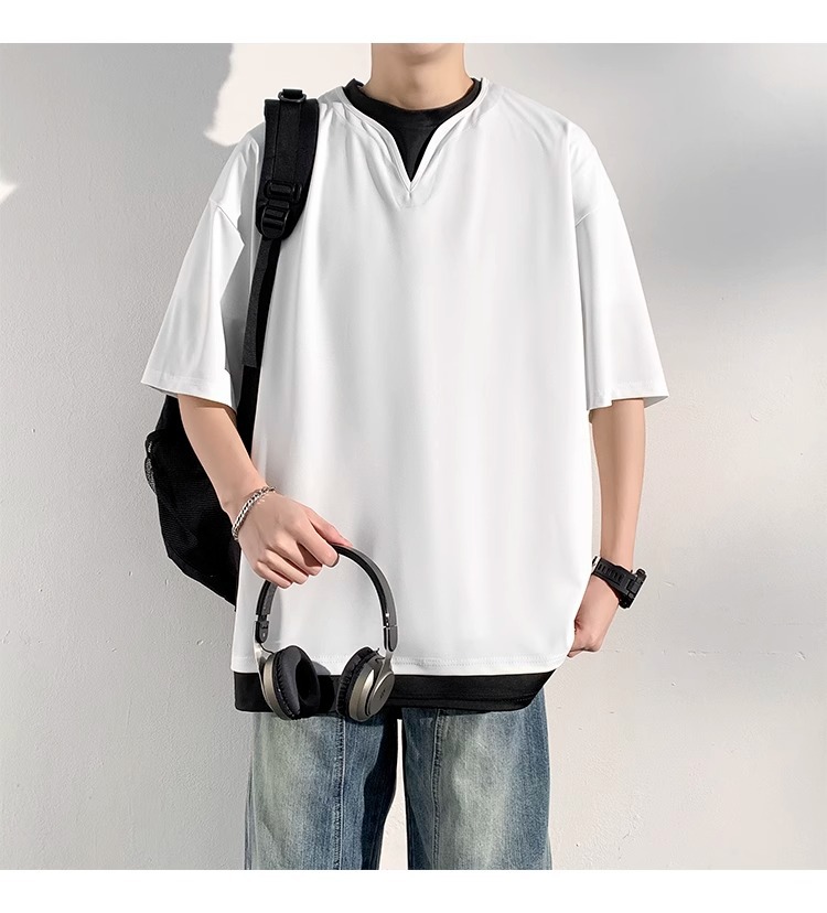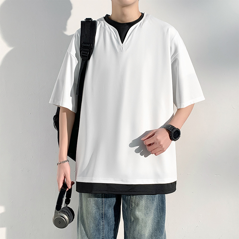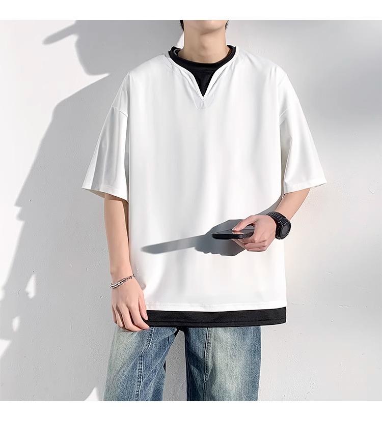 NASA 아이스 실크 반팔 티셔츠 남자 여름 미국 가짜 투피스 티셔츠 루즈 캐주얼 플러스 사이즈 반소매 V 넥 탑