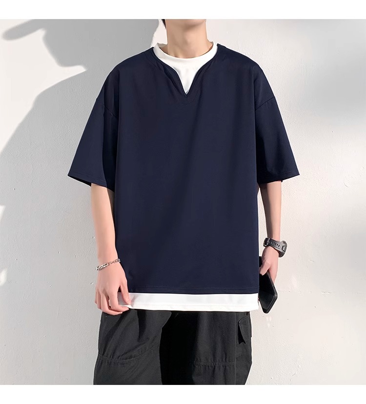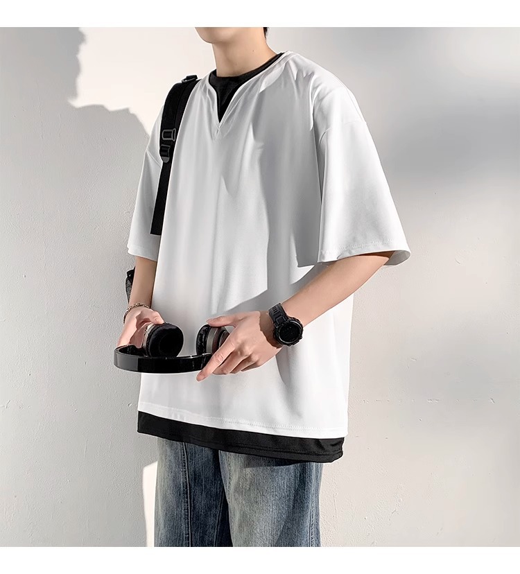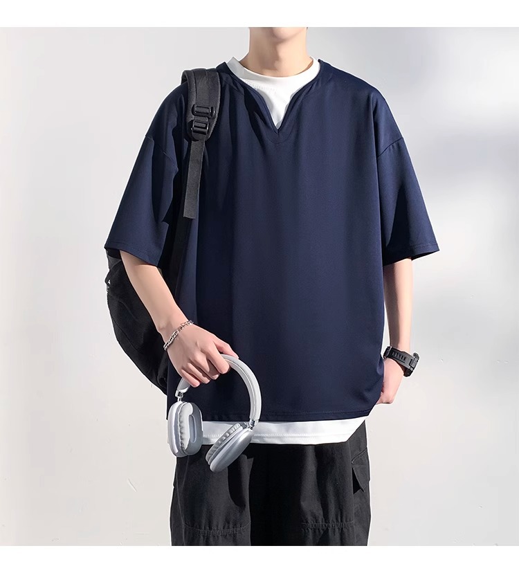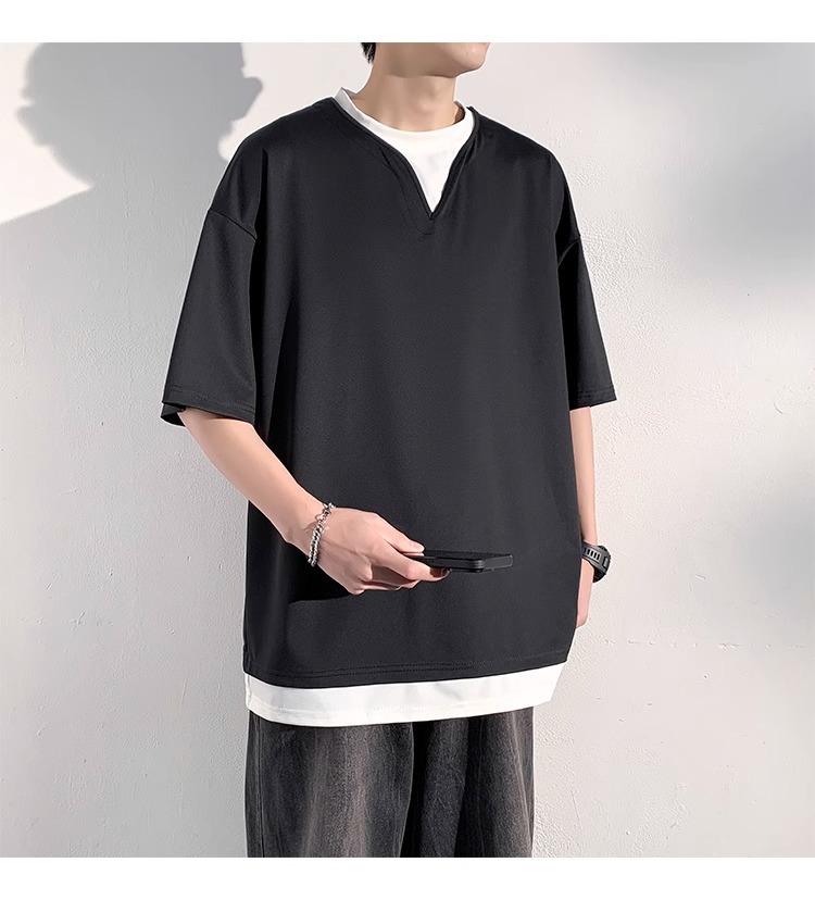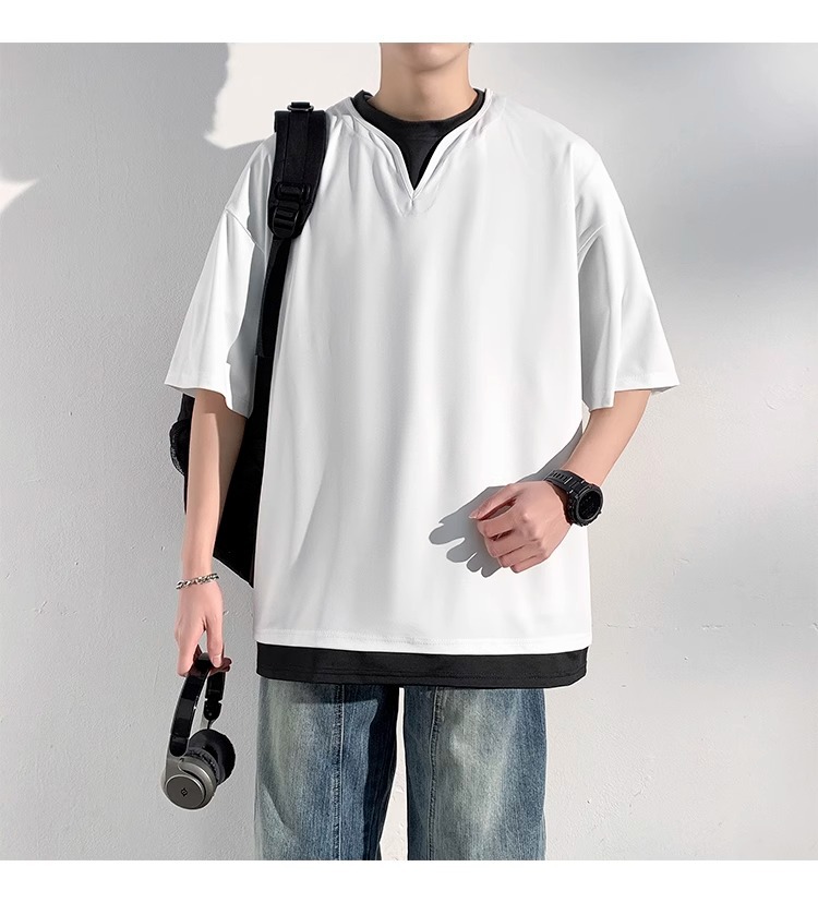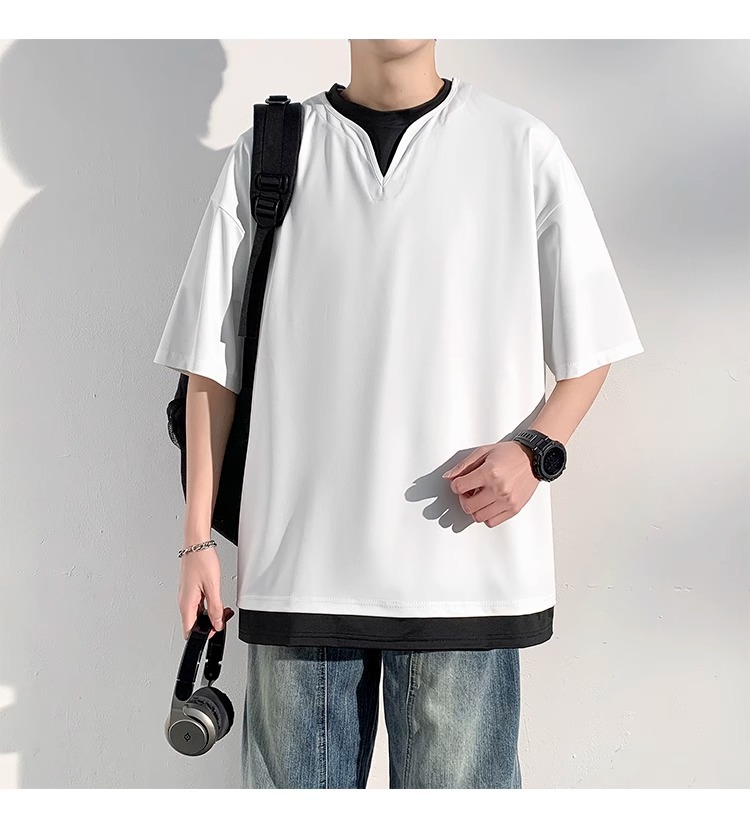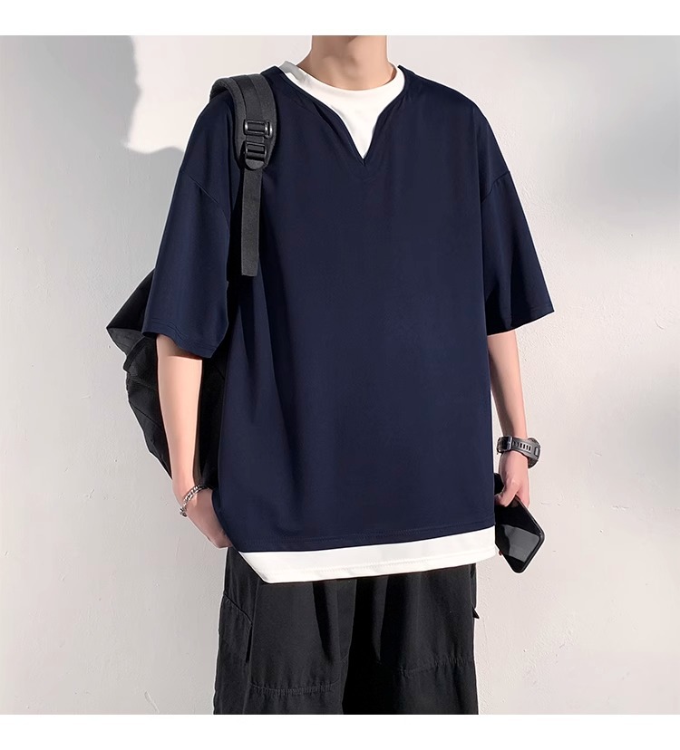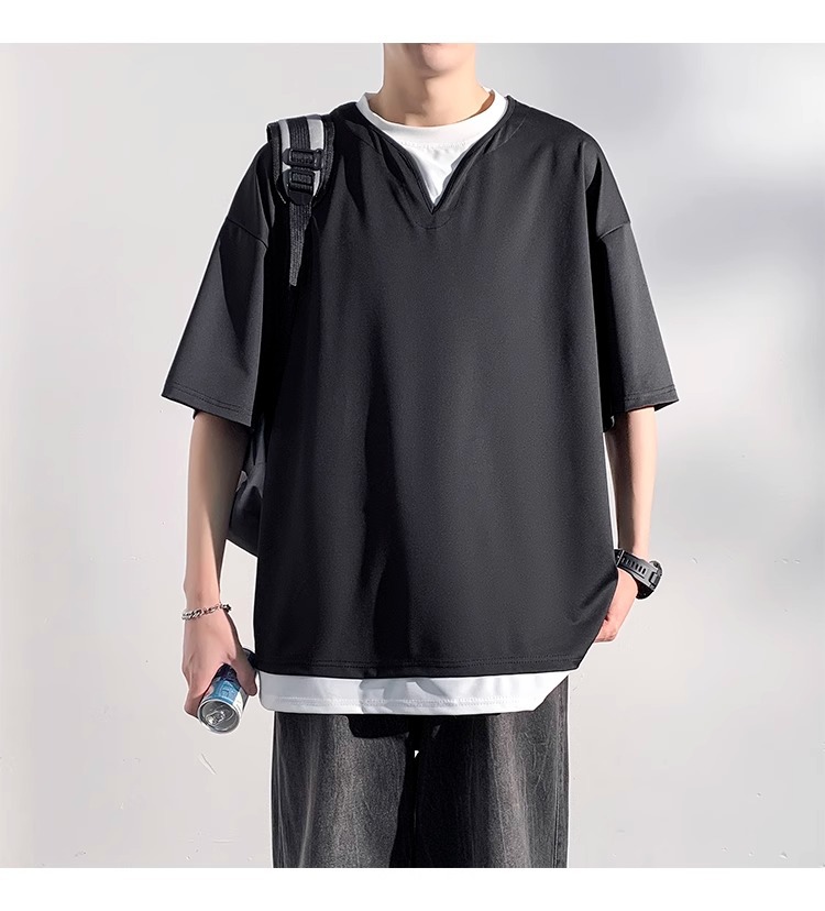 NASA 아이스 실크 반팔 티셔츠 남자 여름 미국 가짜 투피스 티셔츠 루즈 캐주얼 플러스 사이즈 반소매 V 넥 탑