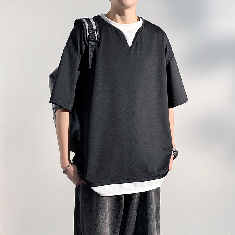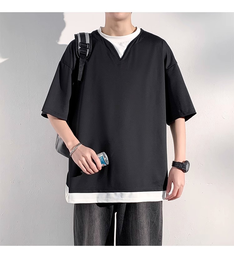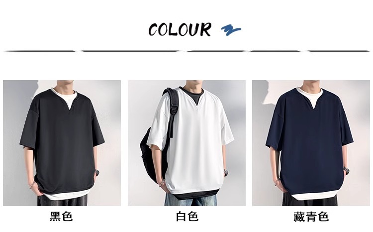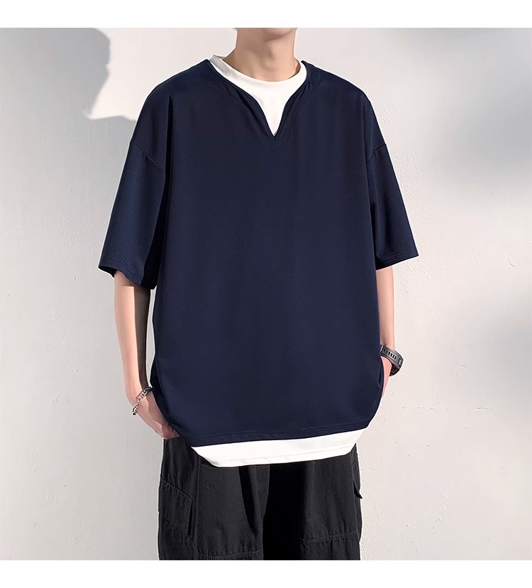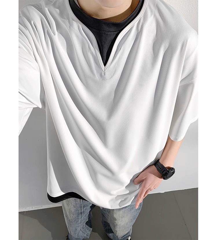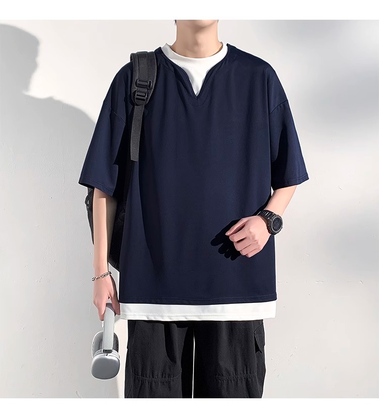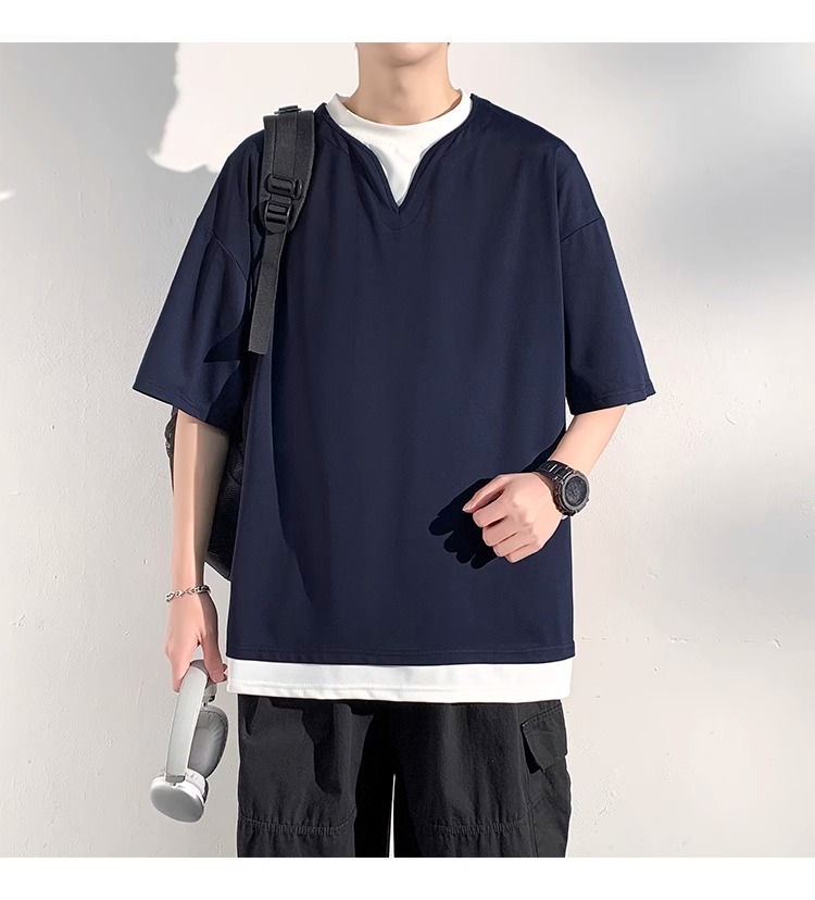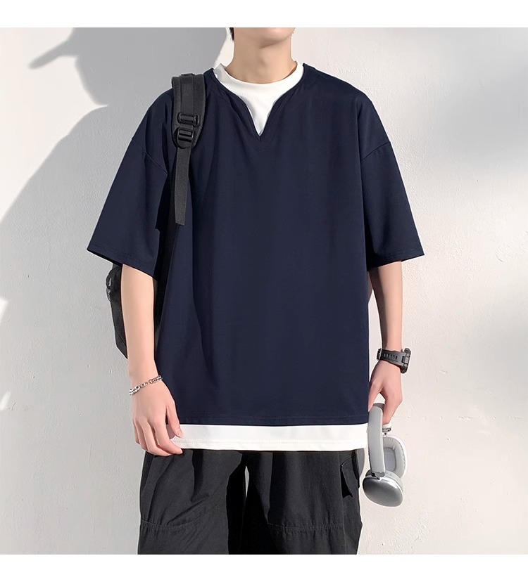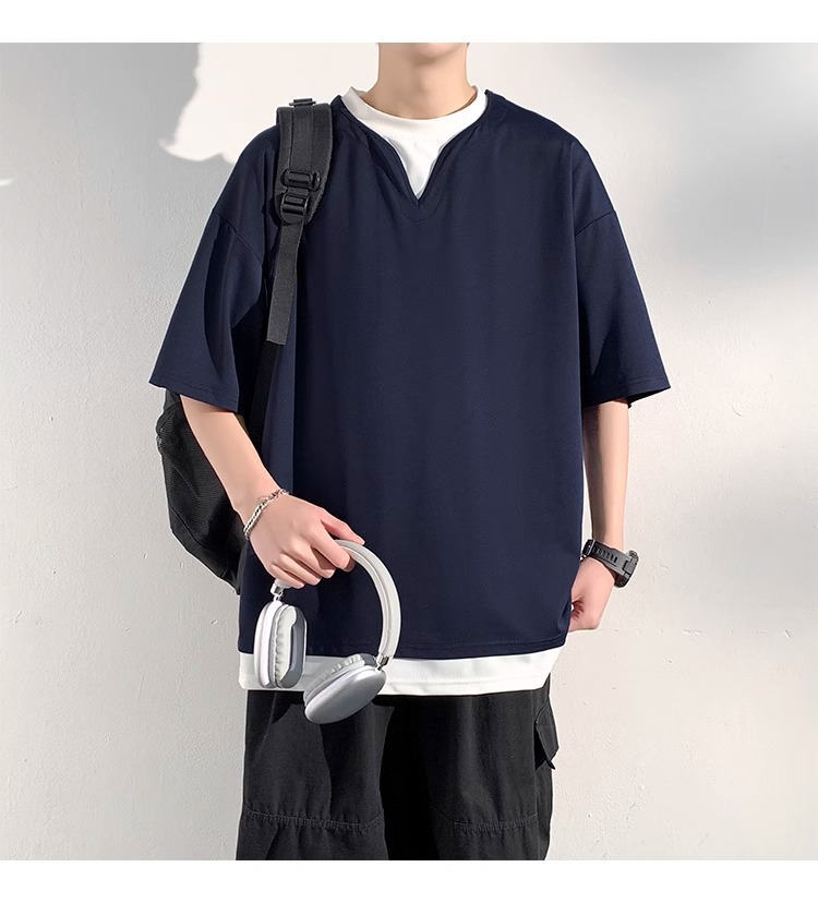 NASA 아이스 실크 반팔 티셔츠 남자 여름 미국 가짜 투피스 티셔츠 루즈 캐주얼 플러스 사이즈 반소매 V 넥 탑