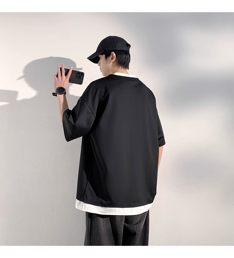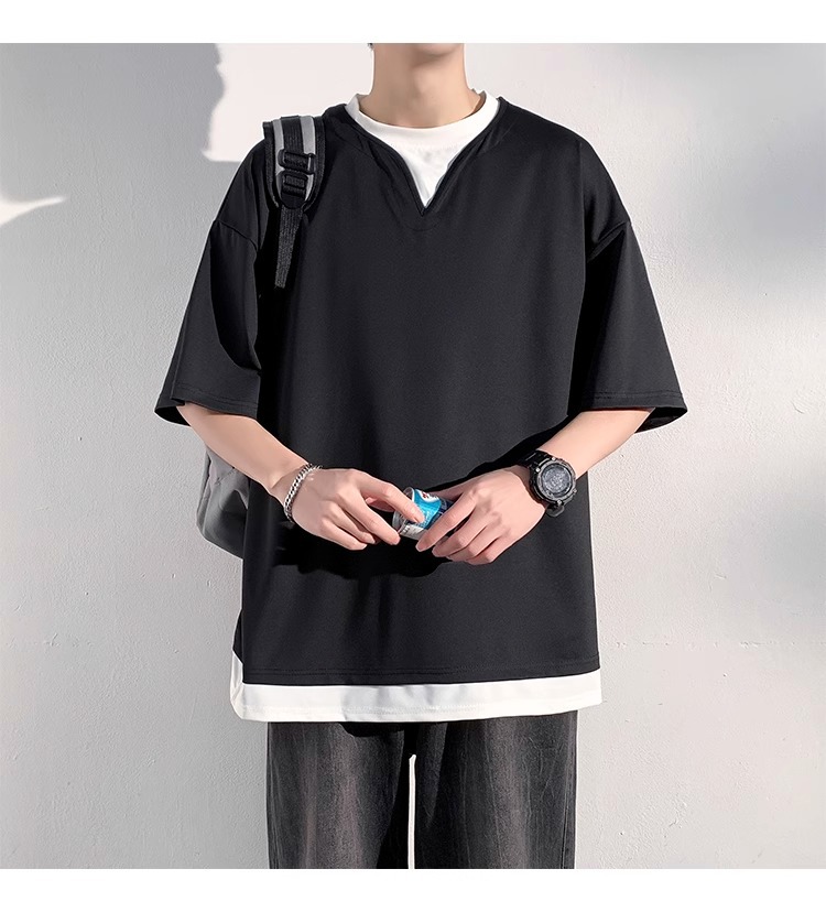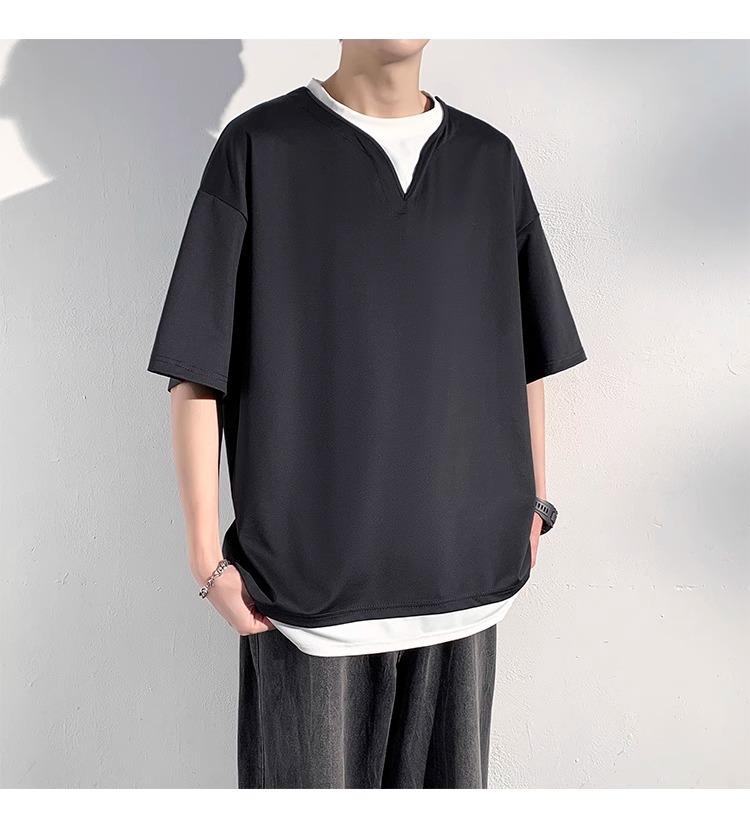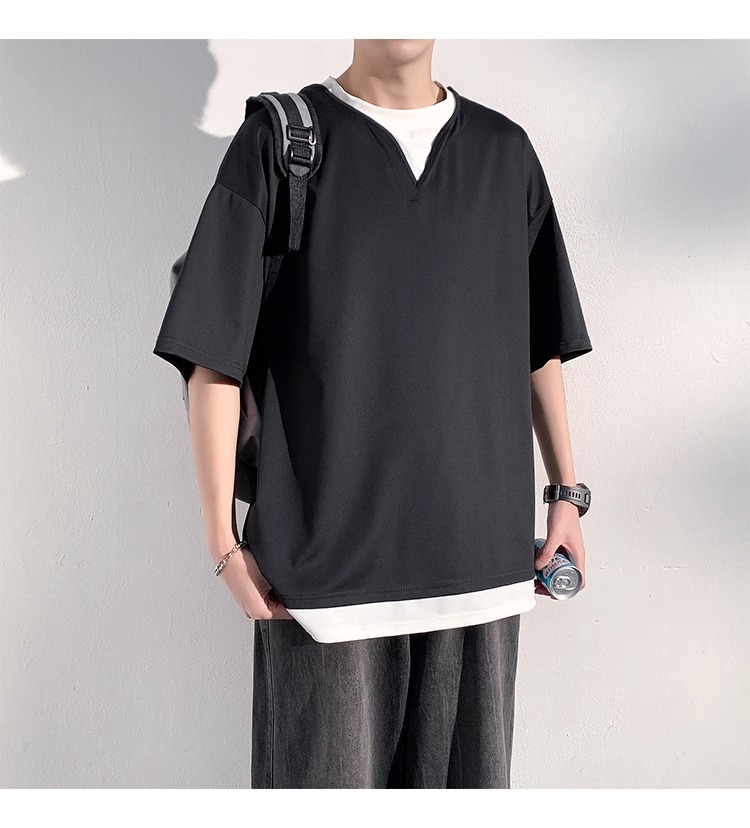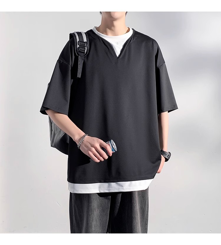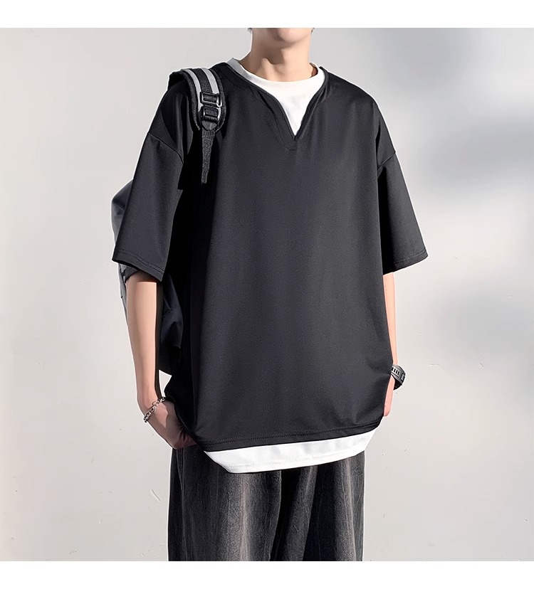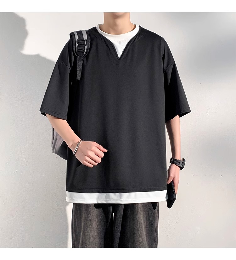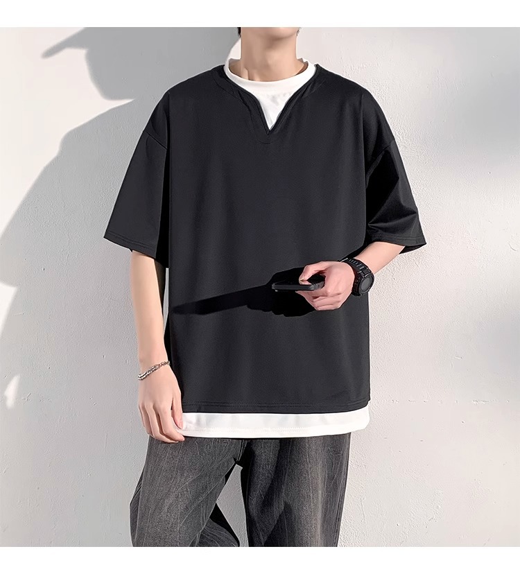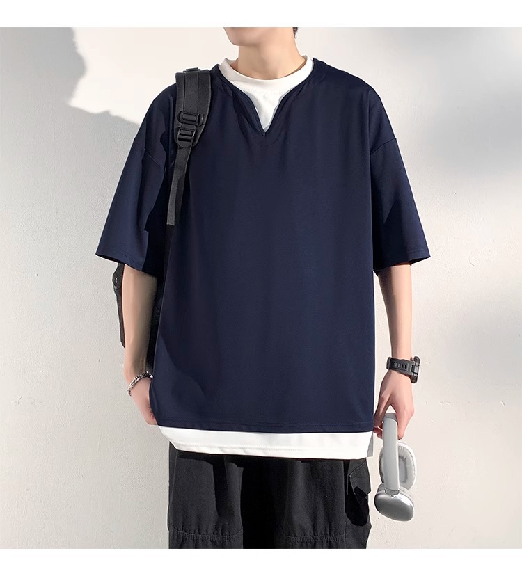 NASA 아이스 실크 반팔 티셔츠 남자 여름 미국 가짜 투피스 티셔츠 루즈 캐주얼 플러스 사이즈 반소매 V 넥 탑