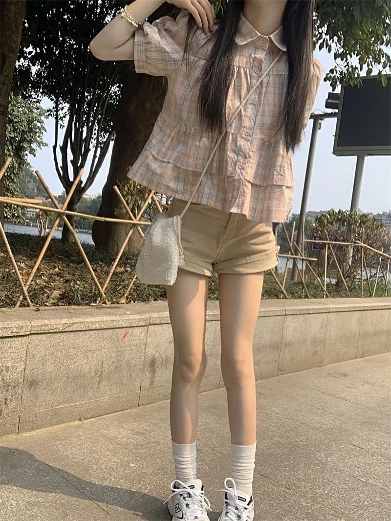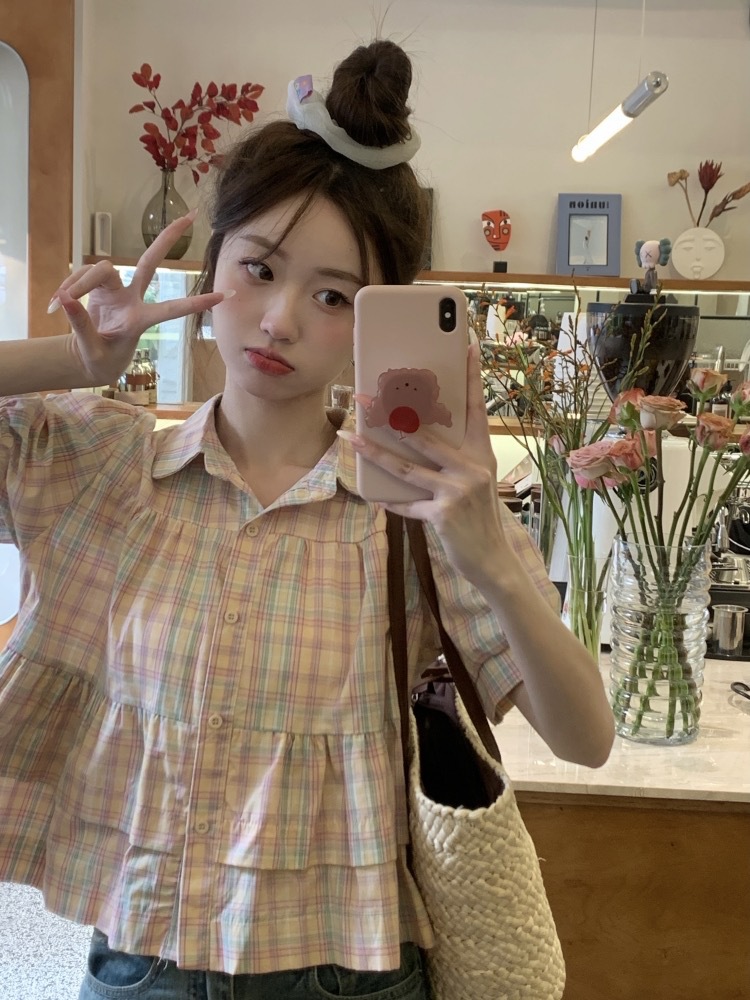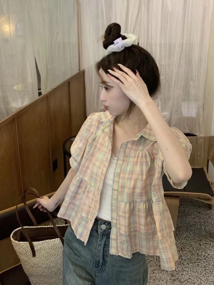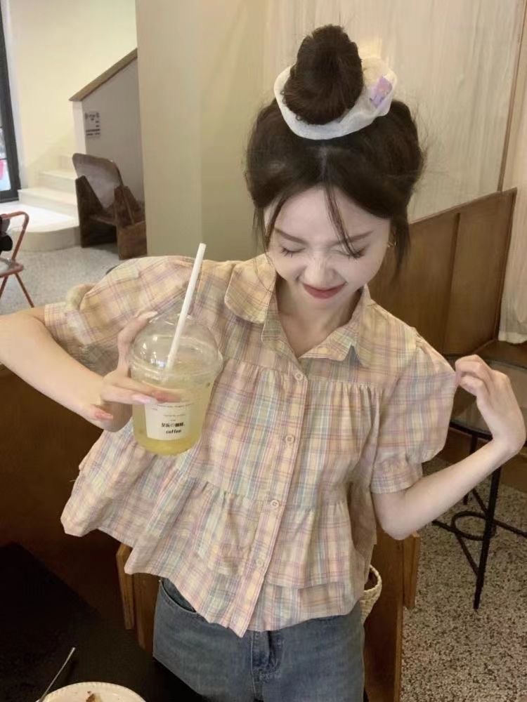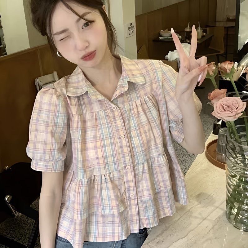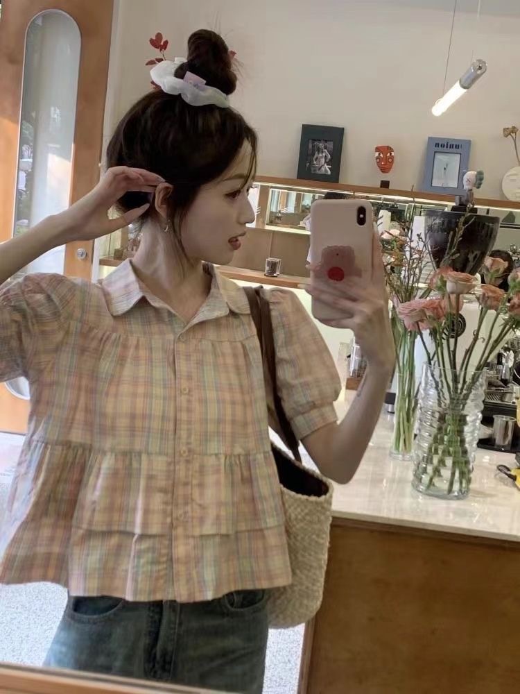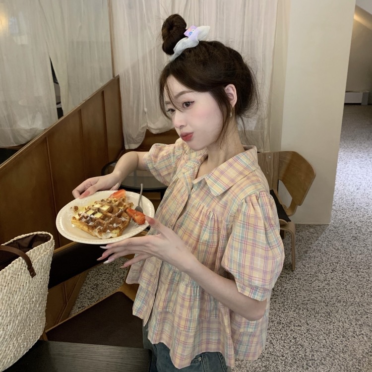 프랑스 달콤한 격자 무늬 인형 반팔 셔츠 여성용 봄과 여름 새로운 디자인 센스 니쉬 셔츠 슬리밍 쇼트 탑스토어 가기