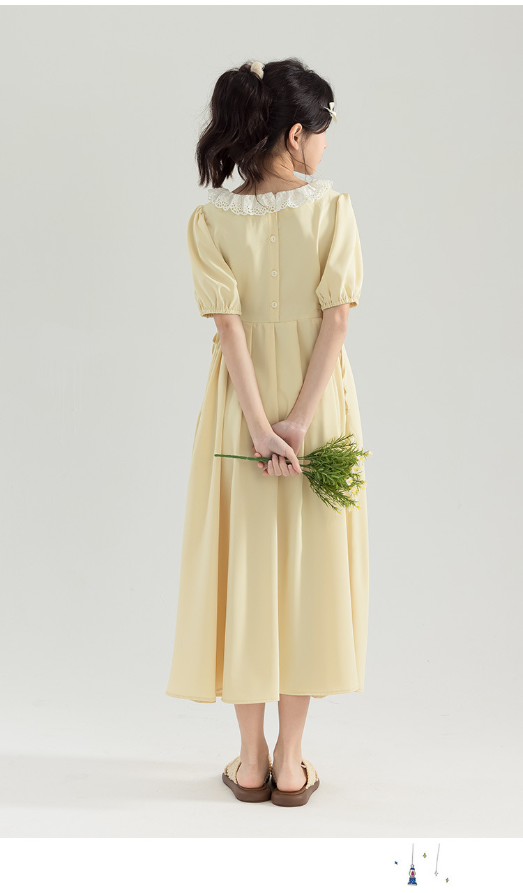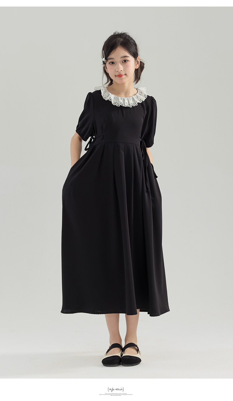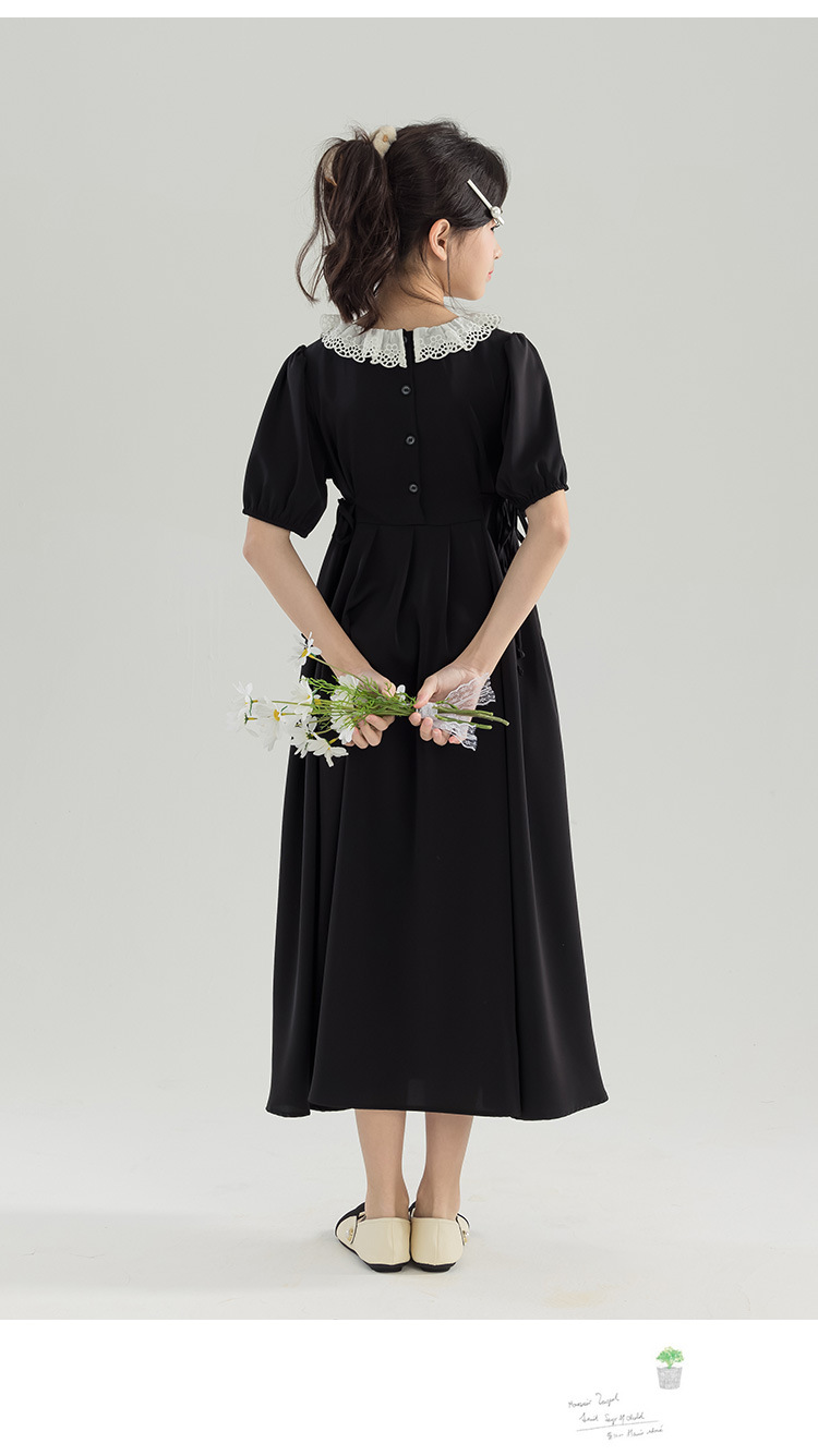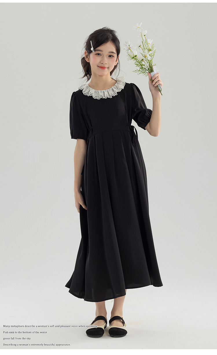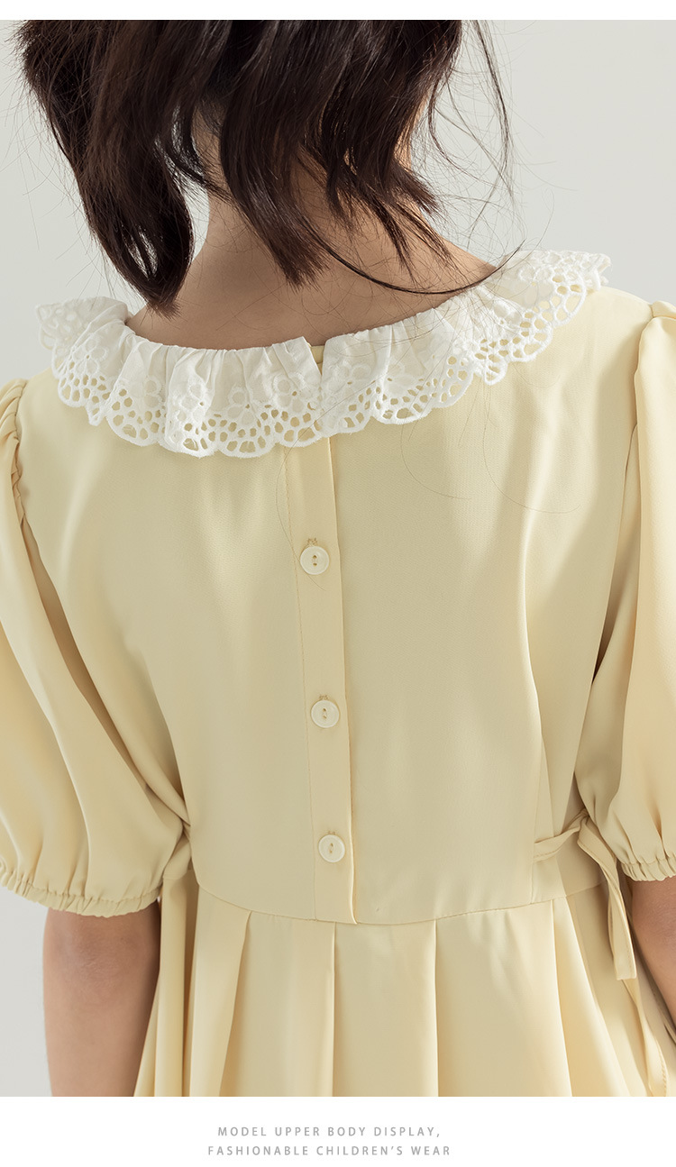 半开门襟,可以正反面两穿,撞色的花边领子,甜美更有层次感。泡泡袖修饰手臂的线条,更显纤细。腰侧有系带,可以调节腰身大小,收腰显瘦更显气质。(建议穿亲子装)