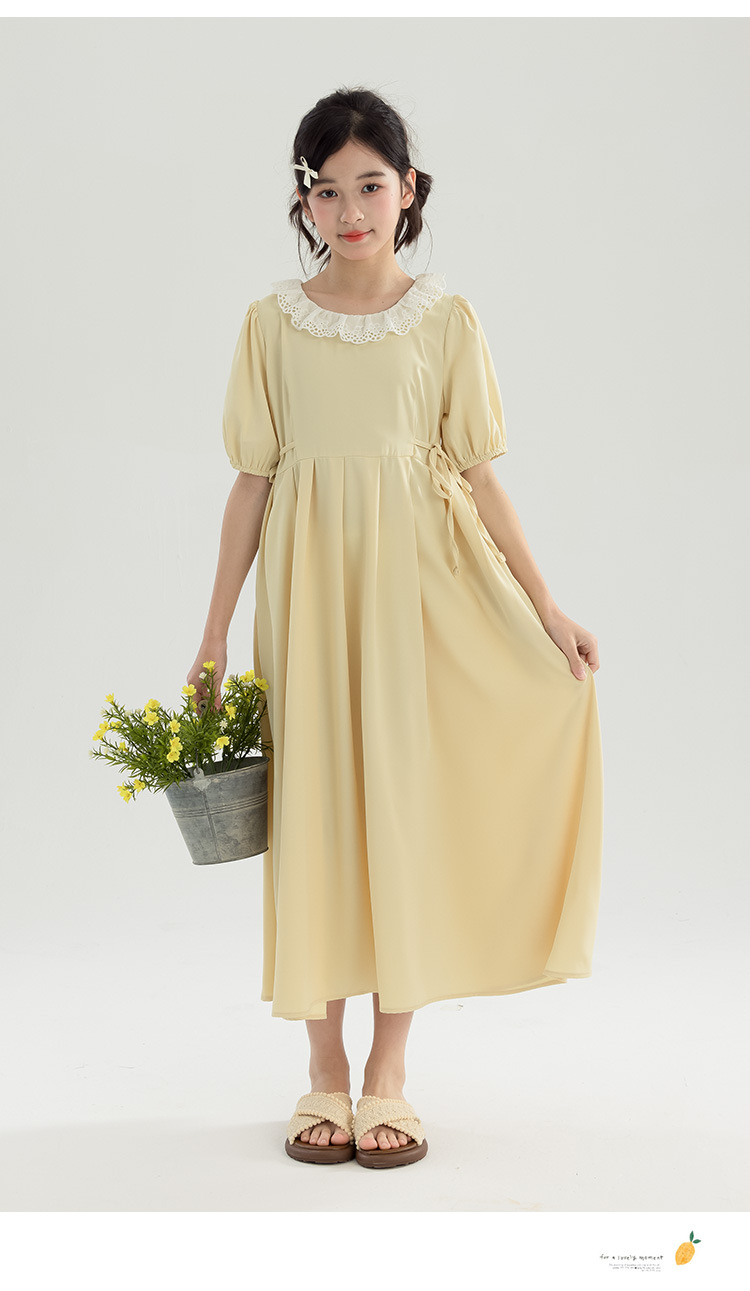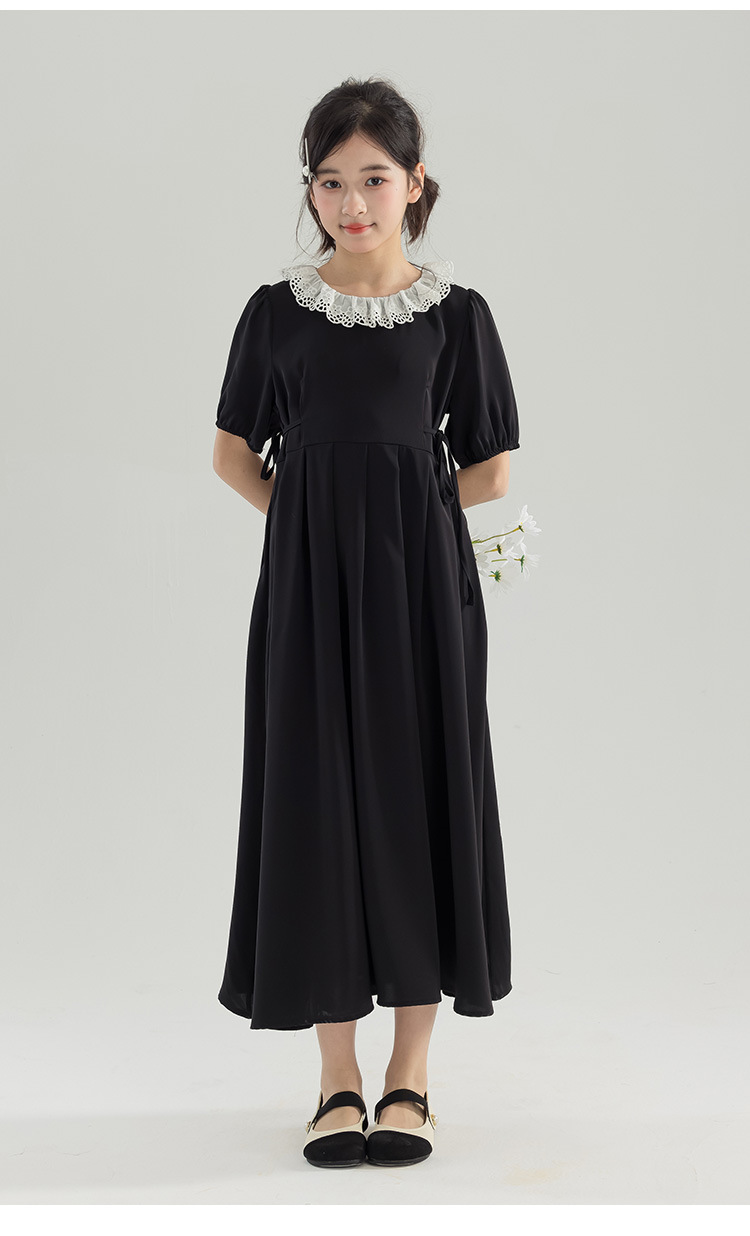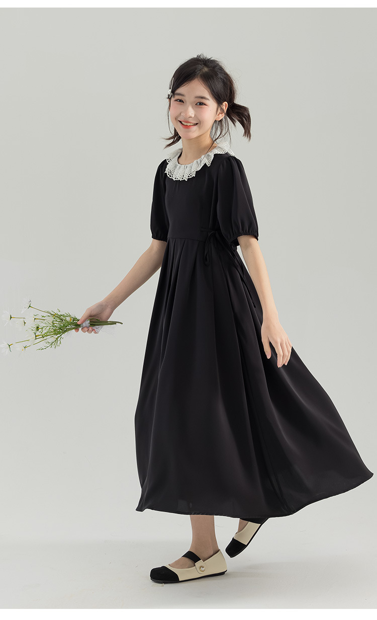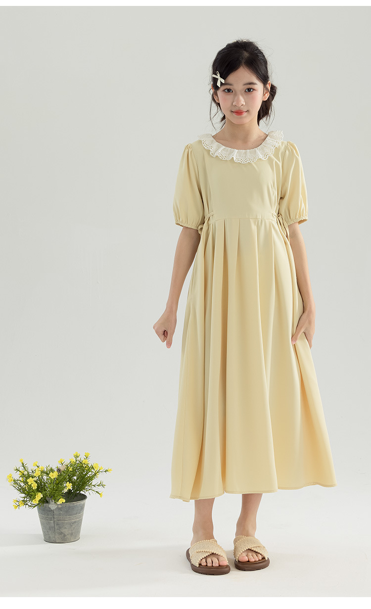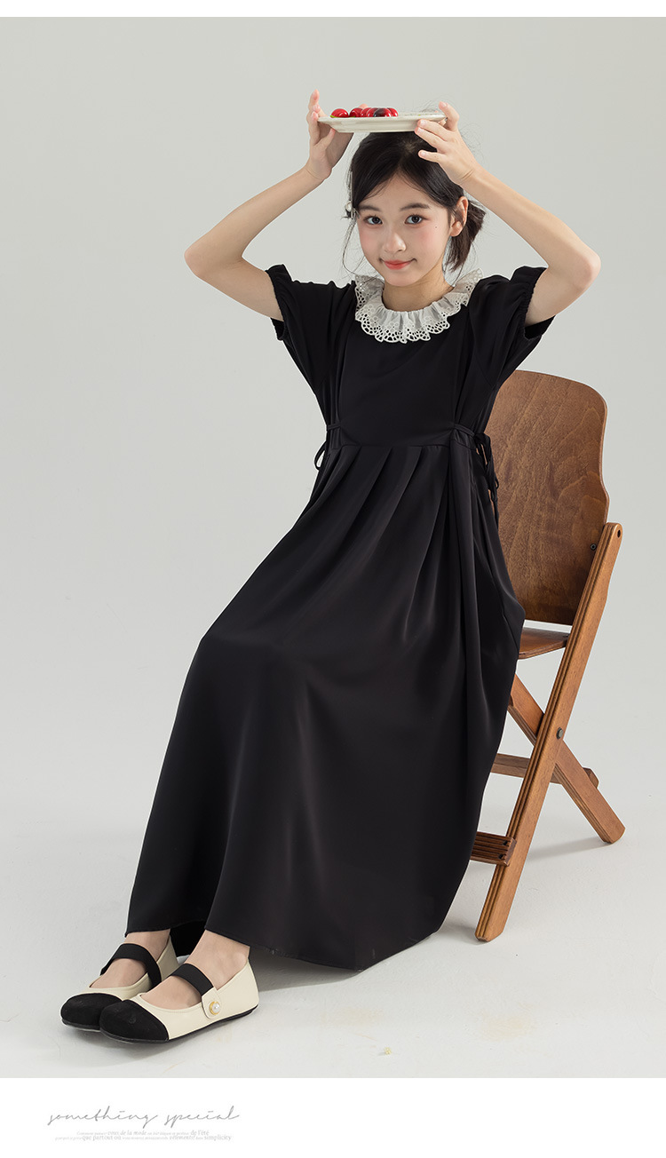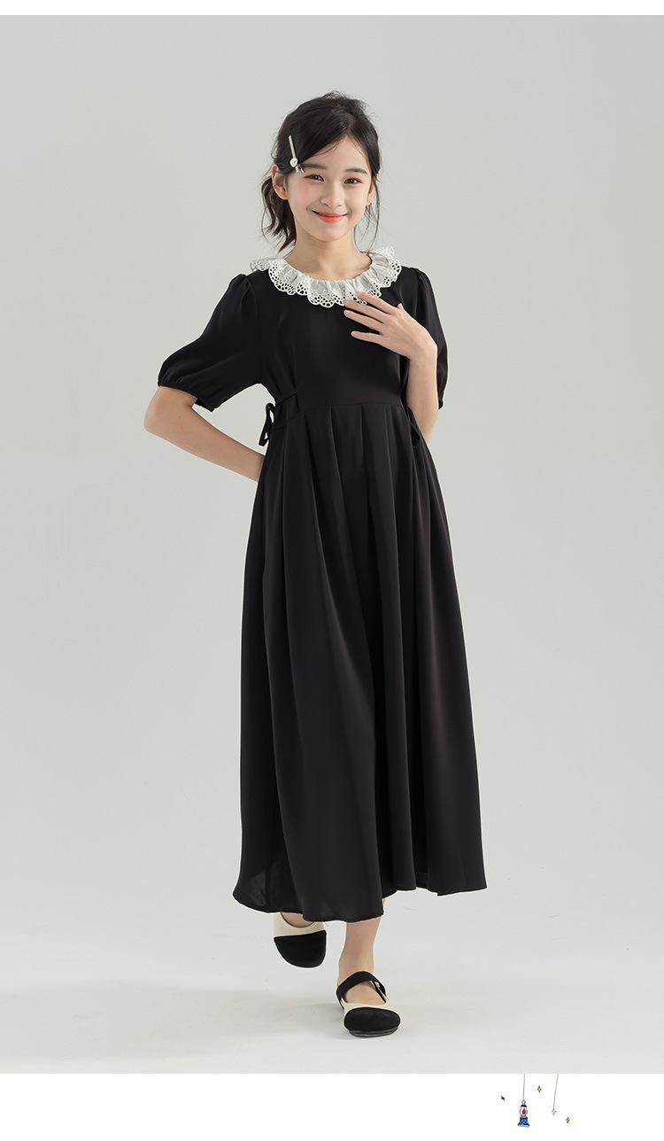 半开门襟,可以正反面两穿,撞色的花边领子,甜美更有层次感。泡泡袖修饰手臂的线条,更显纤细。腰侧有系带,可以调节腰身大小,收腰显瘦更显气质。(建议穿亲子装)