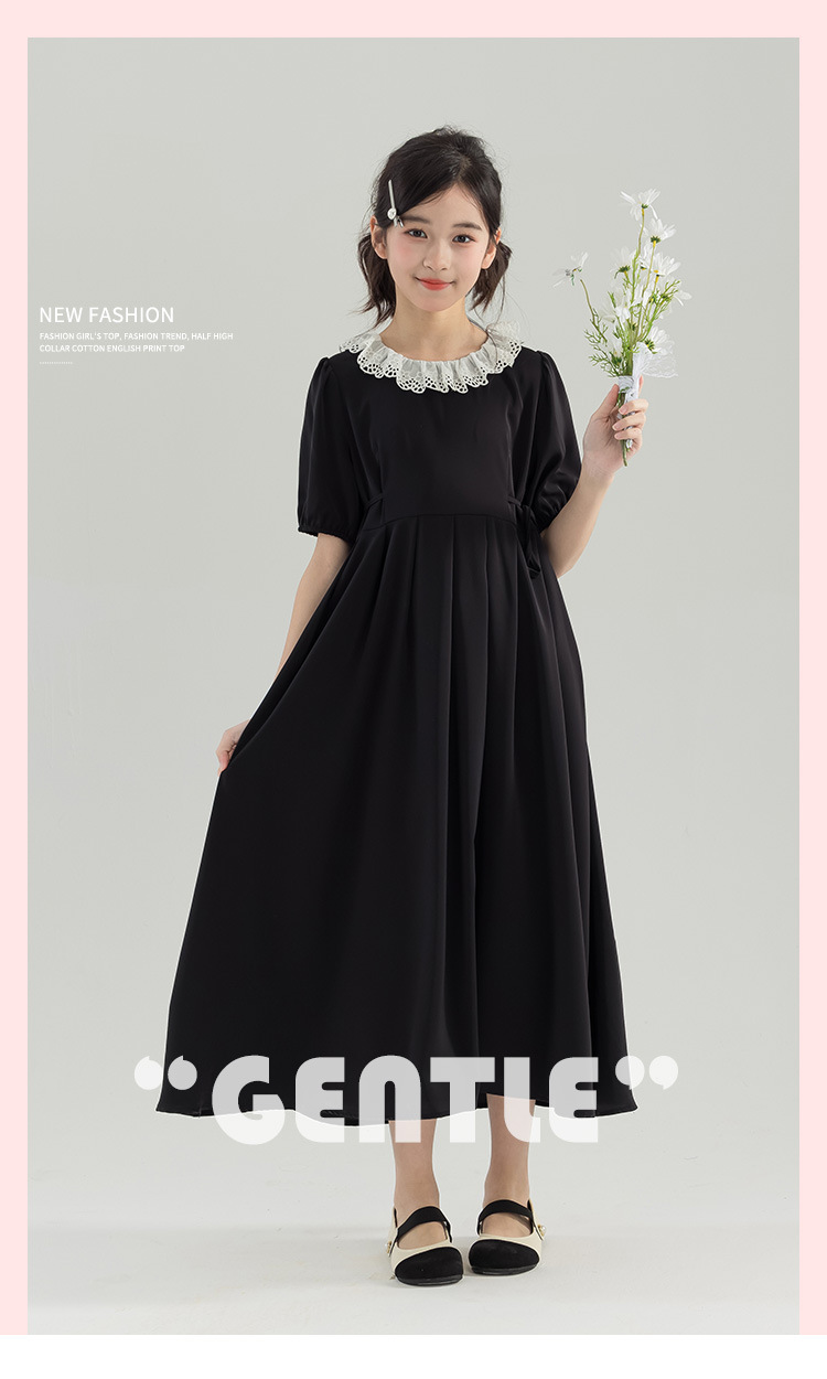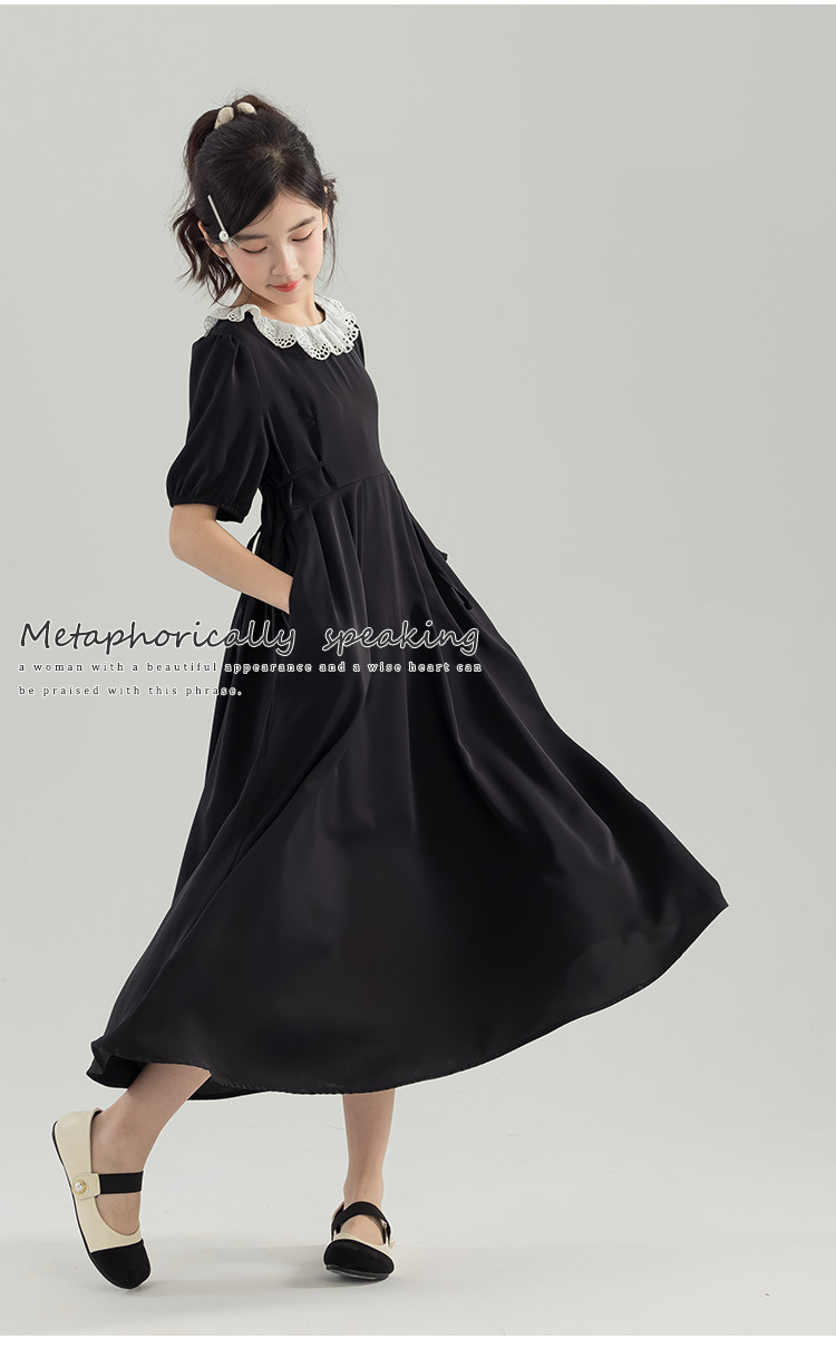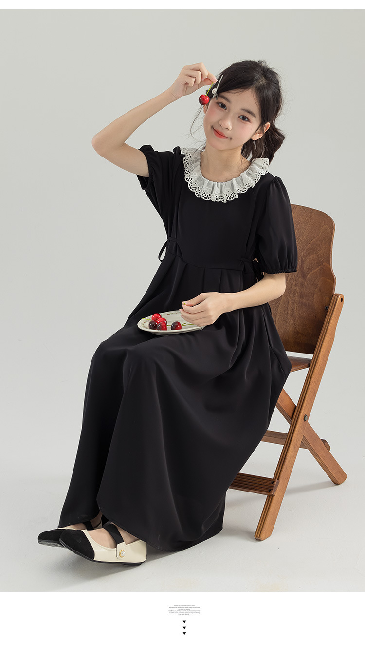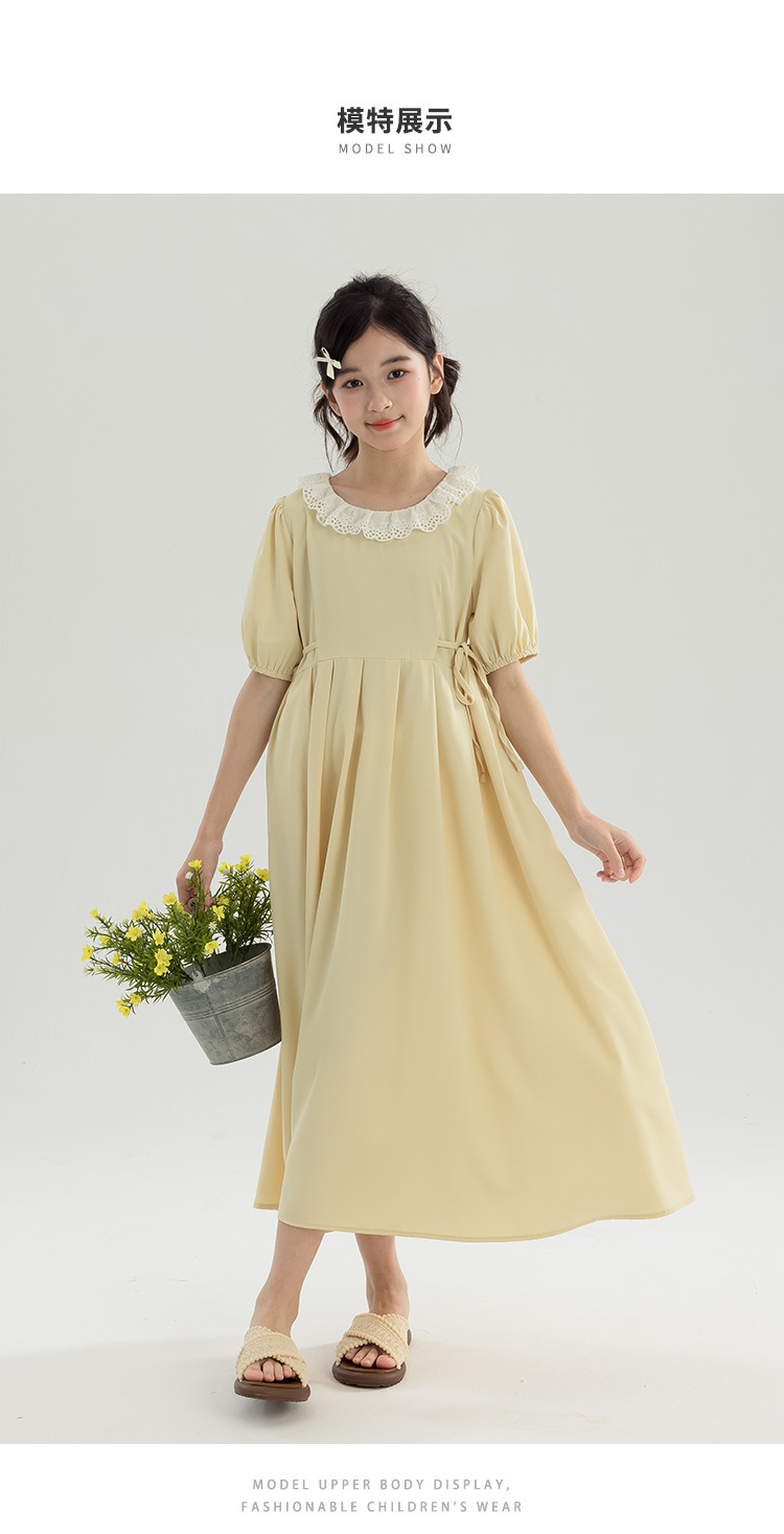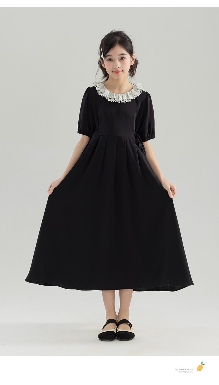 半开门襟,可以正反面两穿,撞色的花边领子,甜美更有层次感。泡泡袖修饰手臂的线条,更显纤细。腰侧有系带,可以调节腰身大小,收腰显瘦更显气质。(建议穿亲子装)