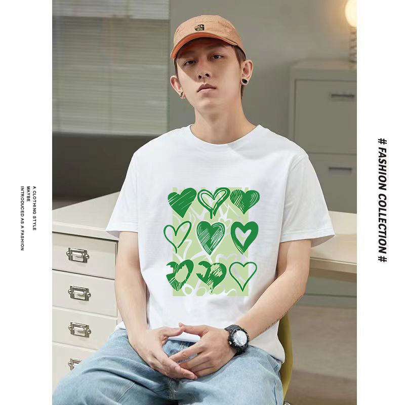• 홍콩 스타일 아이스 실크 반팔 흰색 녹색 손으로 그린 ​​사랑