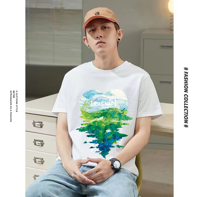 • 홍콩 스타일 얼음 실크 반팔 흰색 유화 녹색 들판 나무