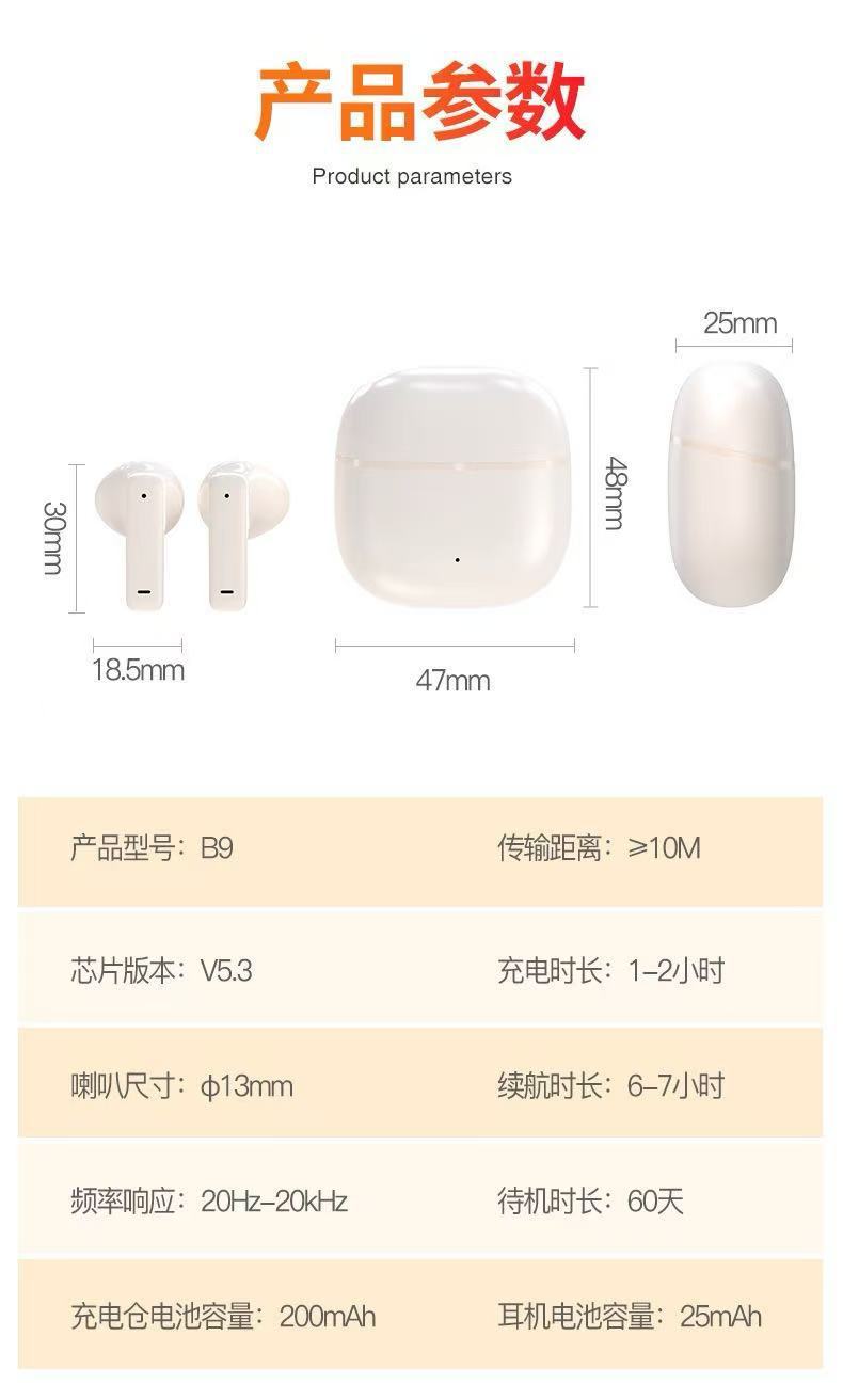 국경을 넘는 신제품 B9 진정한 무선 블루투스 이어폰 반인이어형 음악 스포츠 게임 통화 소음 감소 블루투스 5.3