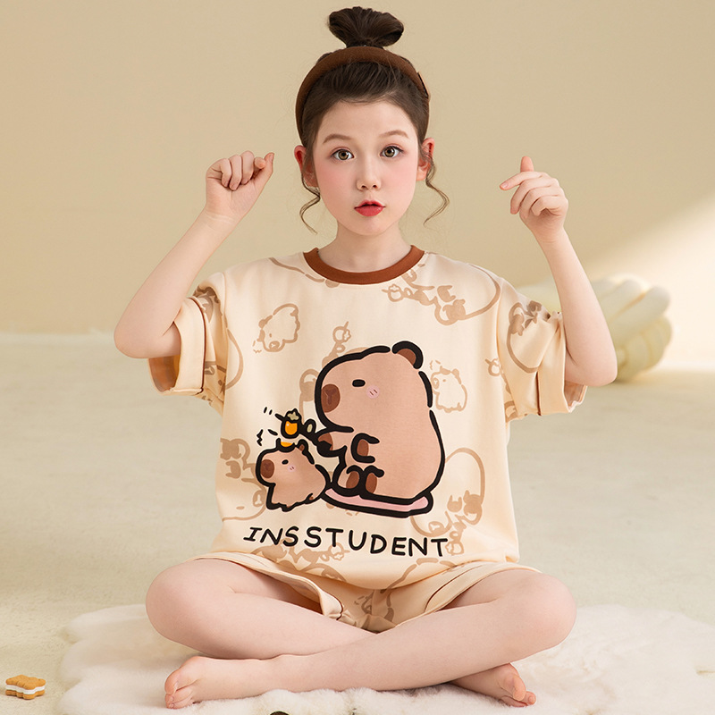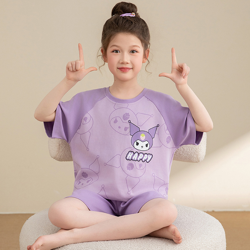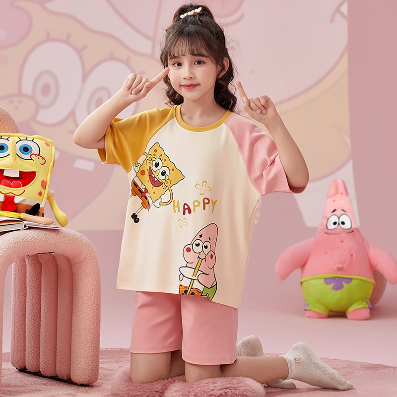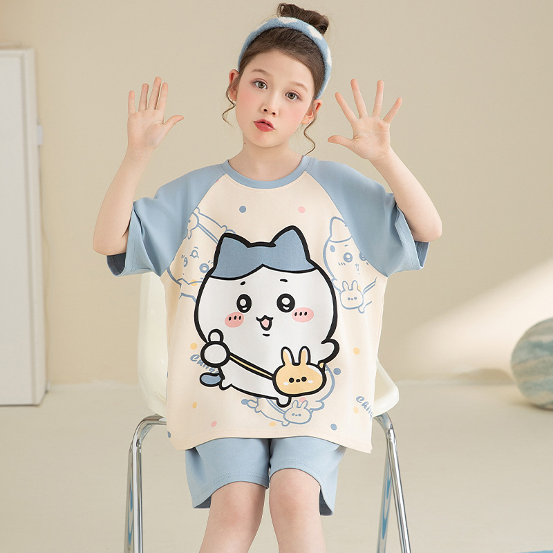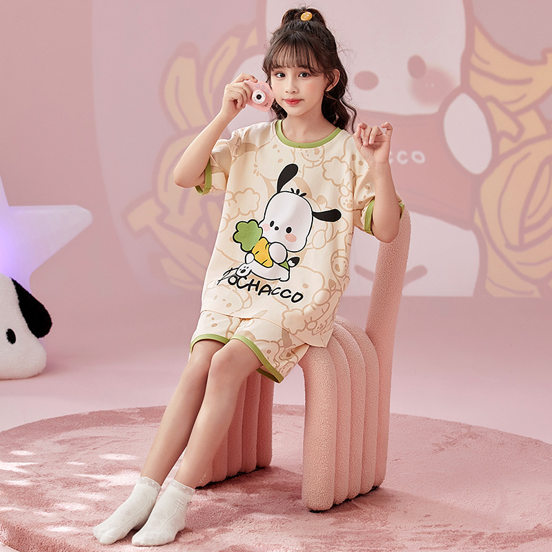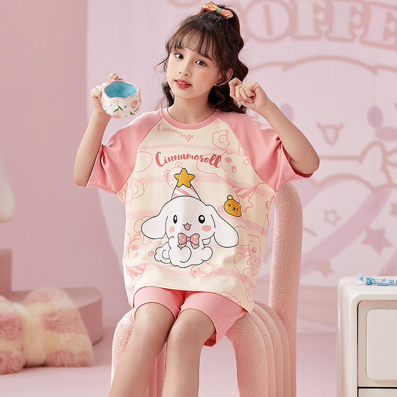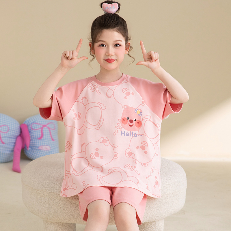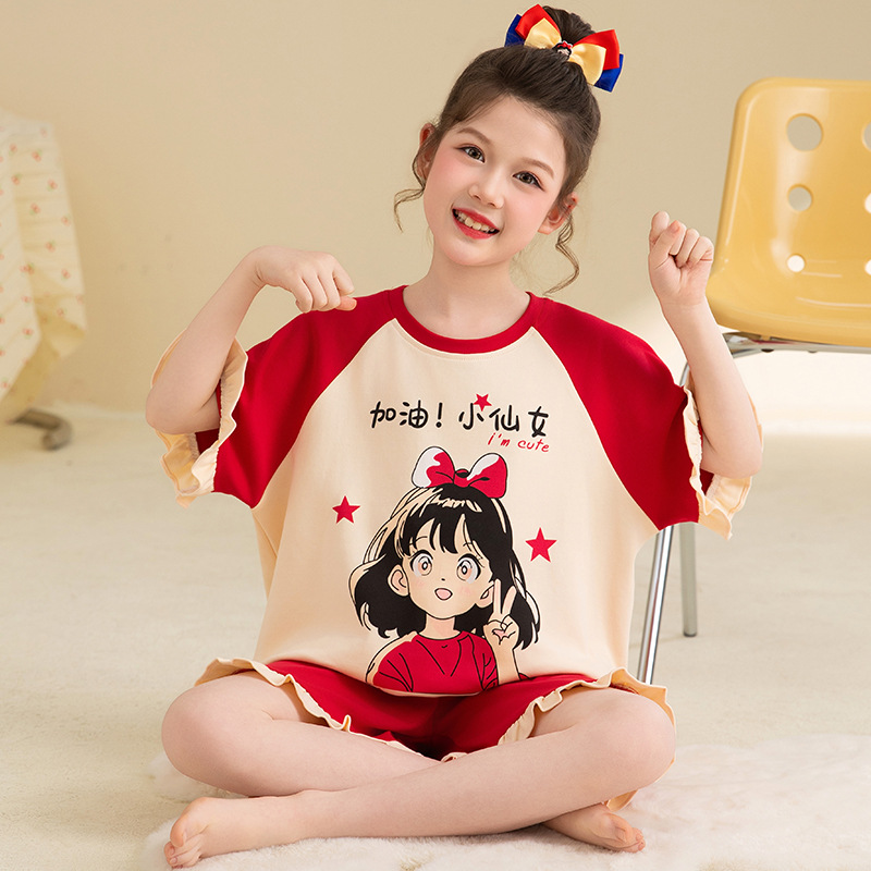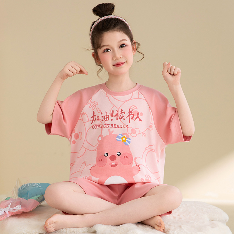 여름 어린이 순면 잠옷 소녀의 여름 얇은 반팔 세트 중대형 어린이 만화 소녀의 집 옷