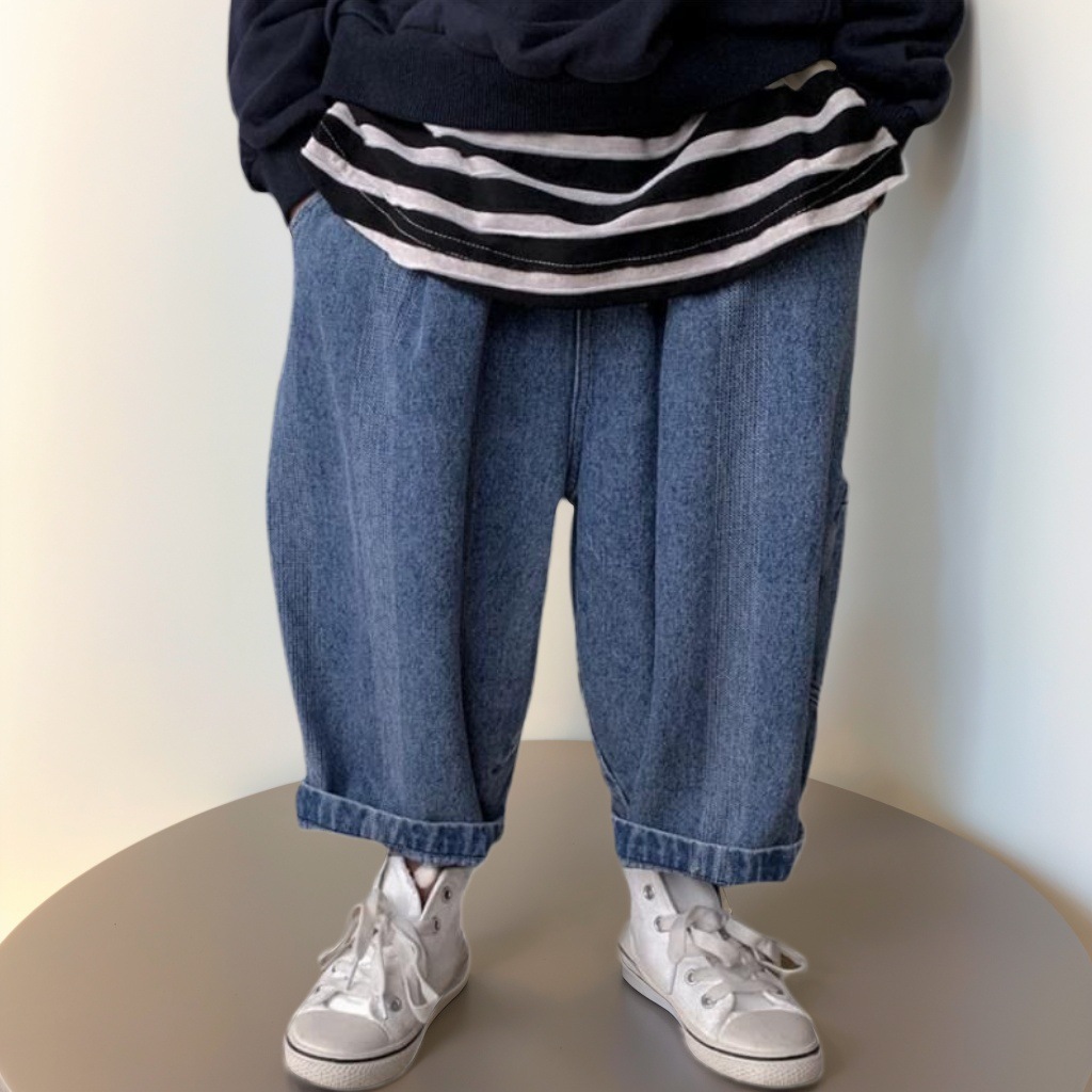 소년의 봄과 가을 새로운 밝은 색 데님 스트레이트 다리 바지 어린이 서양식 유행 넓은 다리 캐주얼 자른 바지스토어 가기