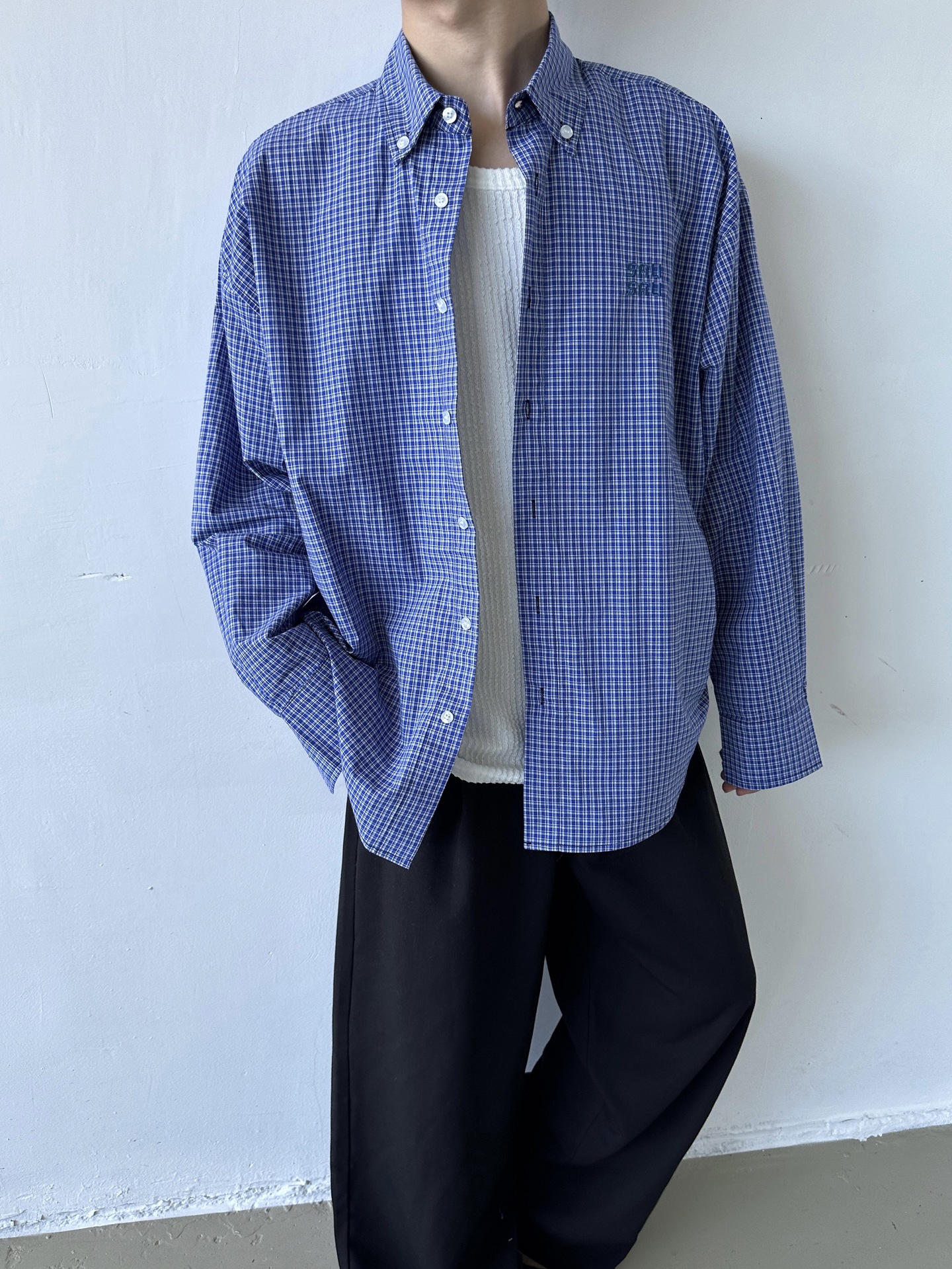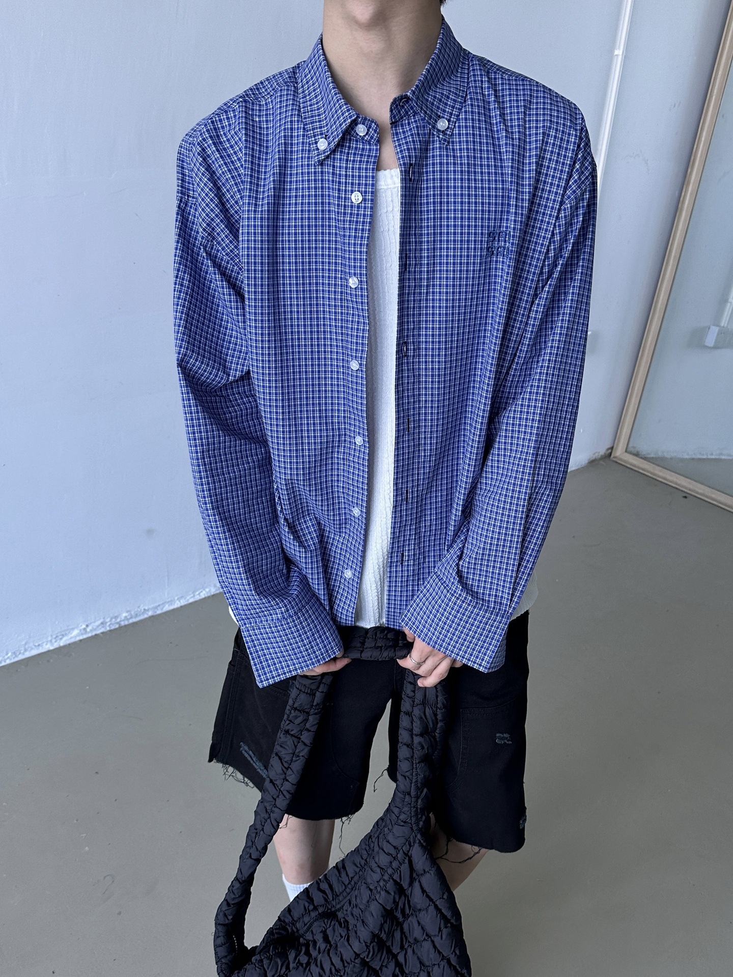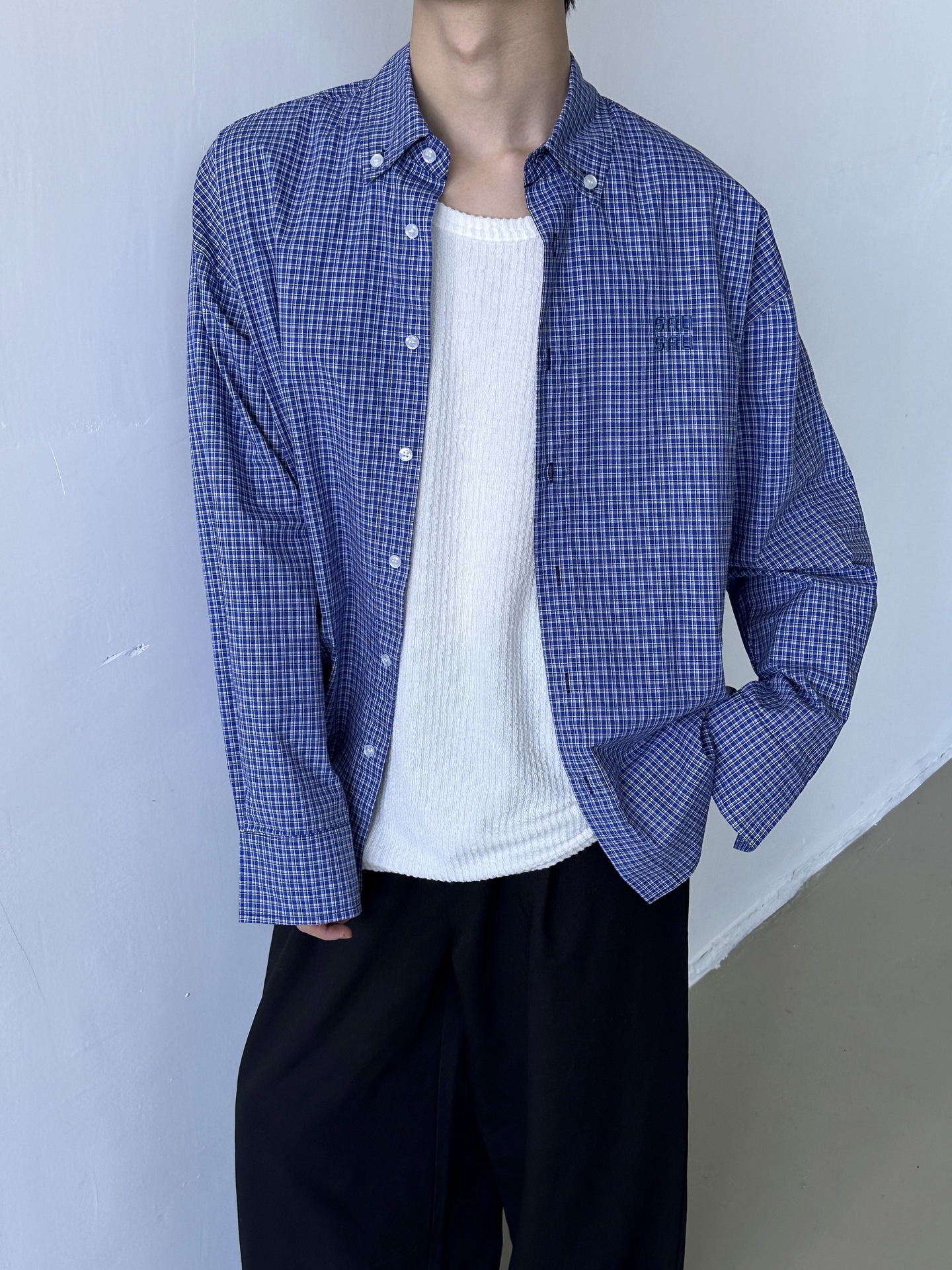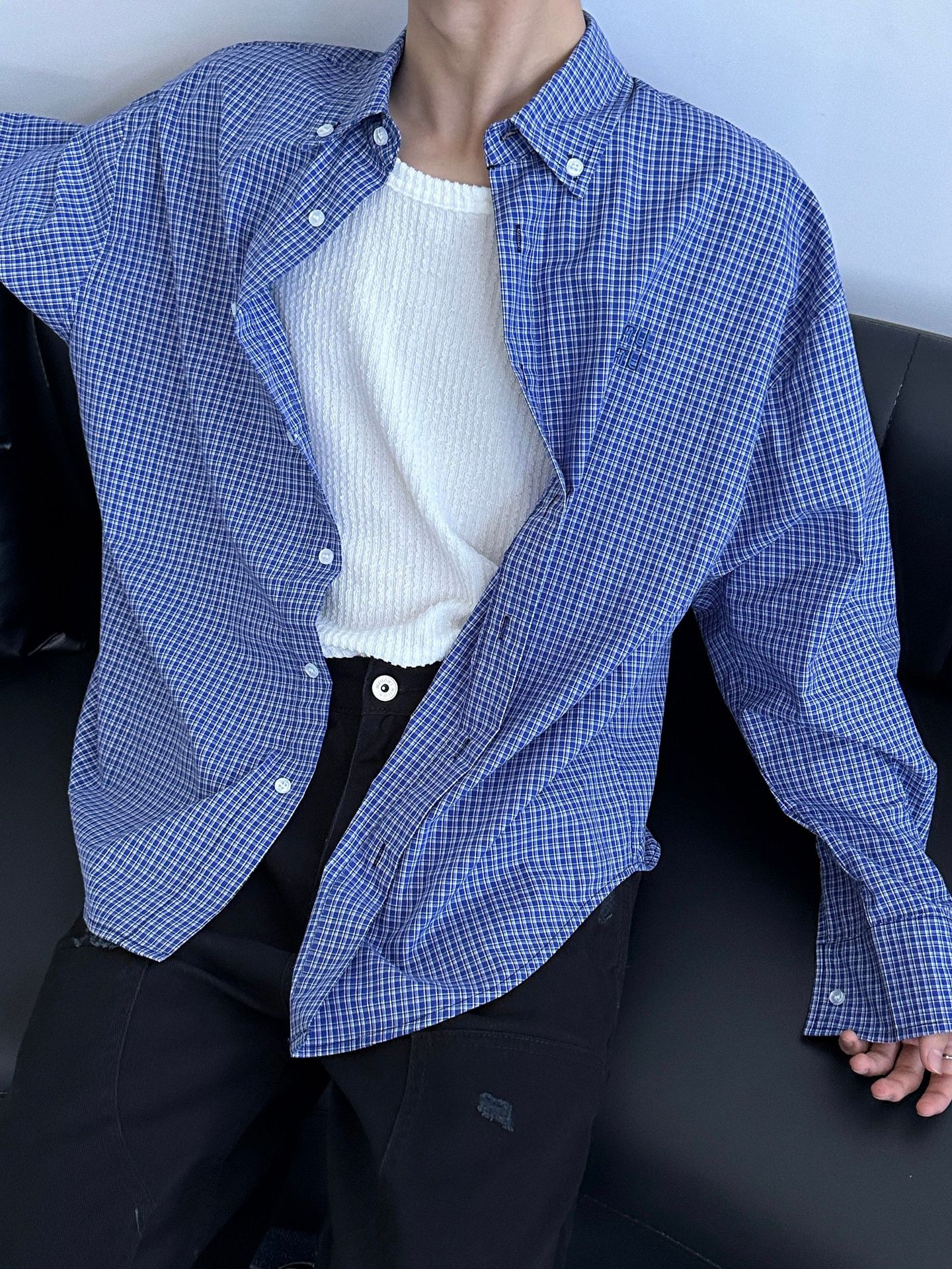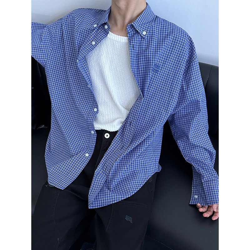 아메리칸 레트로 게으른 느슨한 블루 격자 무늬 긴팔 셔츠 남자 2024 년 새로운 올 매치 캐주얼 자수 셔츠 트렌디스토어 가기