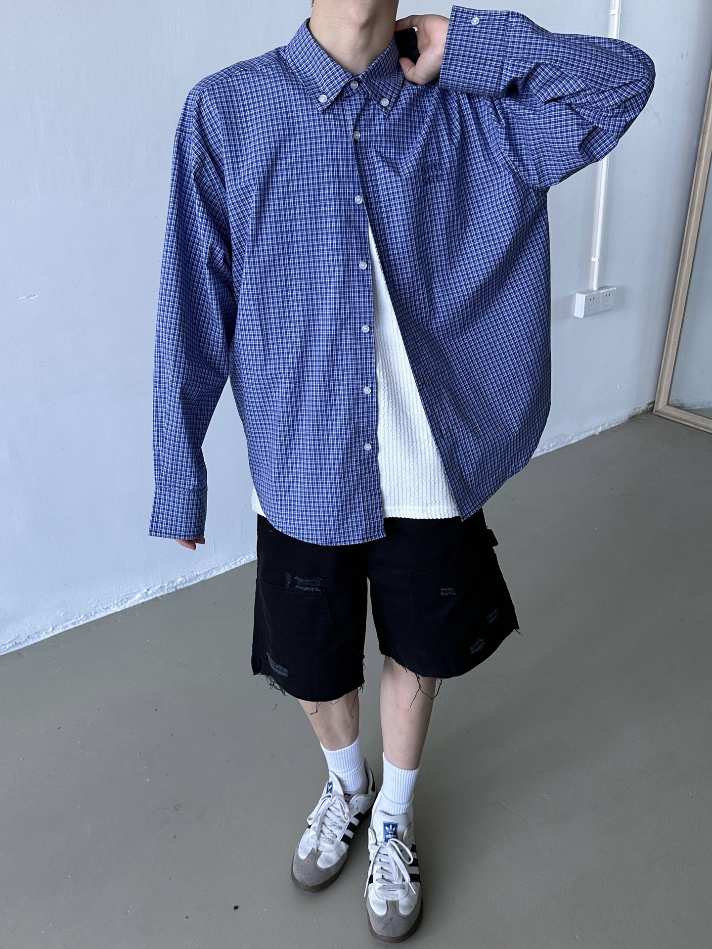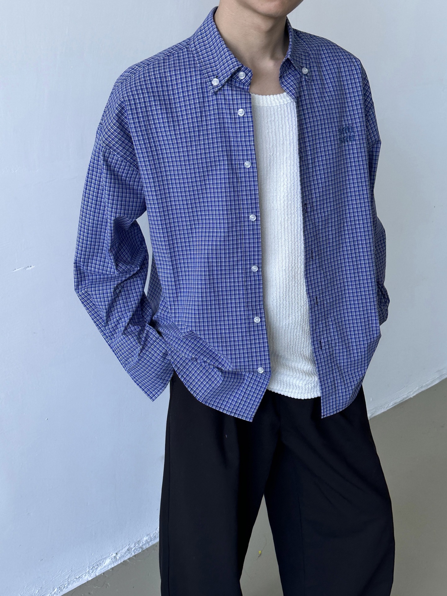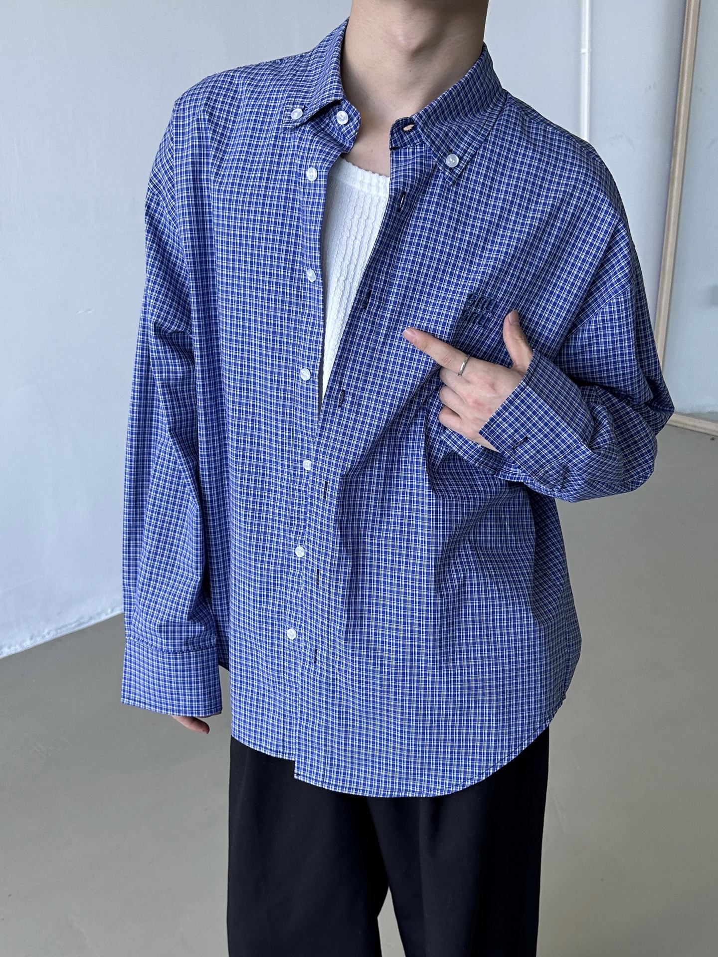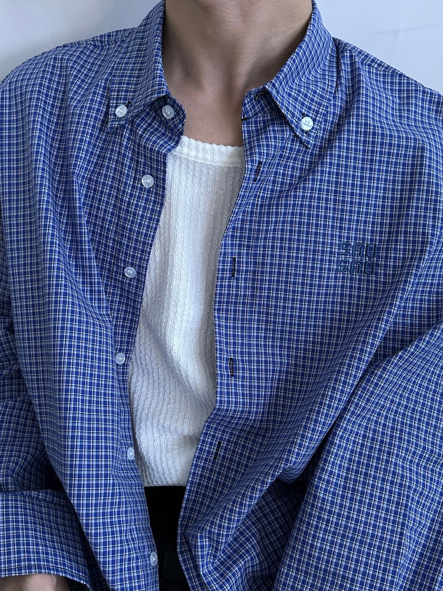 아메리칸 레트로 게으른 느슨한 블루 격자 무늬 긴팔 셔츠 남자 2024 년 새로운 올 매치 캐주얼 자수 셔츠 트렌디스토어 가기