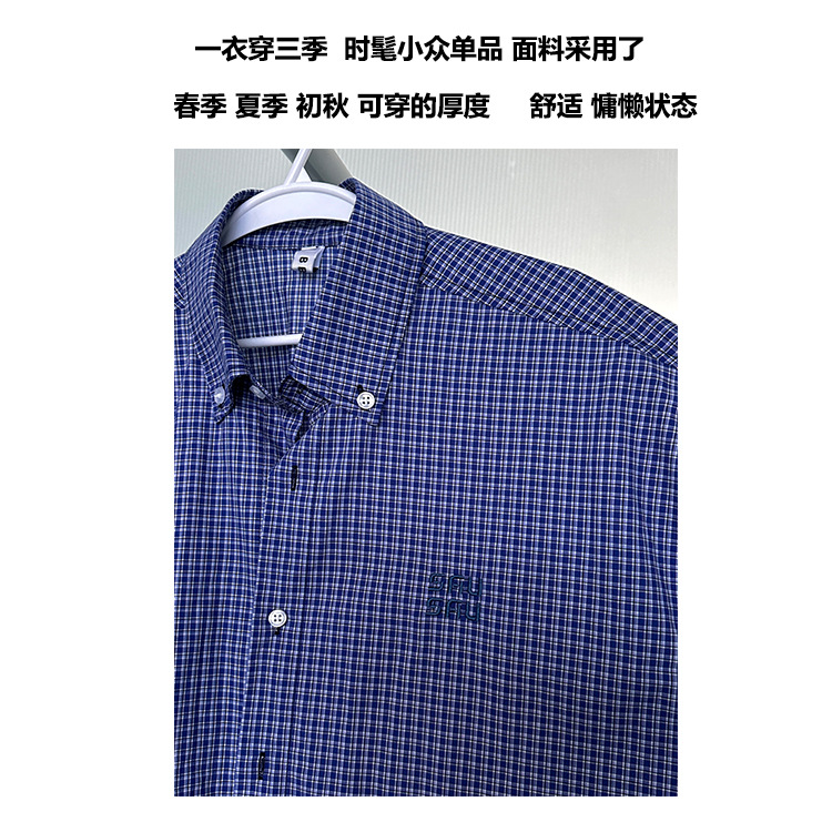 아메리칸 레트로 게으른 느슨한 블루 격자 무늬 긴팔 셔츠 남자 2024 년 새로운 올 매치 캐주얼 자수 셔츠 트렌디